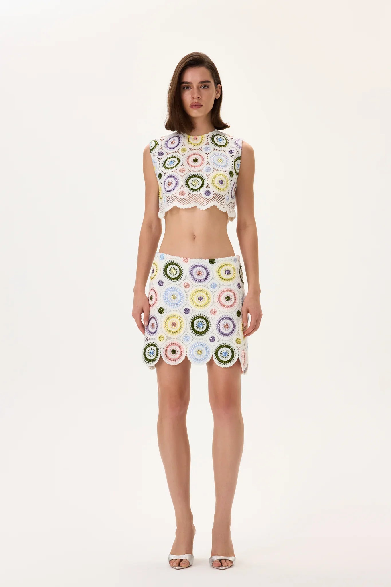 Crochet Pastel Multi Color Crystal Printed Mini Skirt With Stones