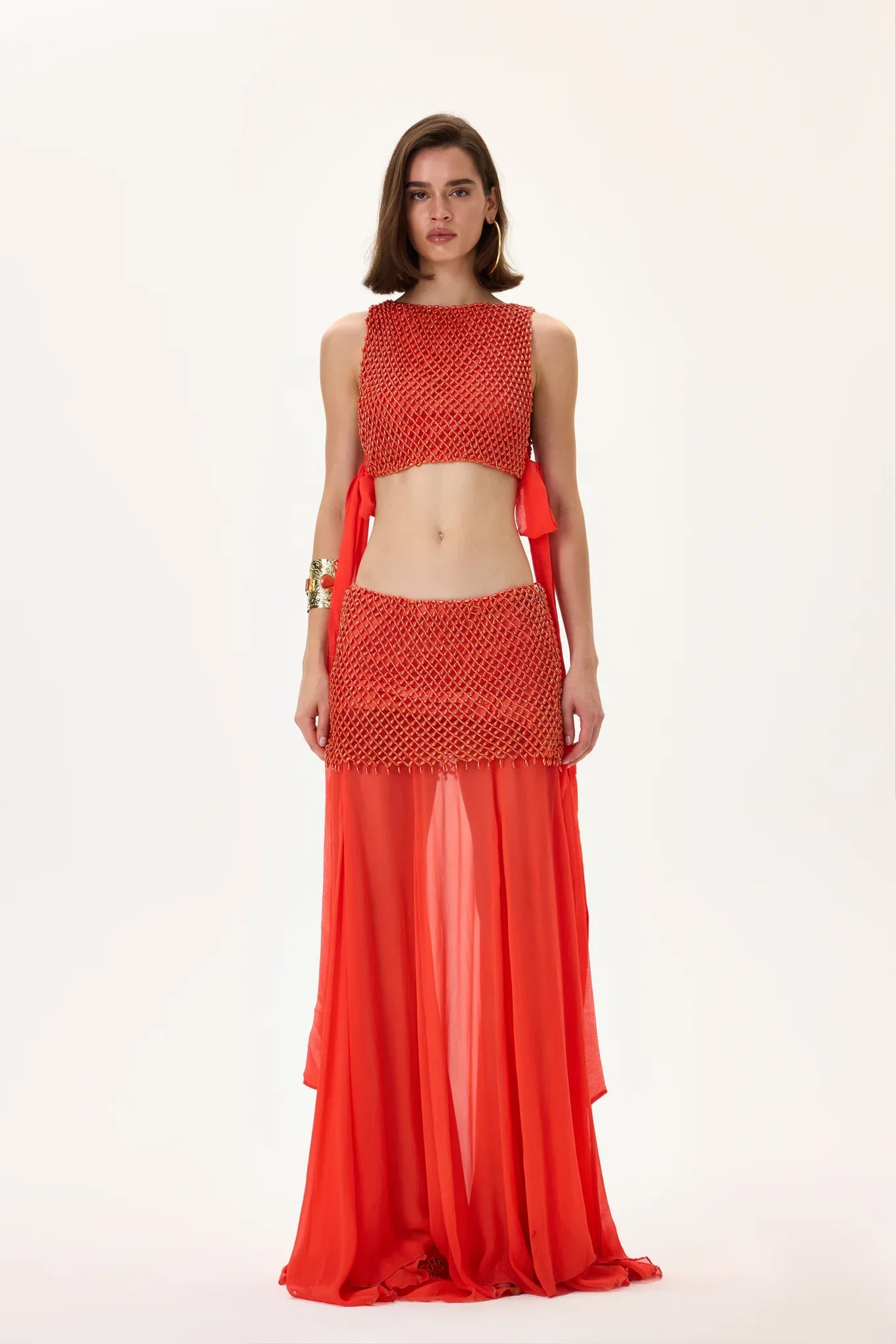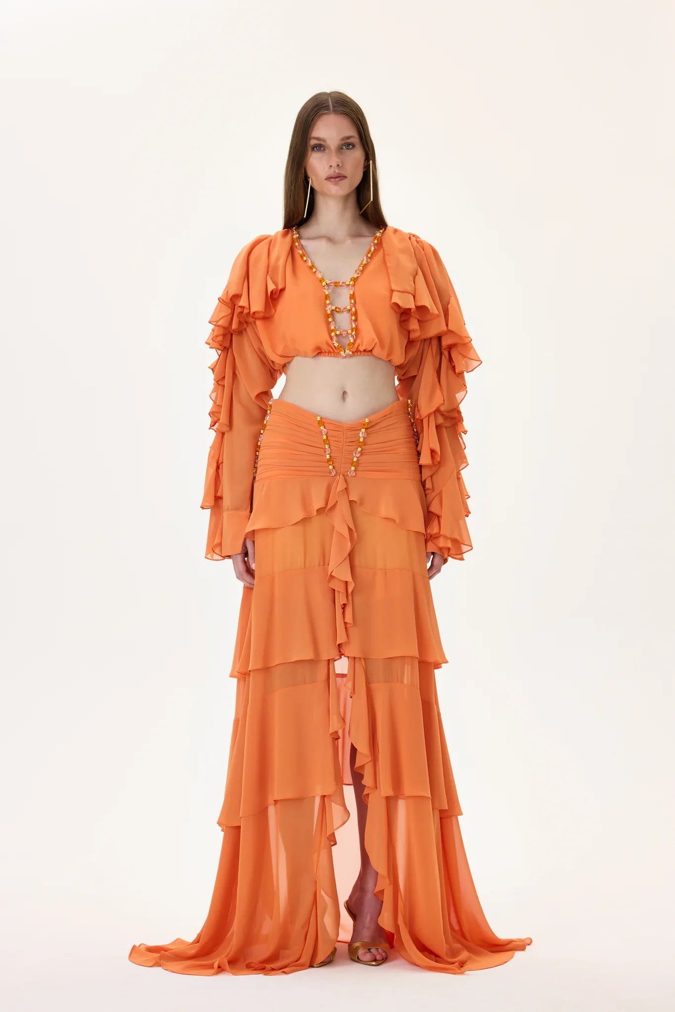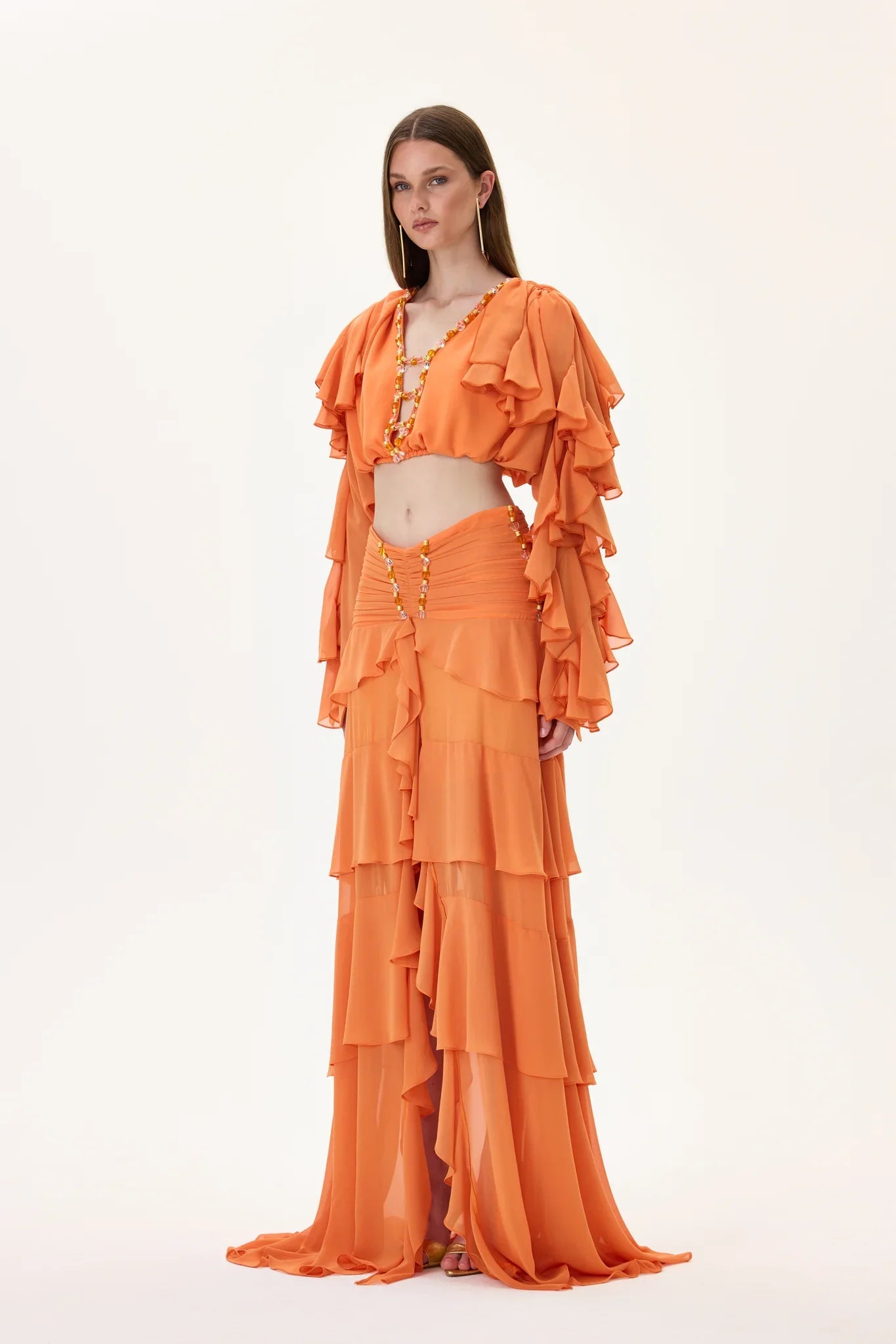 Orange Chiffon Ruffled Skirt with Ruched Waistline and Beadings