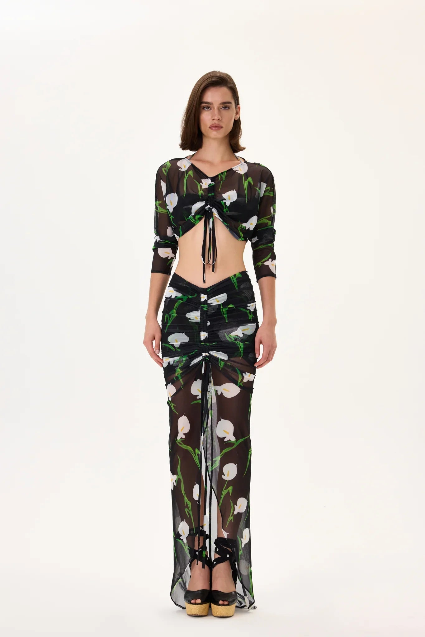 Flower Patterned Gathered Chiffon Skirt With Front Slit