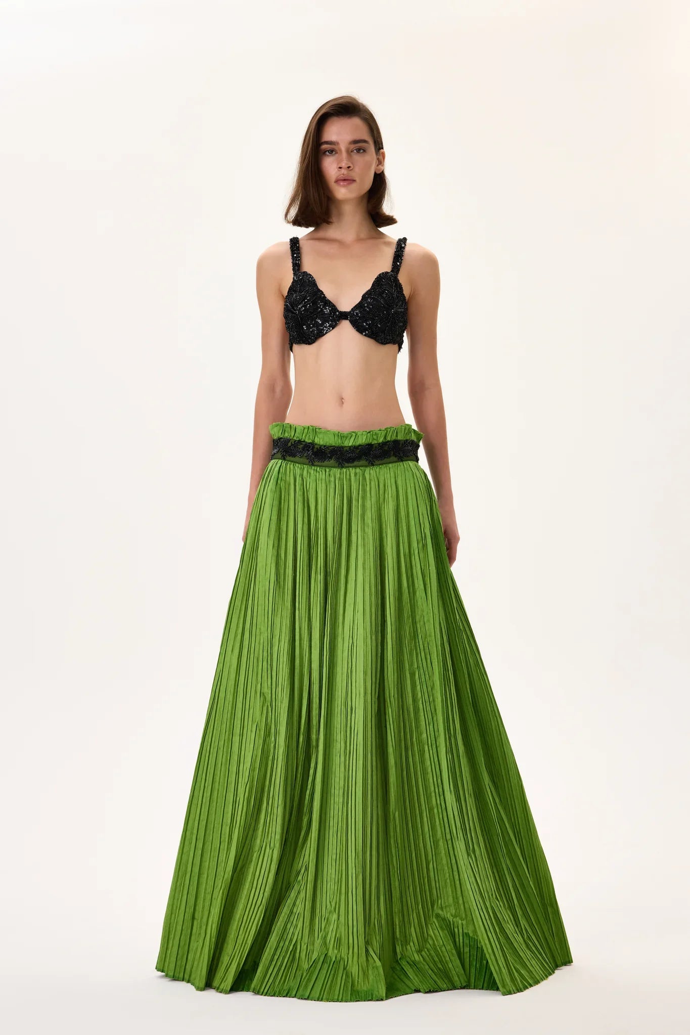 Green Silk Shantung Pleated Maxi Skirt With Beaded Leaf Motive Strip Belt