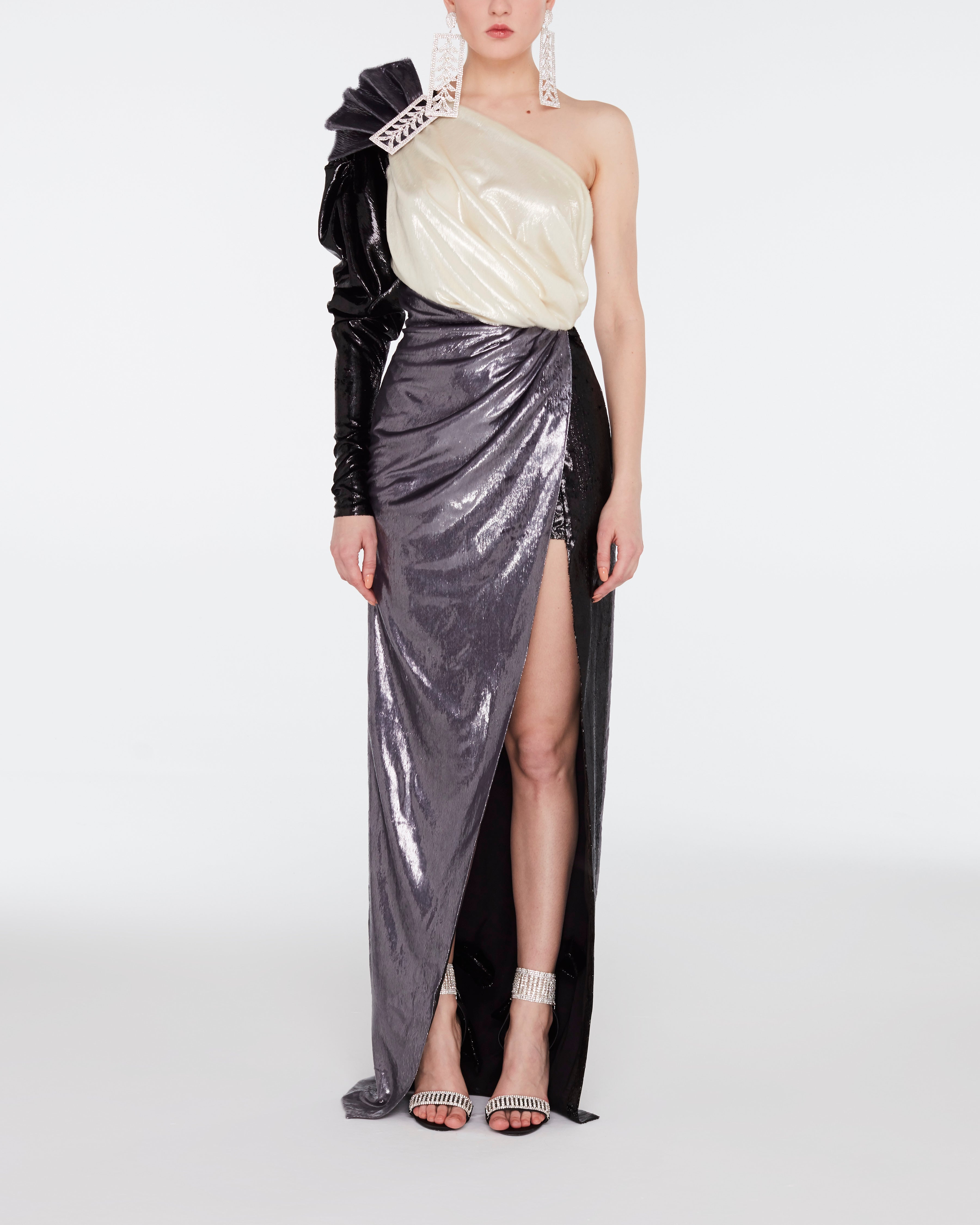 V-Neck Grey Side Open Maxi Dress with Ecose Crystal Stone and High Slit Detail