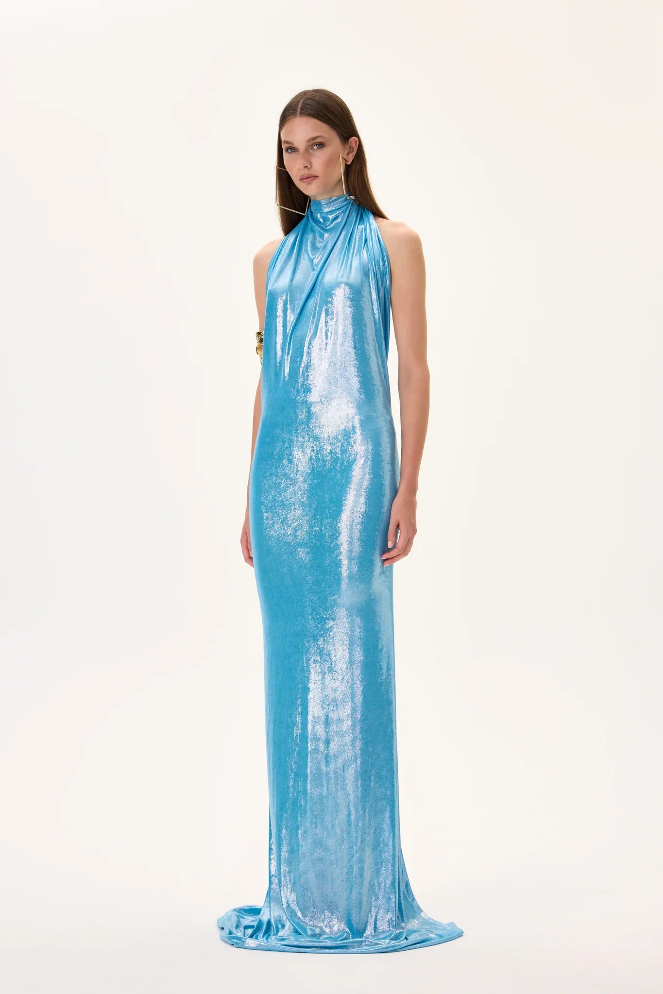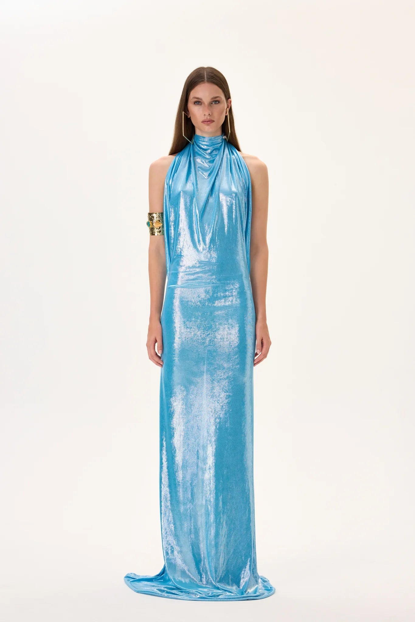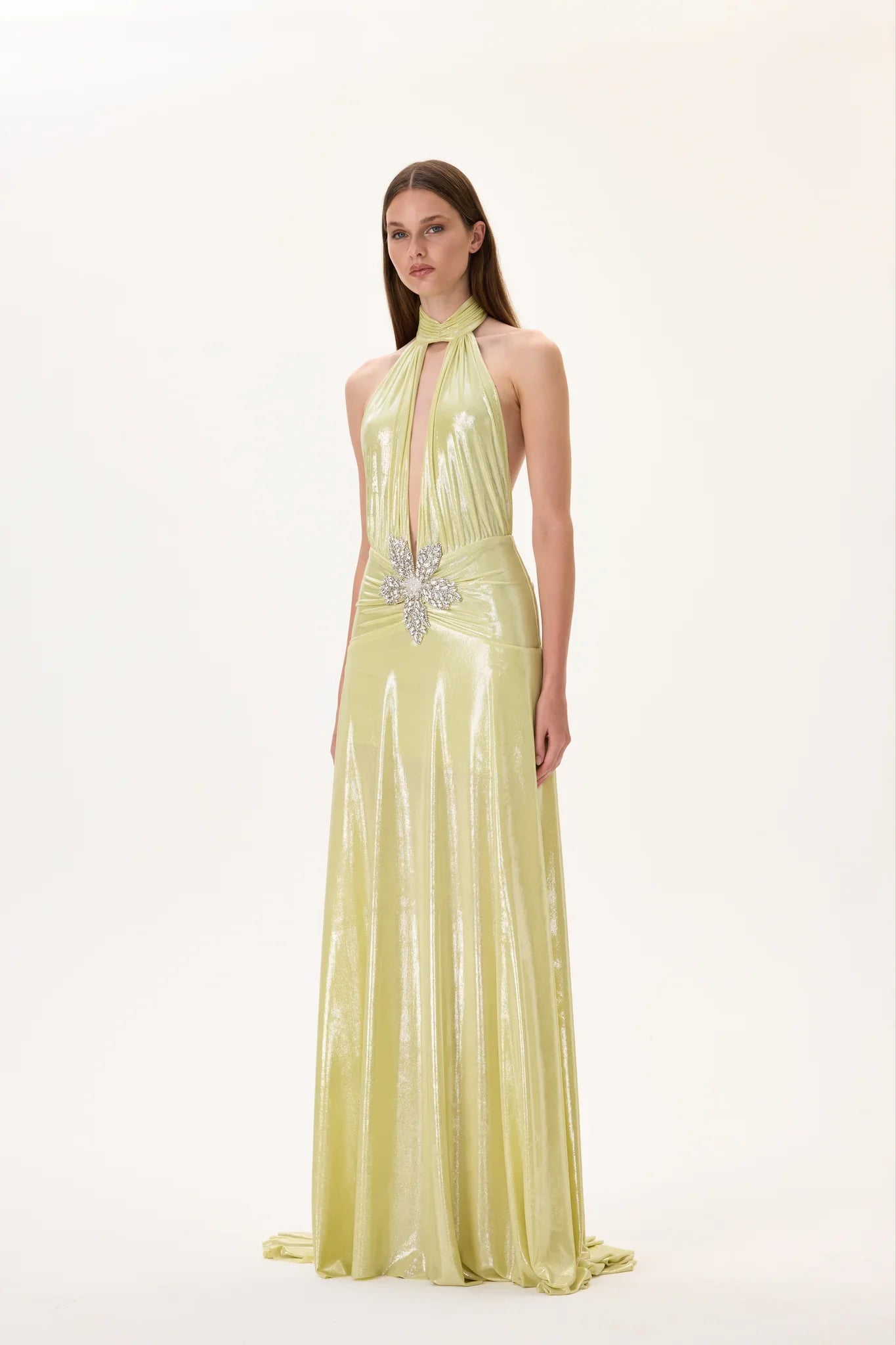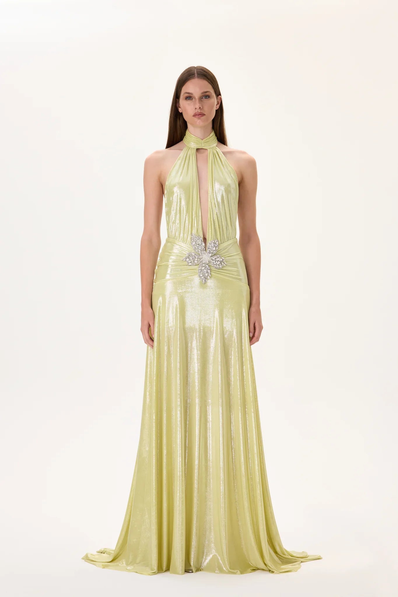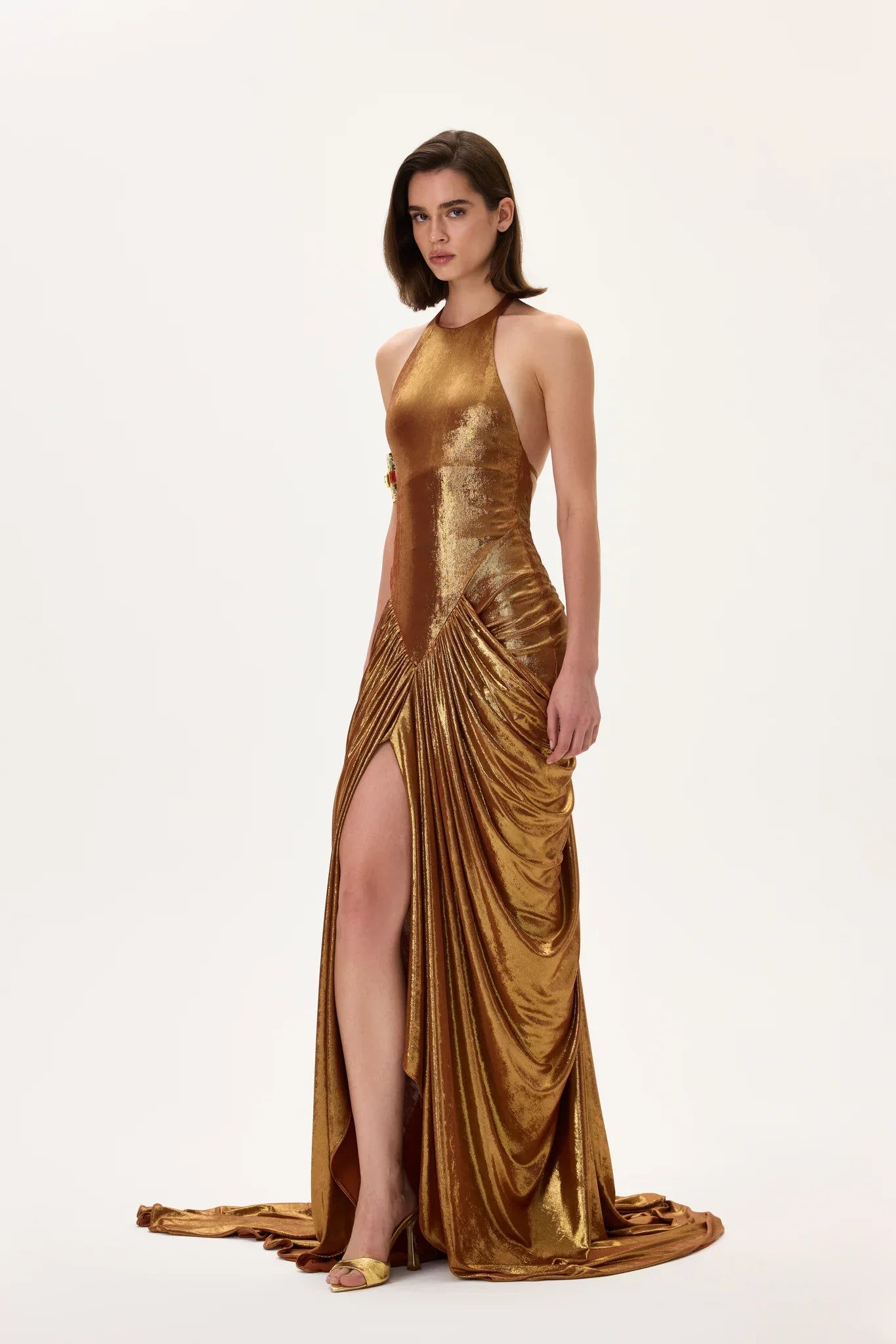 Metallic Jersey Halter Neck Maxi Gown With Gold Back Accessory