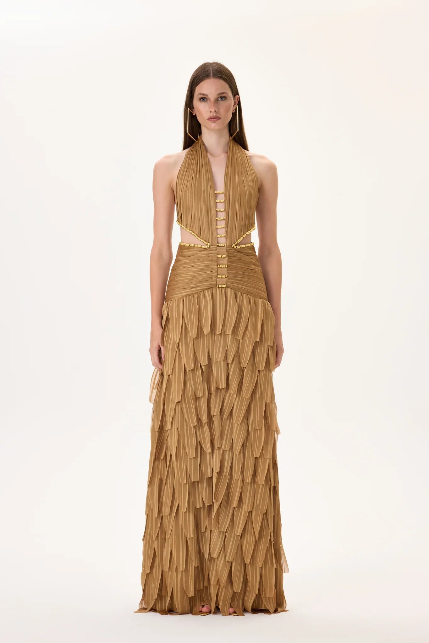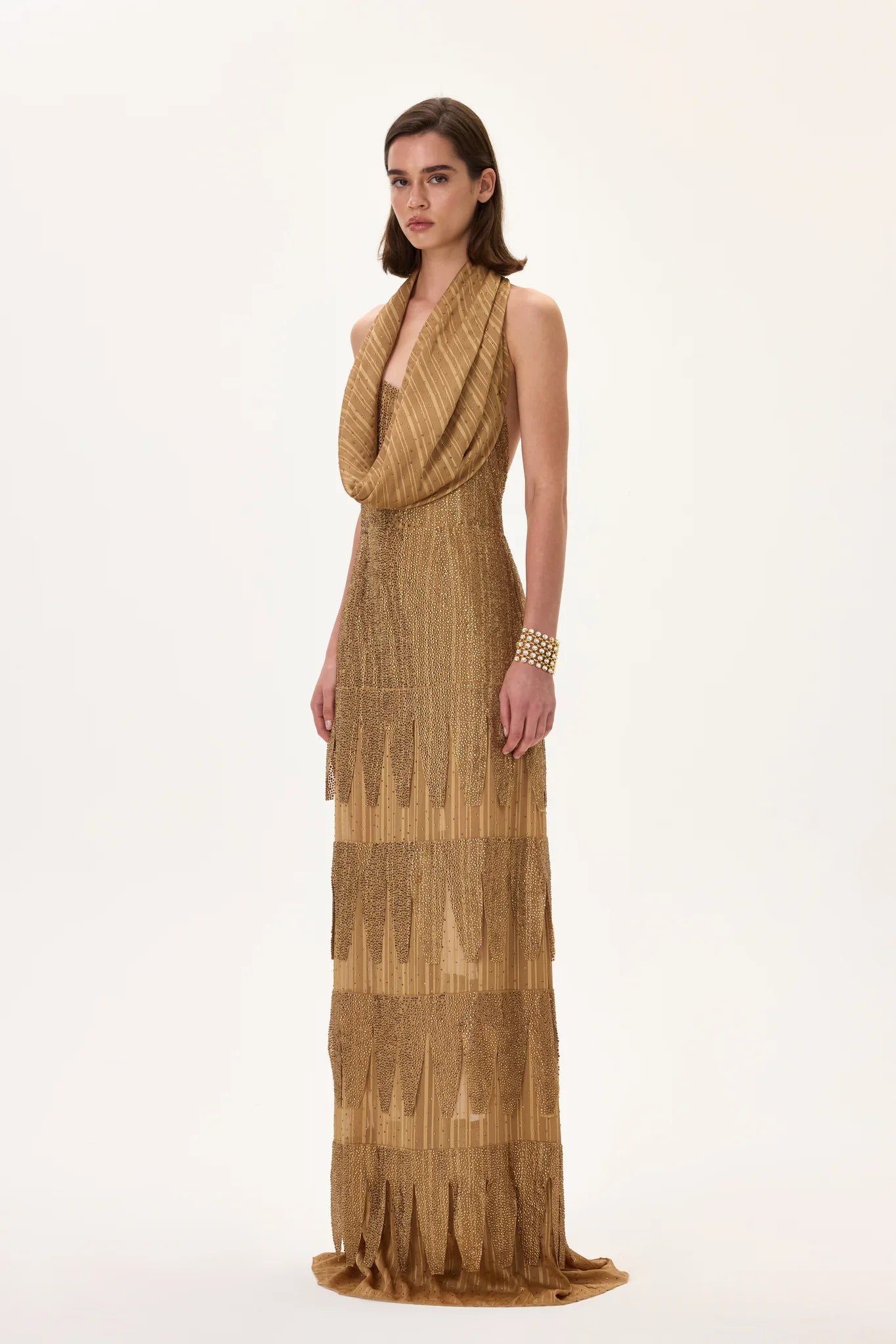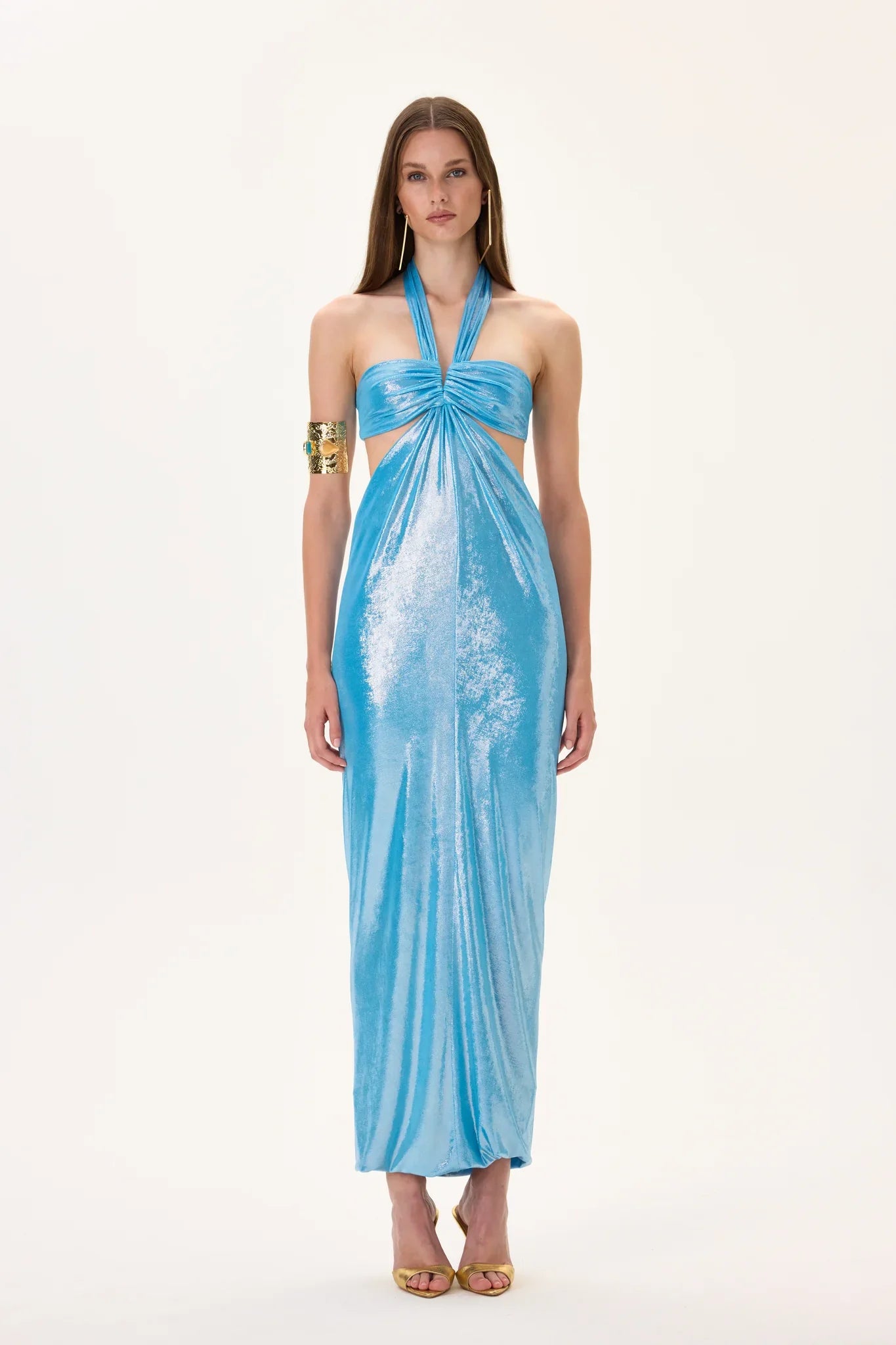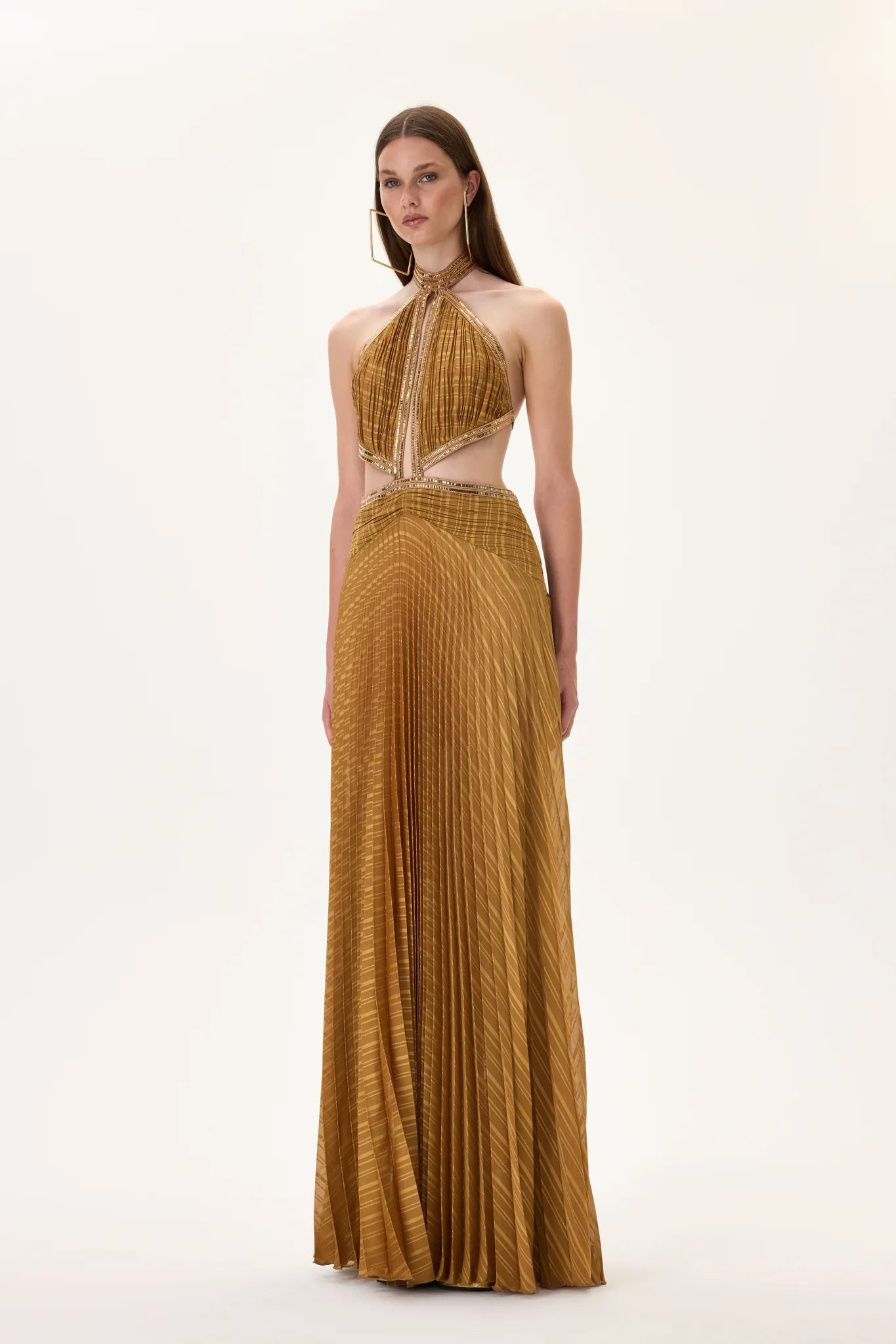 Metallic Jersey Halter Neck Maxi Gown With Gold Back Accessory