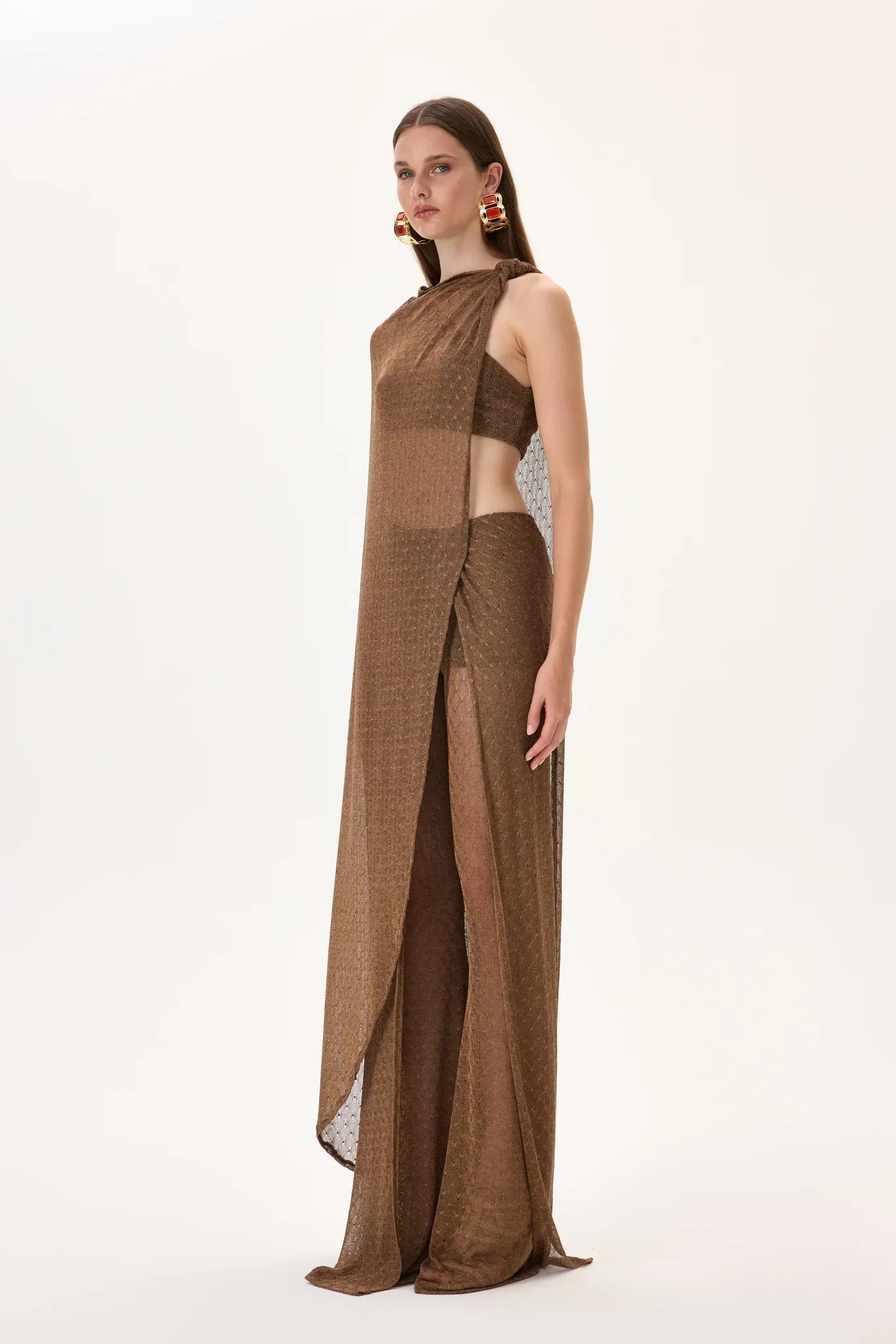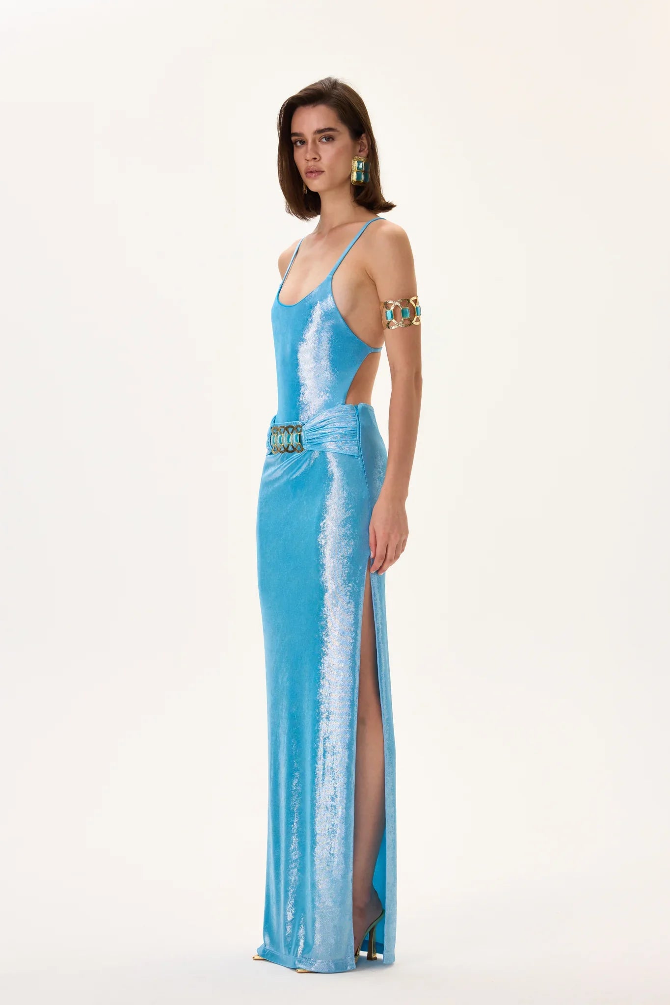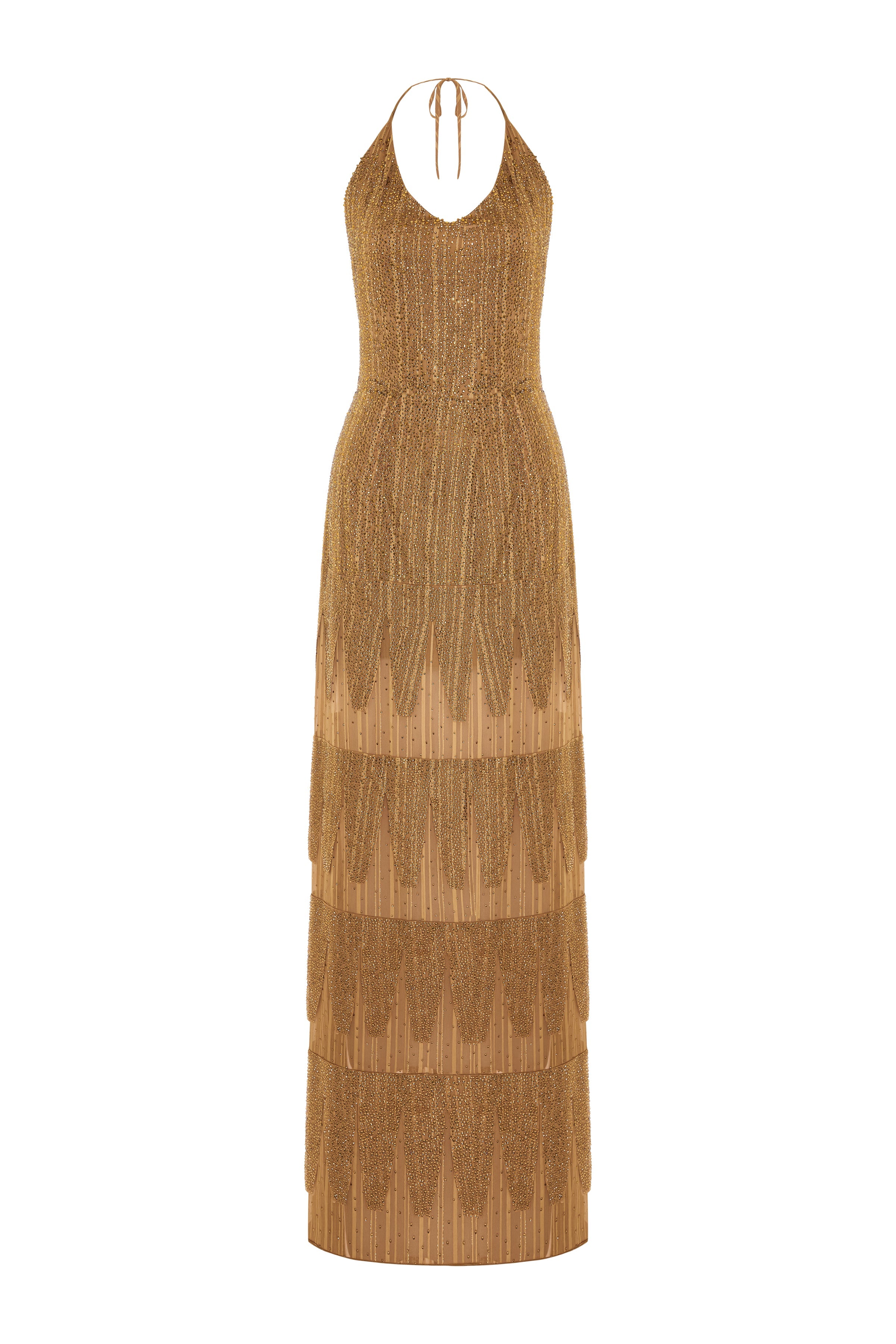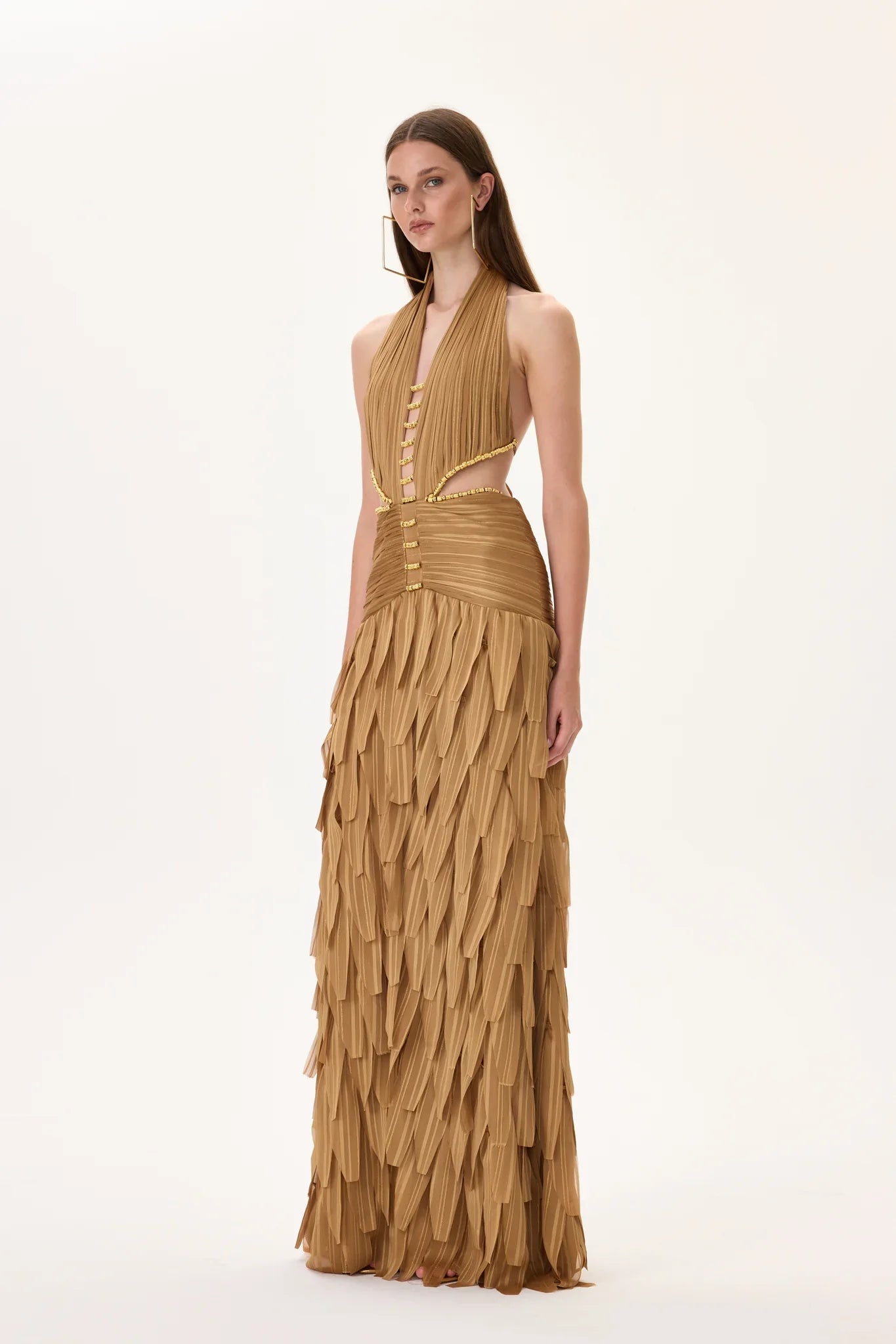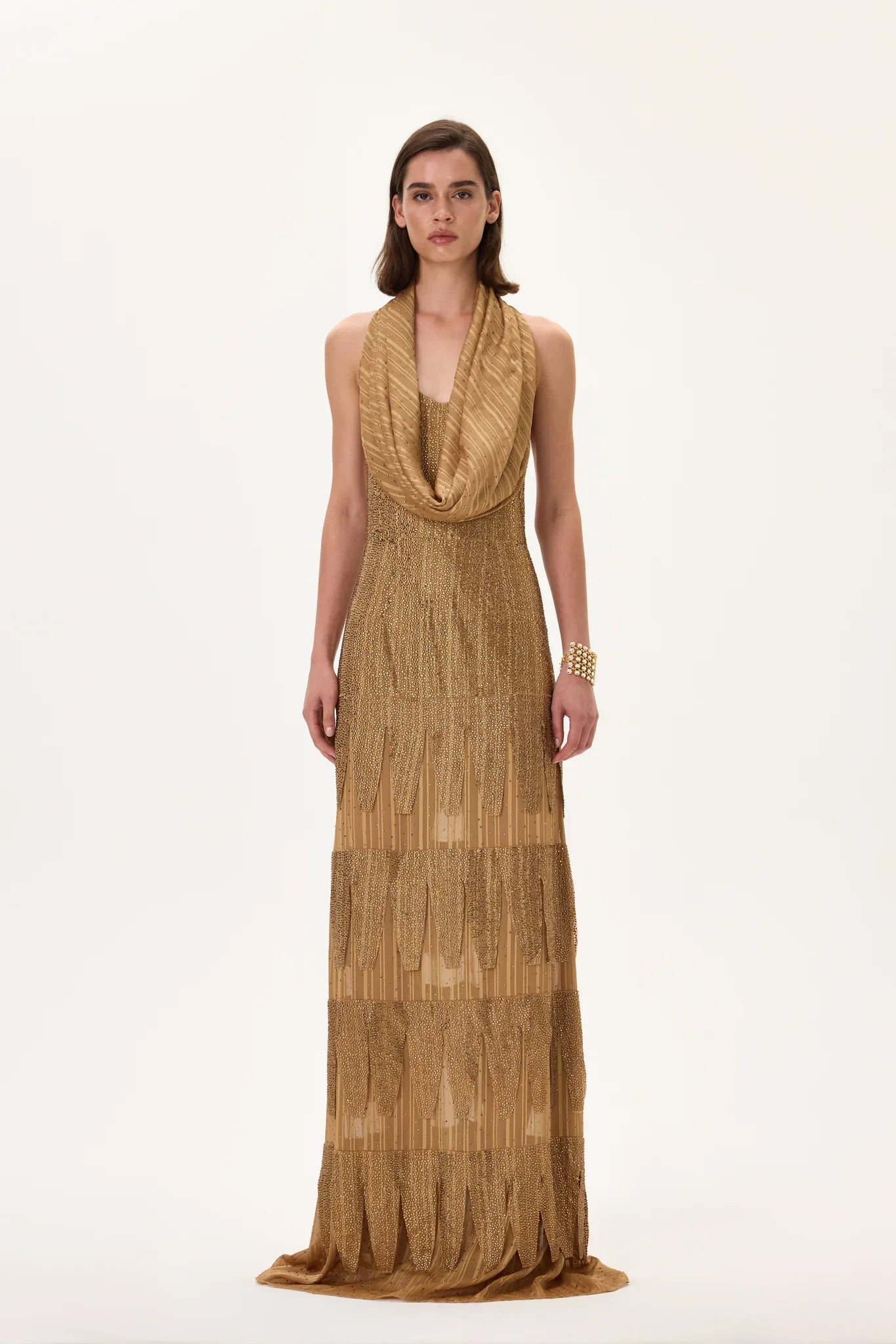 Metallic Jersey Halter Neck Maxi Gown With Gold Back Accessory