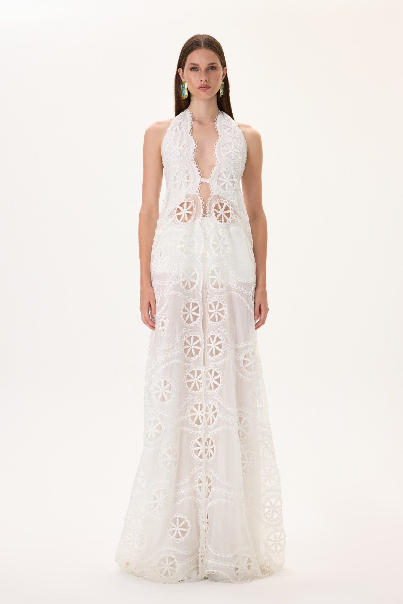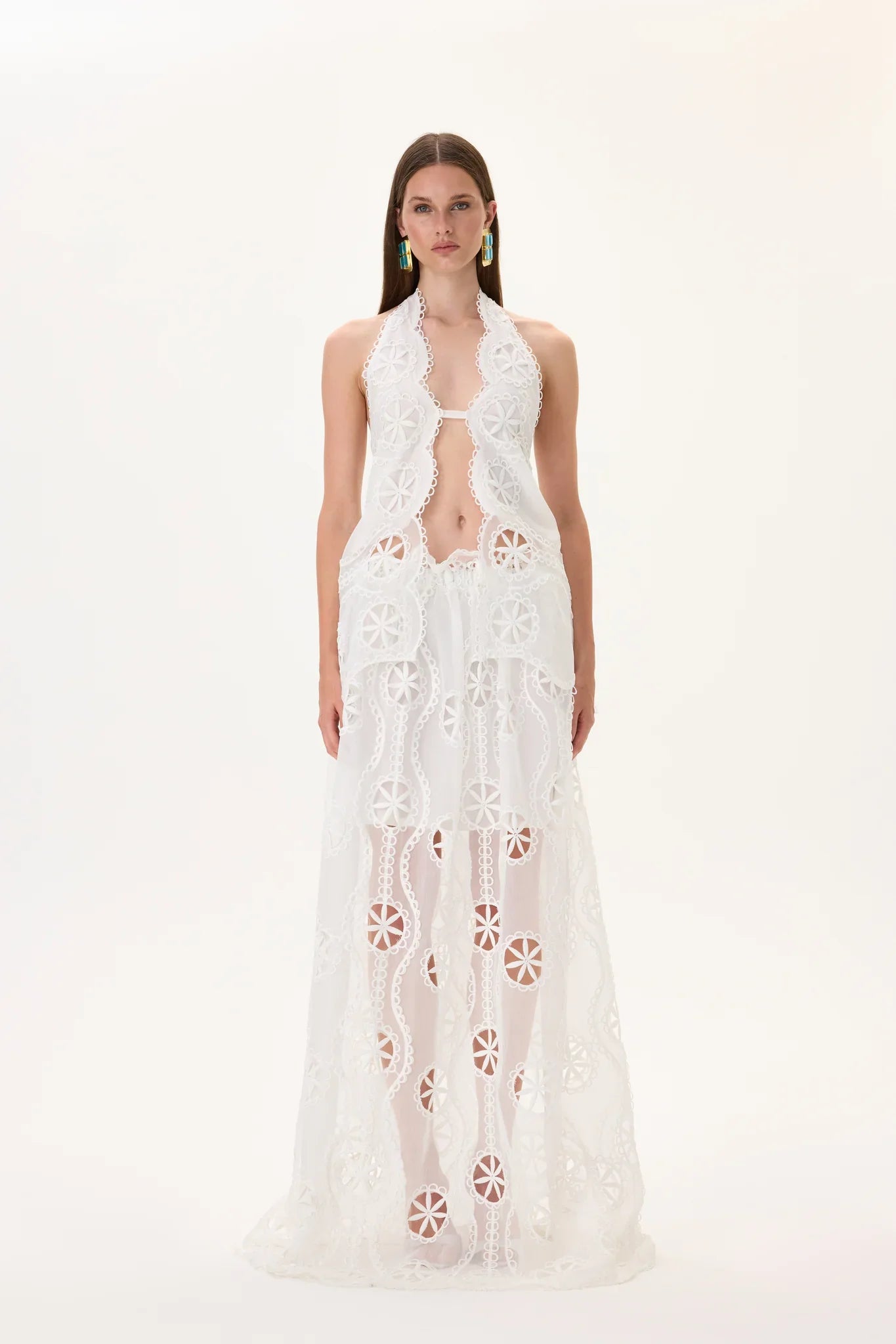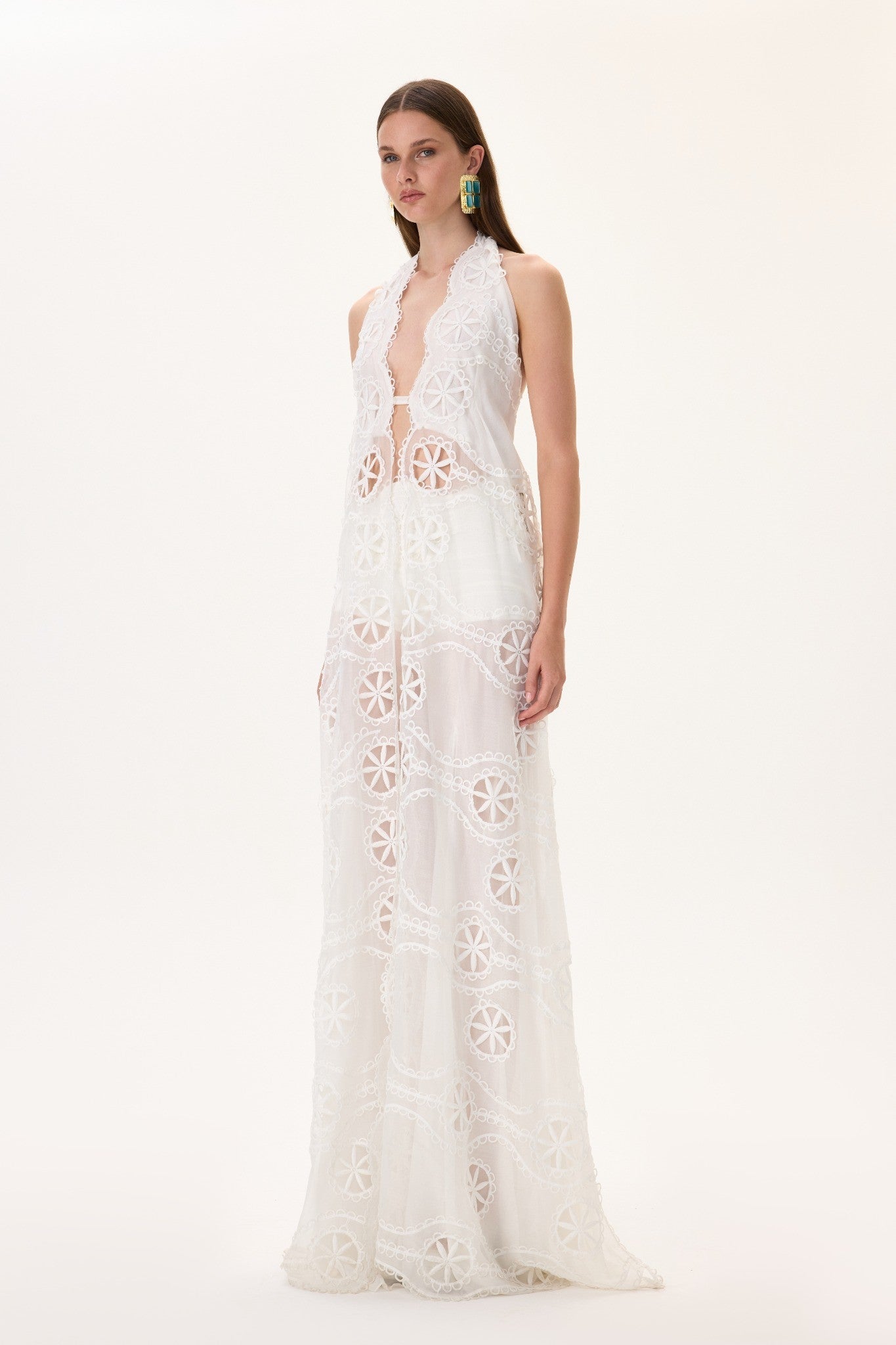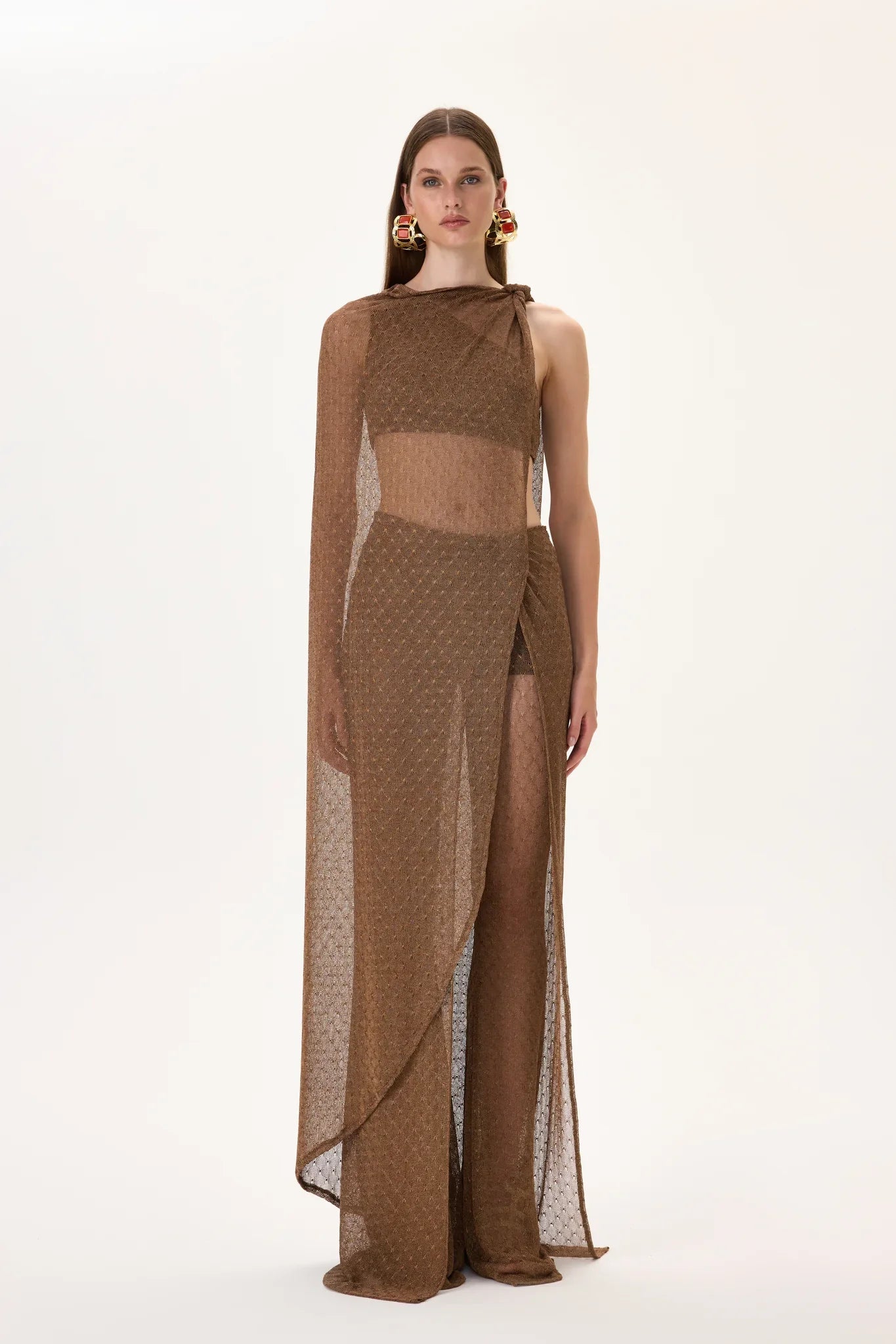 Laser Cut Chiffon Maxi Dress With Draped Body And Gold Beadings