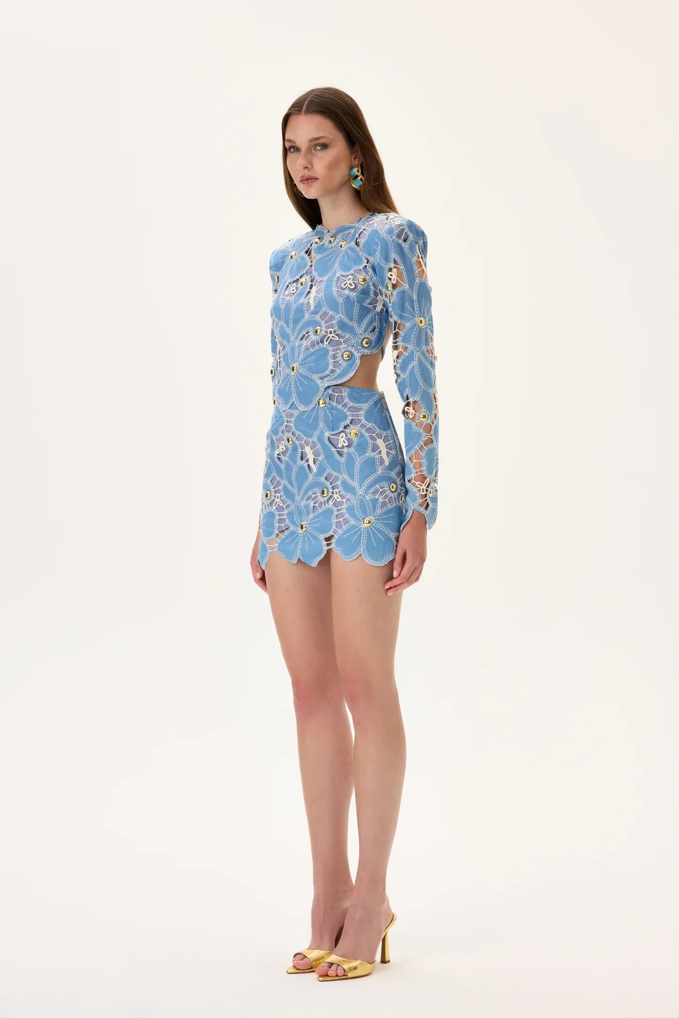 Denim & Lace Mini Dress With Gold Metal Centered Flower Embroidery