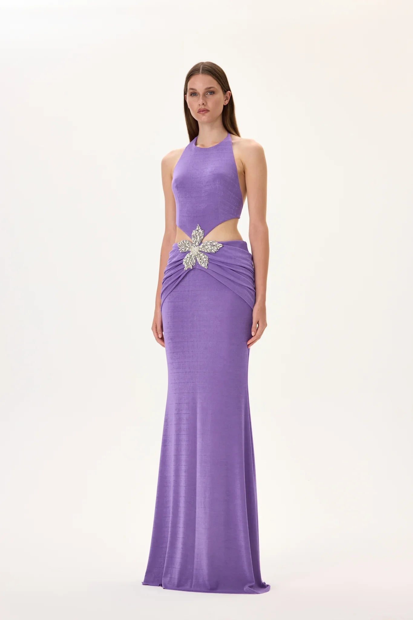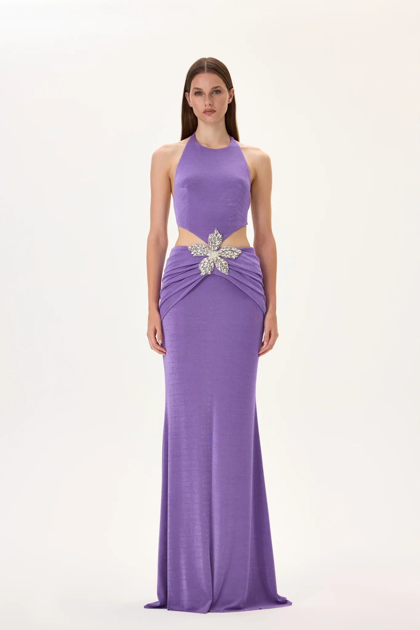 Violet Buzzy Maxi Gown With Draped Waistline And Crystal Flower
