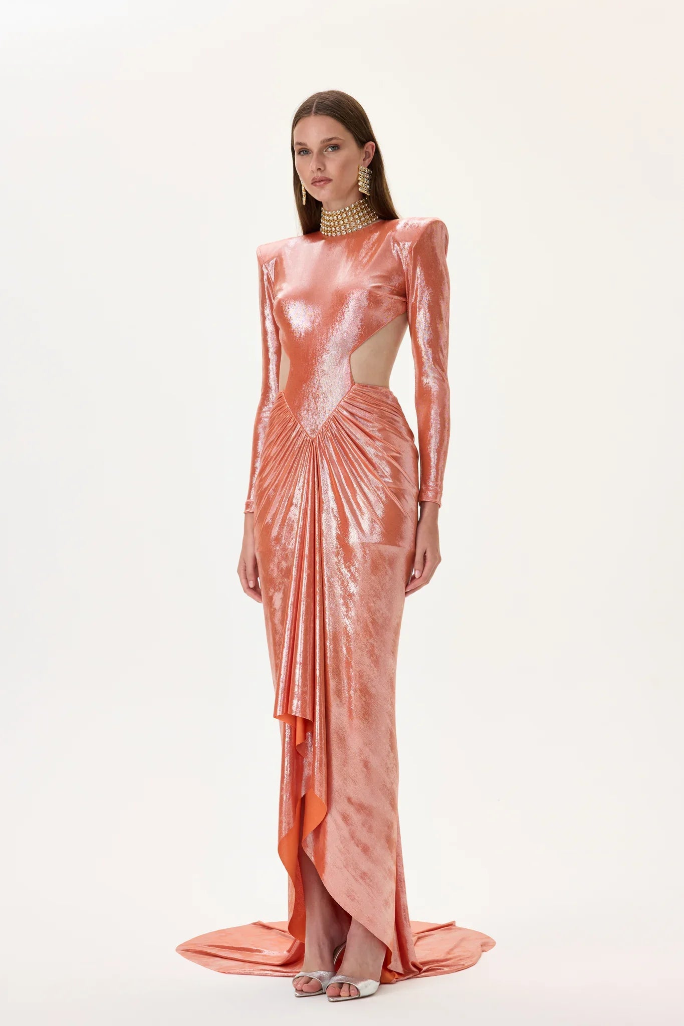Cut-Out Detailed Metallic Jersey Maxi Dress With High-Low Hemline And Train