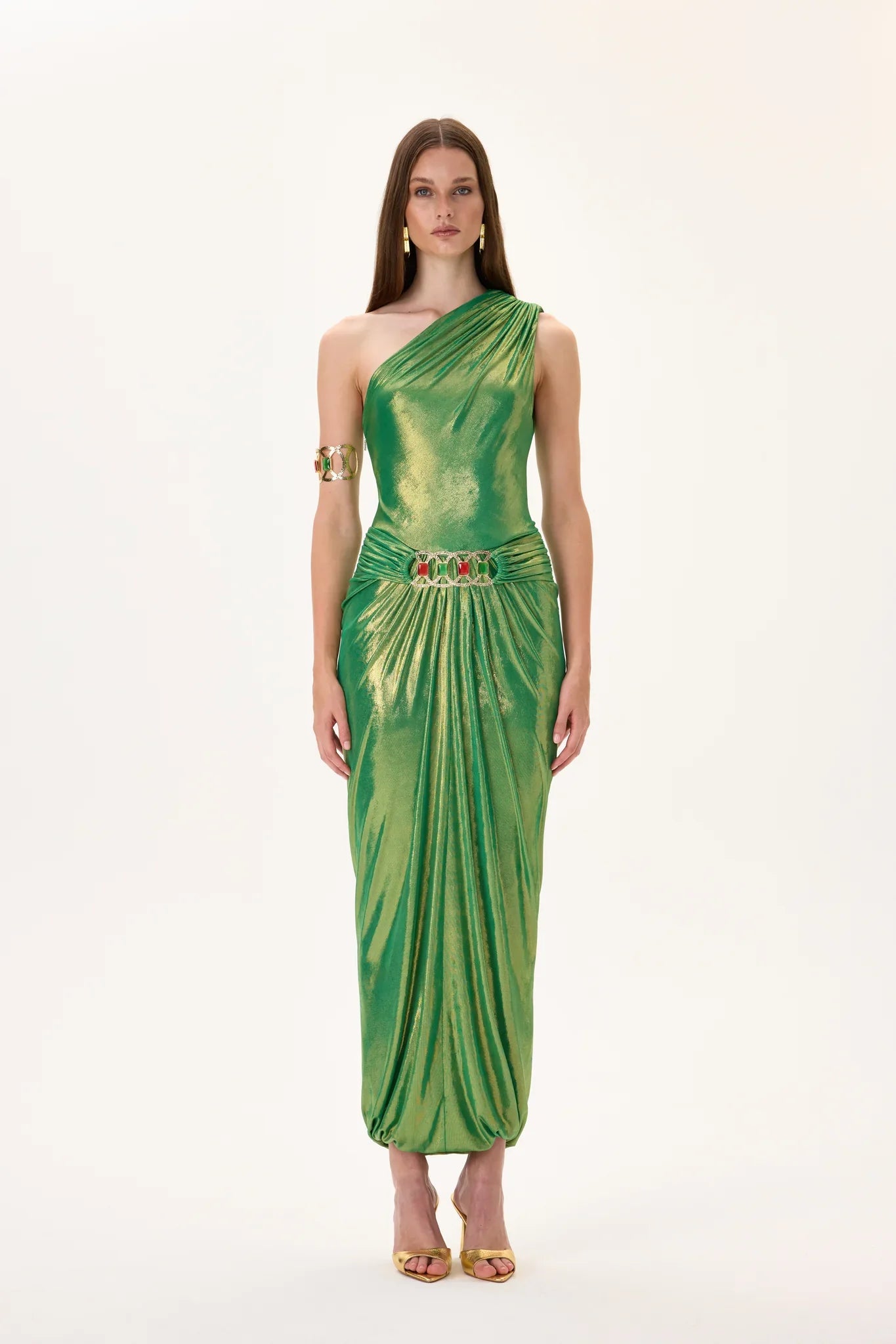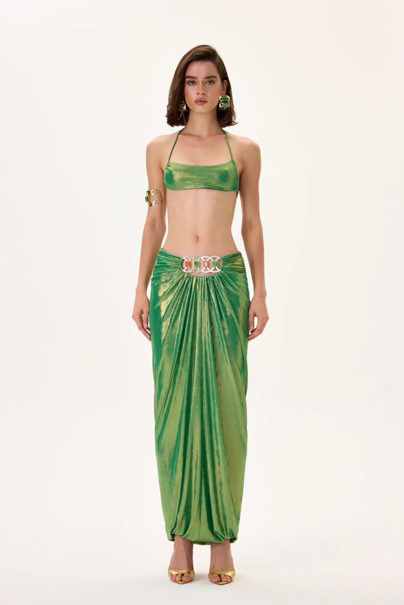 Green Metallic Jersey Balloon Skirt With Gold Accessory And Ruched Waistline