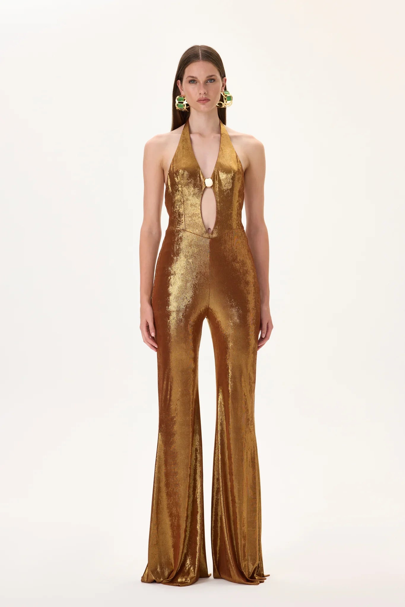 Bronze Metallic Jersey Gold Accessory Detailed Flare Jumpsuit