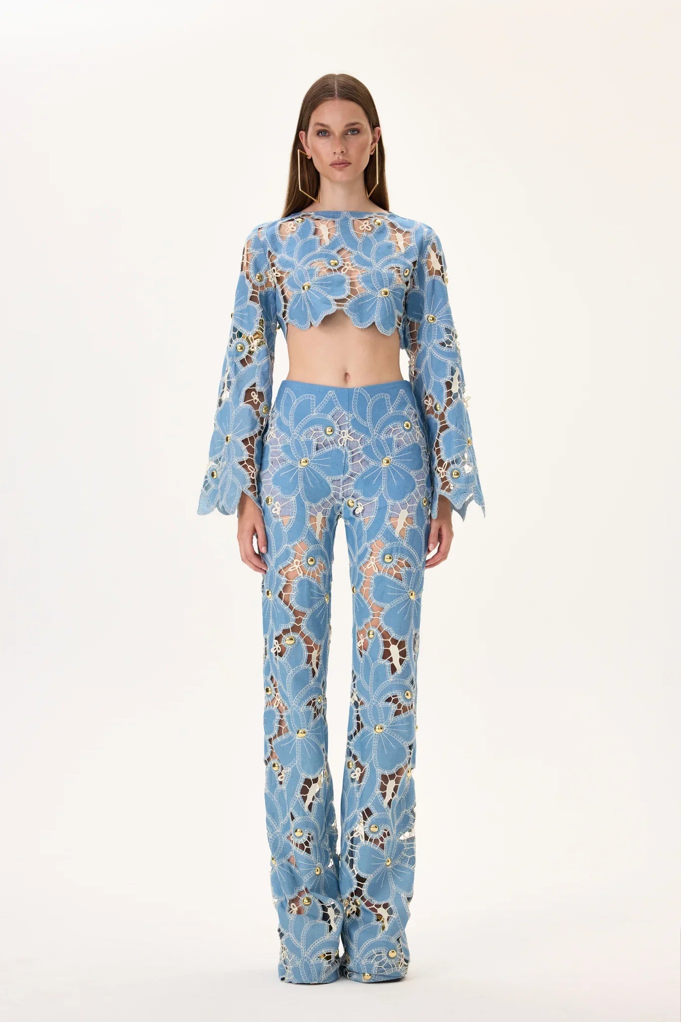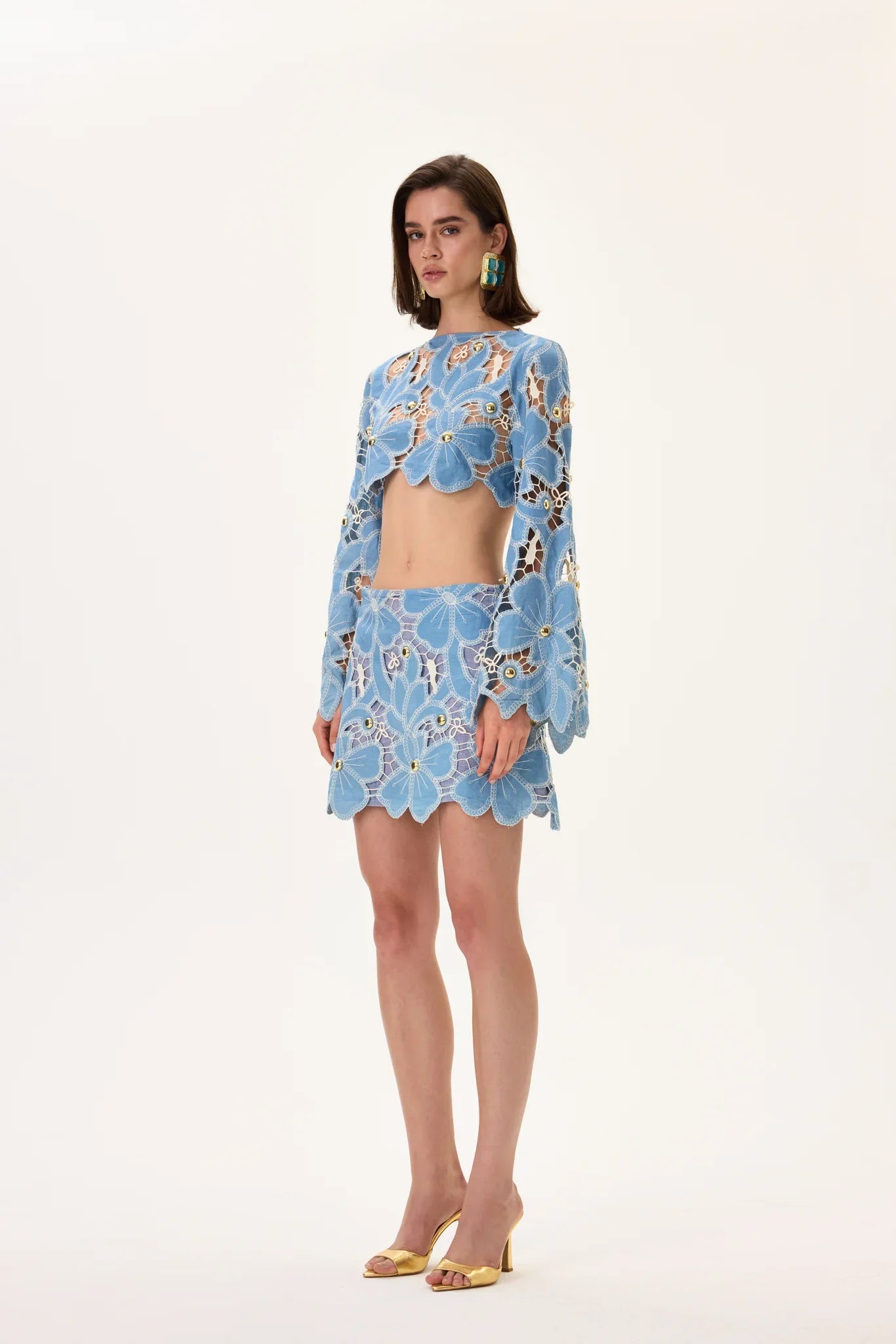 Denim & Lace Crop Top With Gold Metal Centered Flower Embroidery & Sleeves