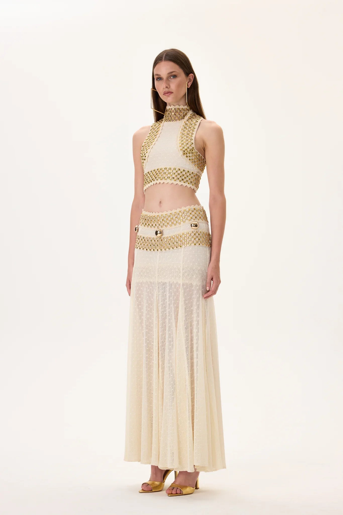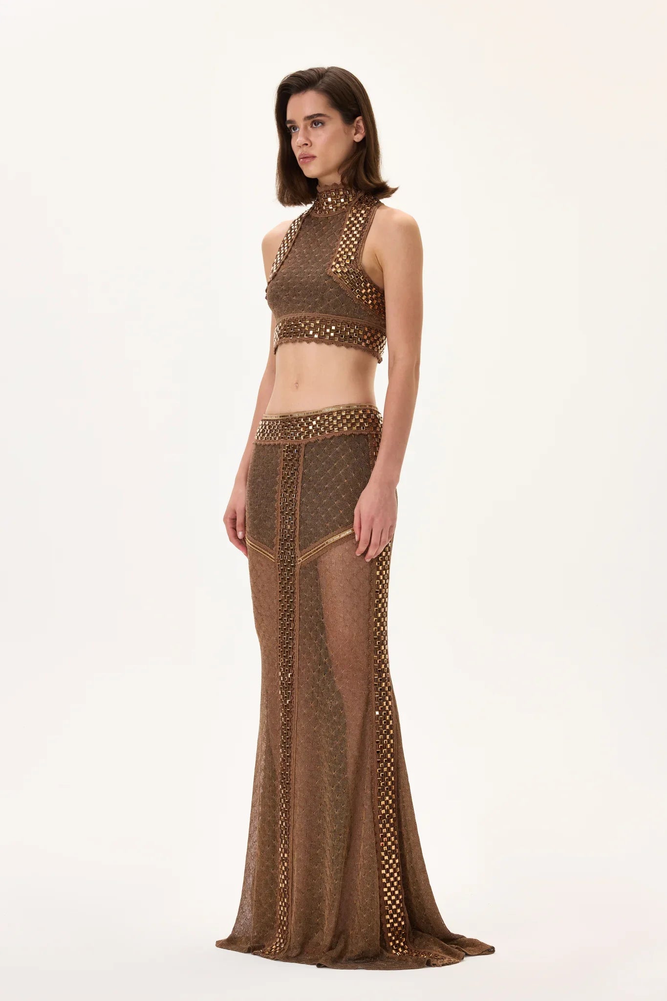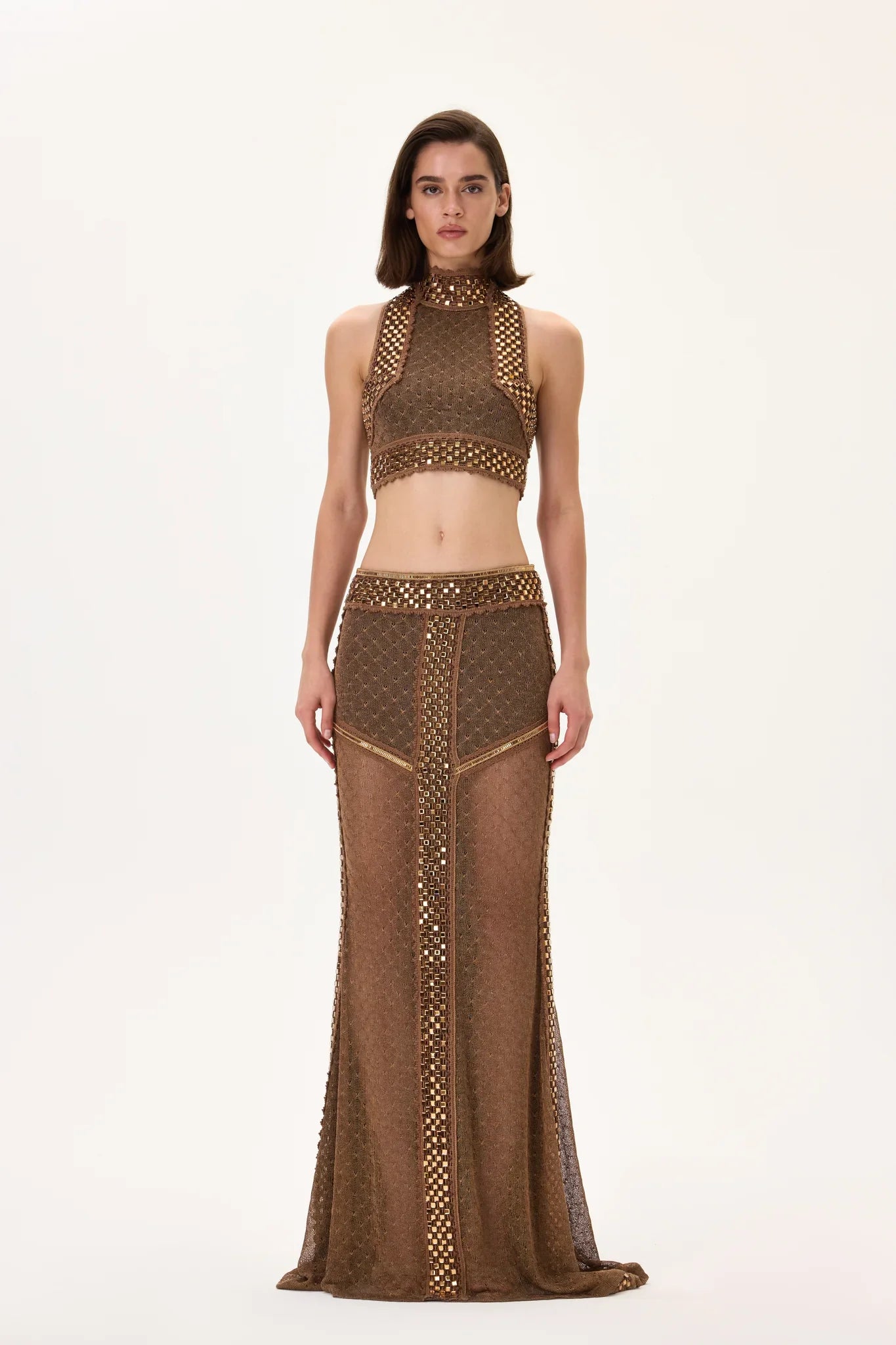 Knitted Maxi Skirt With Bronze Stone Borderline And Gold Rhinestone Strips