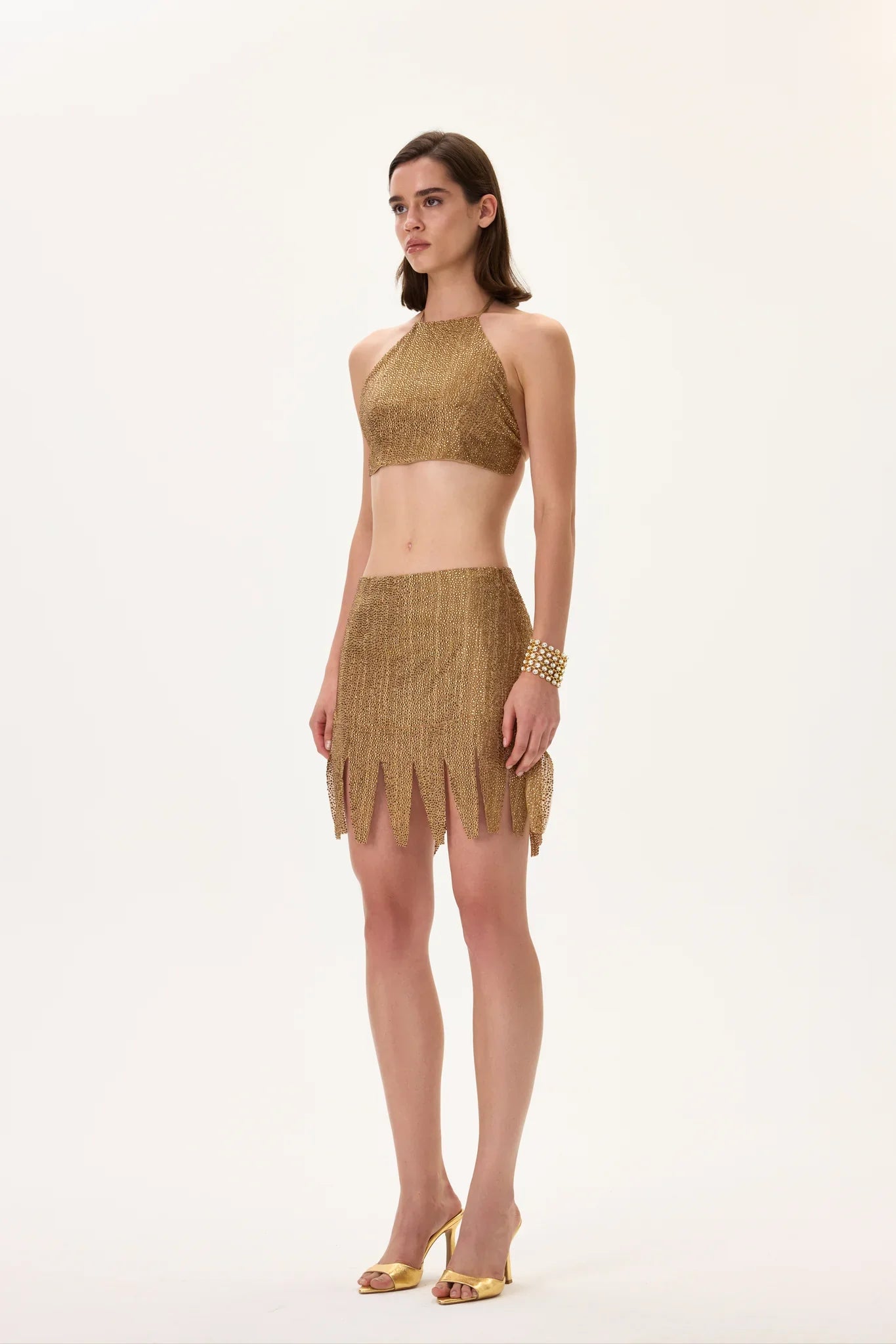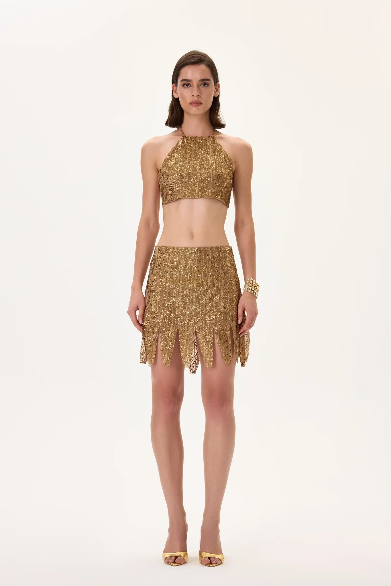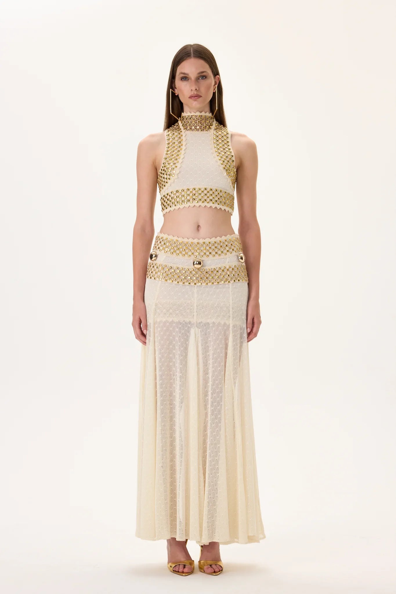 Knitted Maxi Skirt With Bronze Stone Borderline And Gold Rhinestone Strips