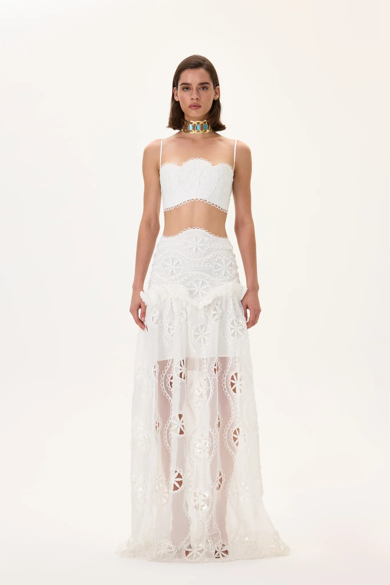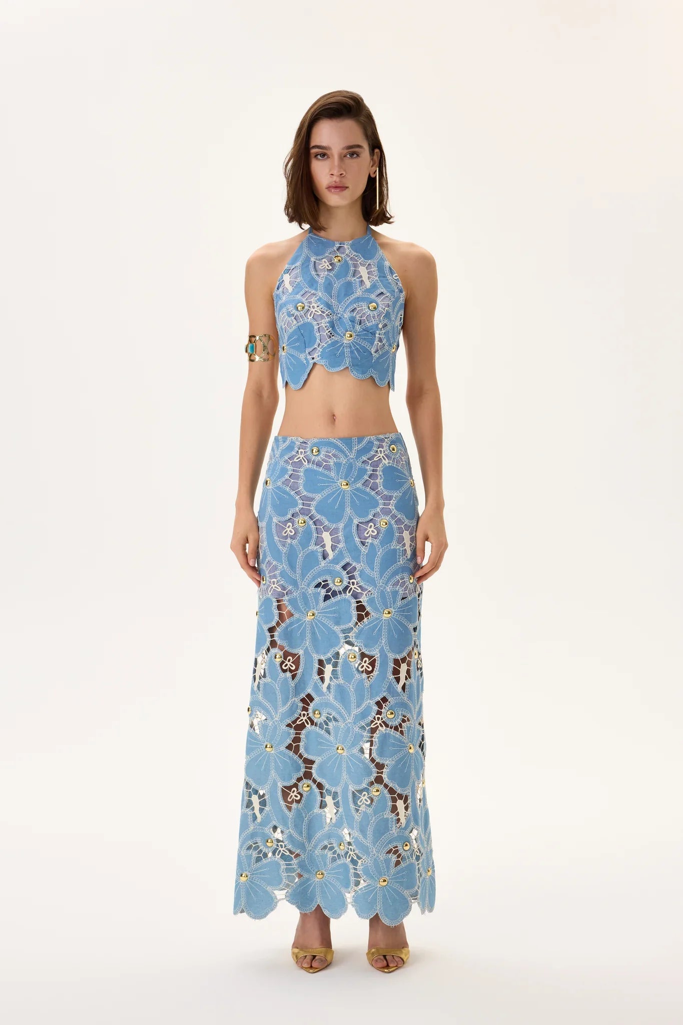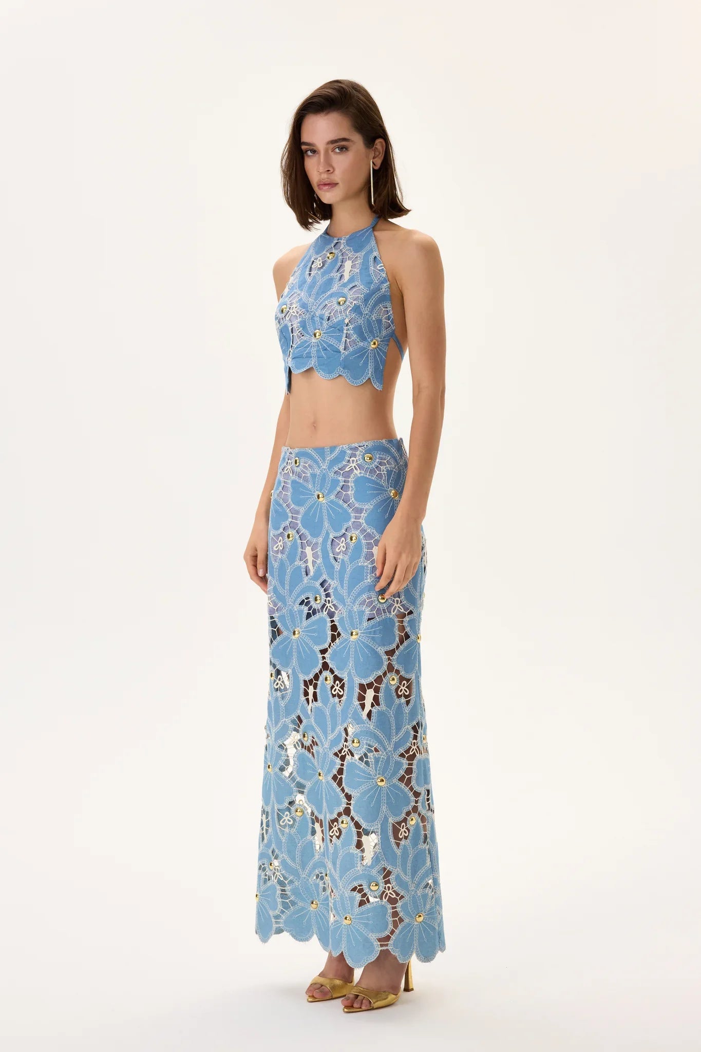 Denim & Lace Maxi Skirt With Gold Metal Centered Flower Embroidery