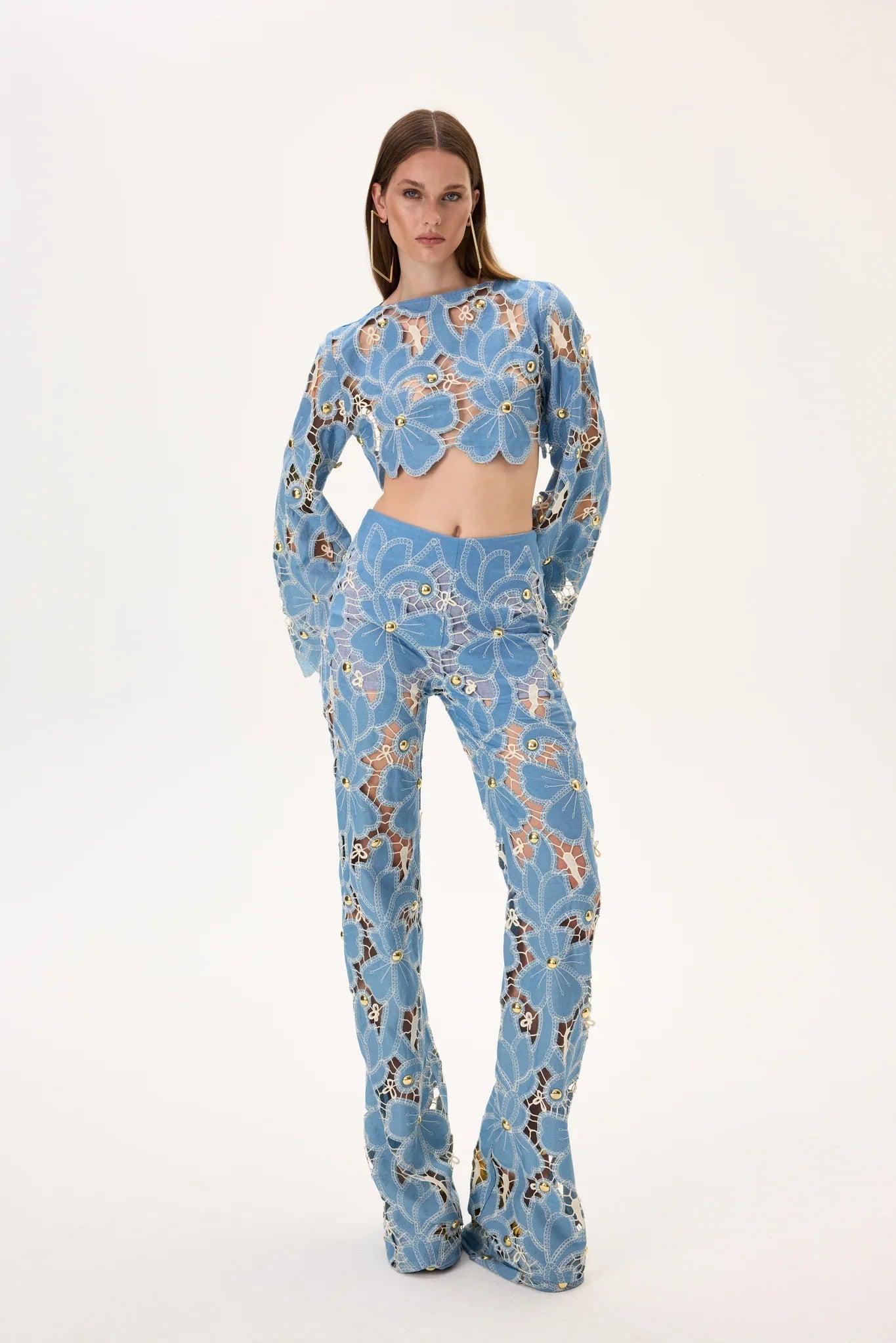 Denim & Lace Pants With Gold Metal Centered Flower Embroidery