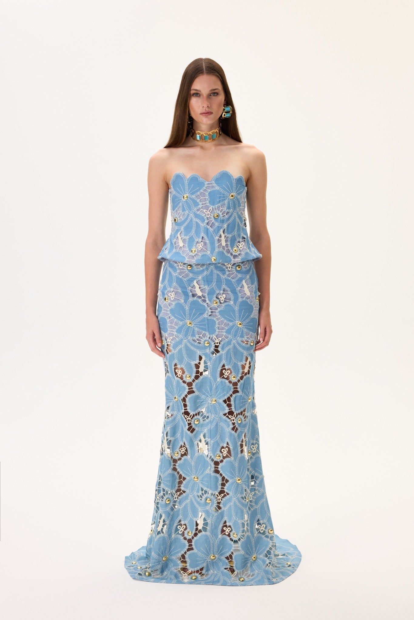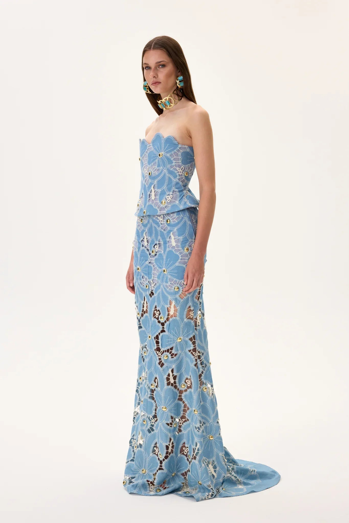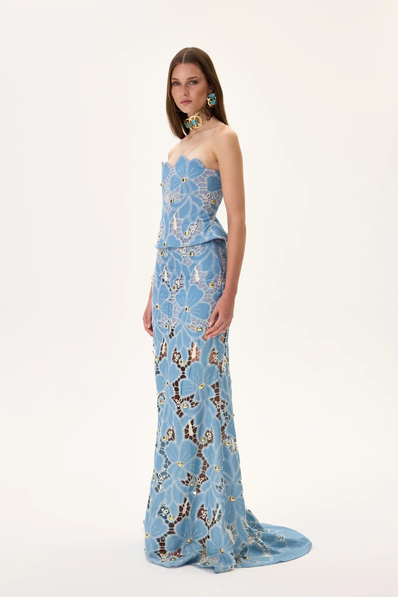 Denim Lace Strapless Corset With Gold Metal Centered Flower Embroidery