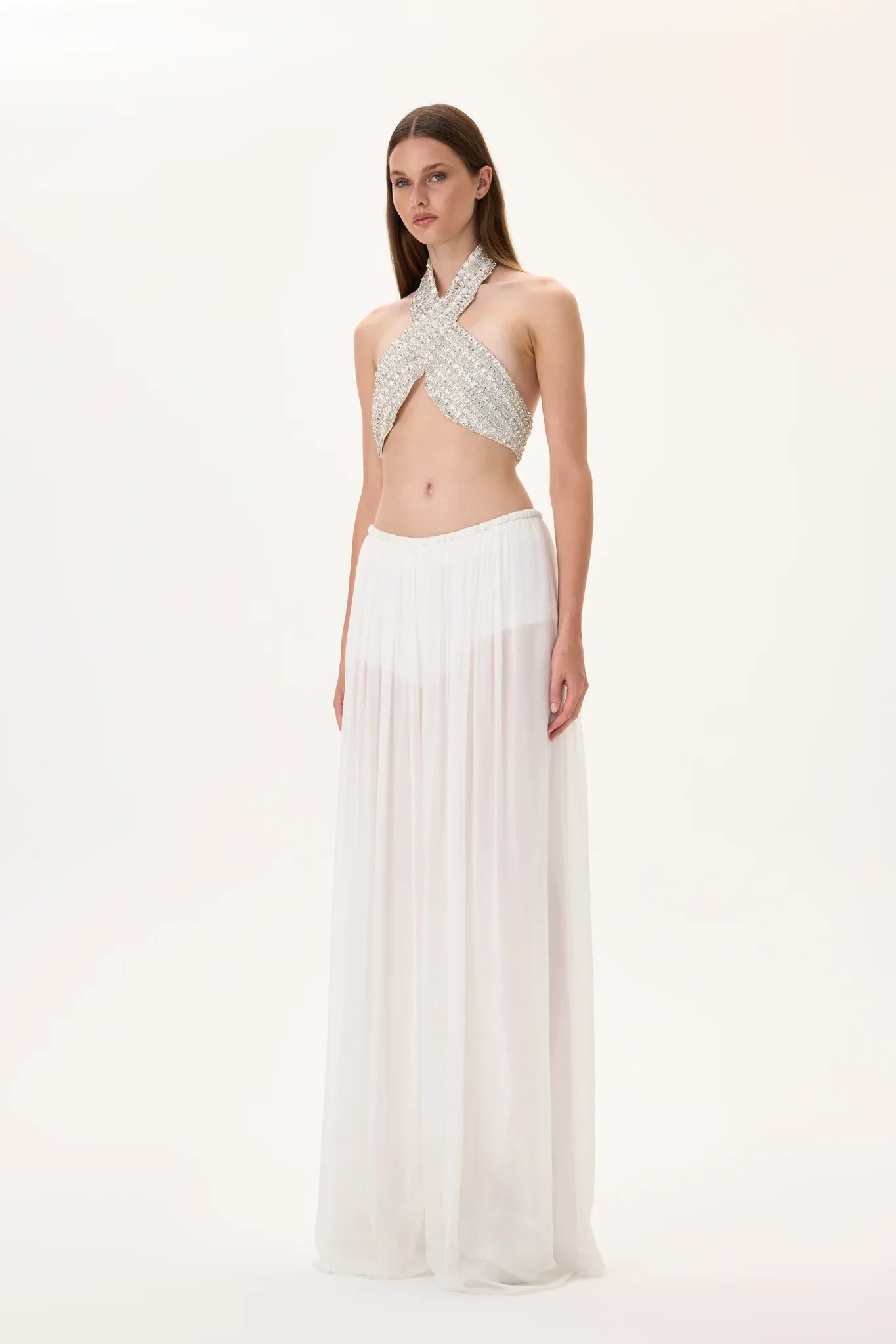 Pleated Chiffon Maxi Dress With Gold Rhinestone Borders