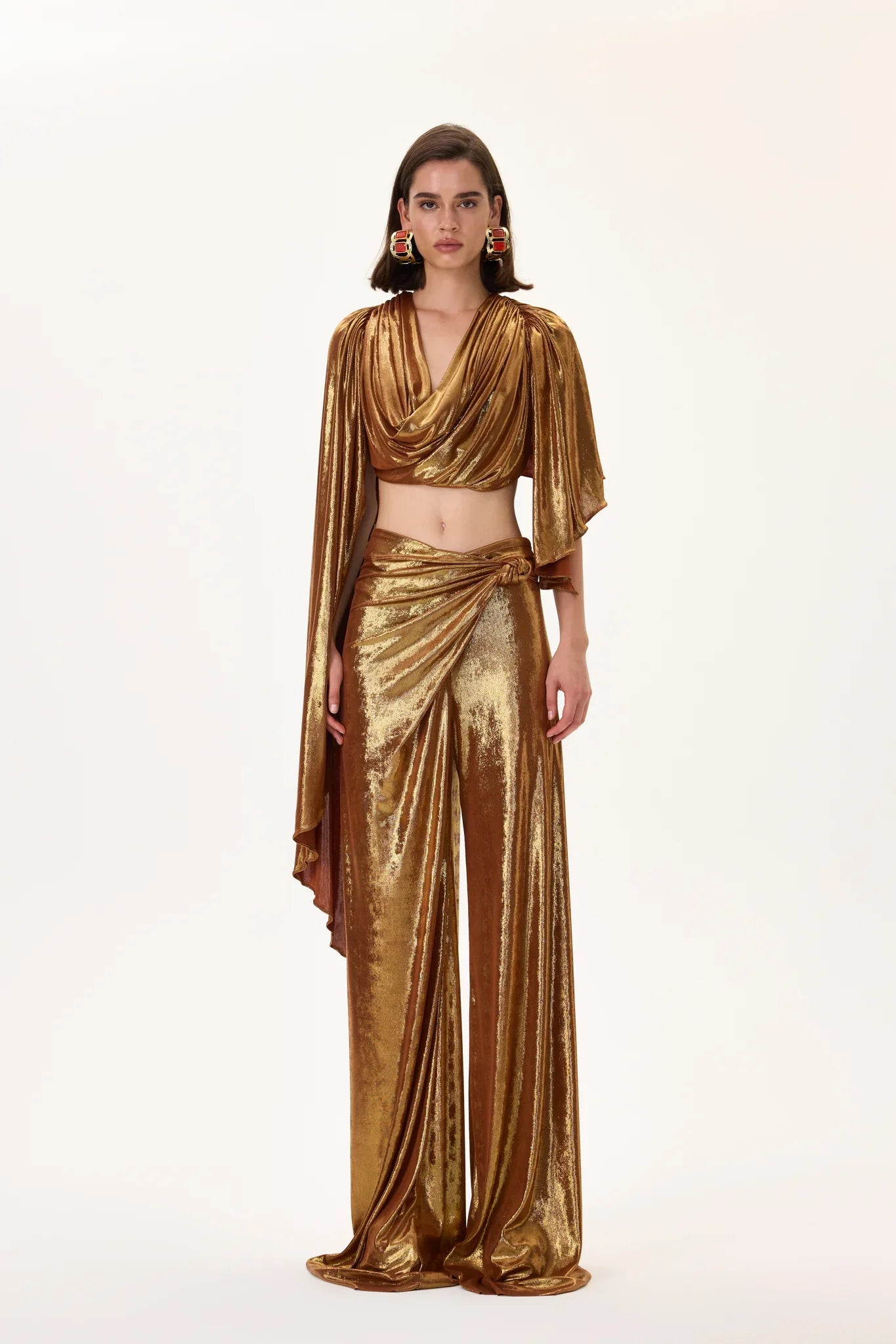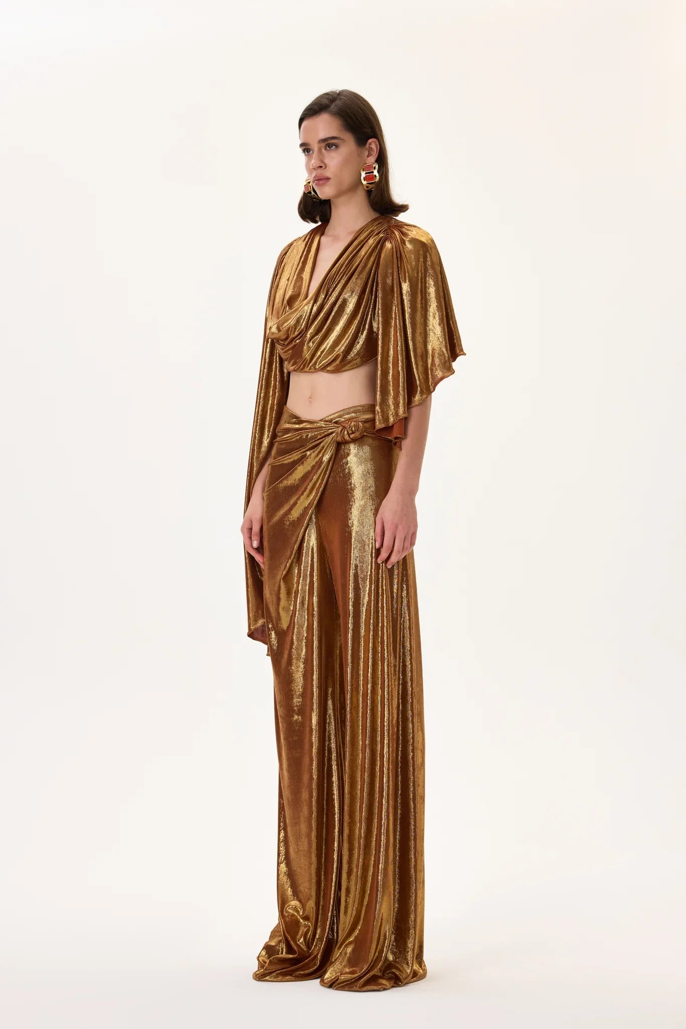 Bronze Metallic Jersey Ruched Waisted Wide Leg Pants