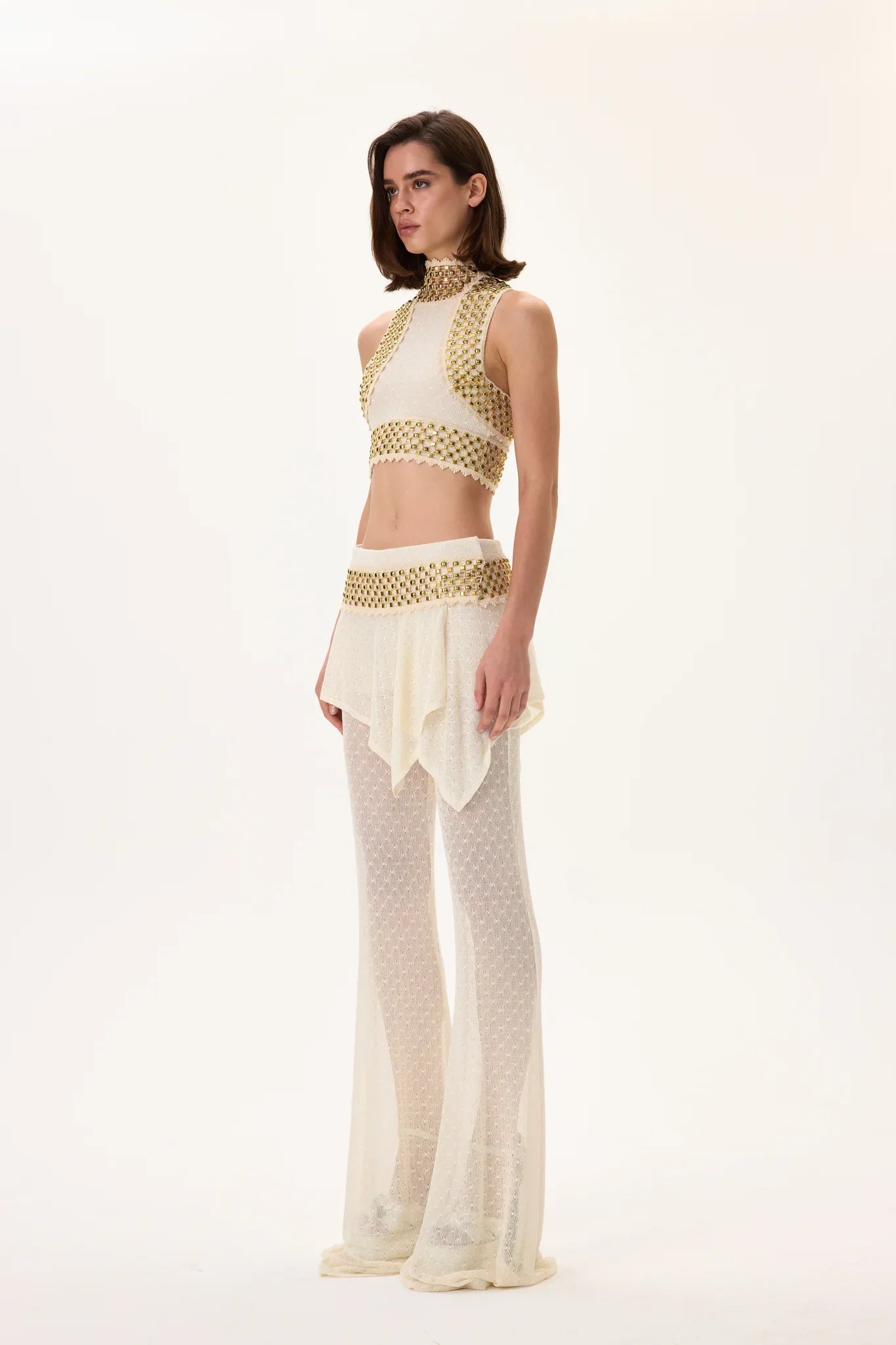 Knitted Crop Top With Bronze Stone Borderline And Fully Buttoned Back