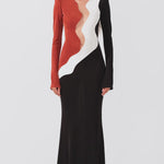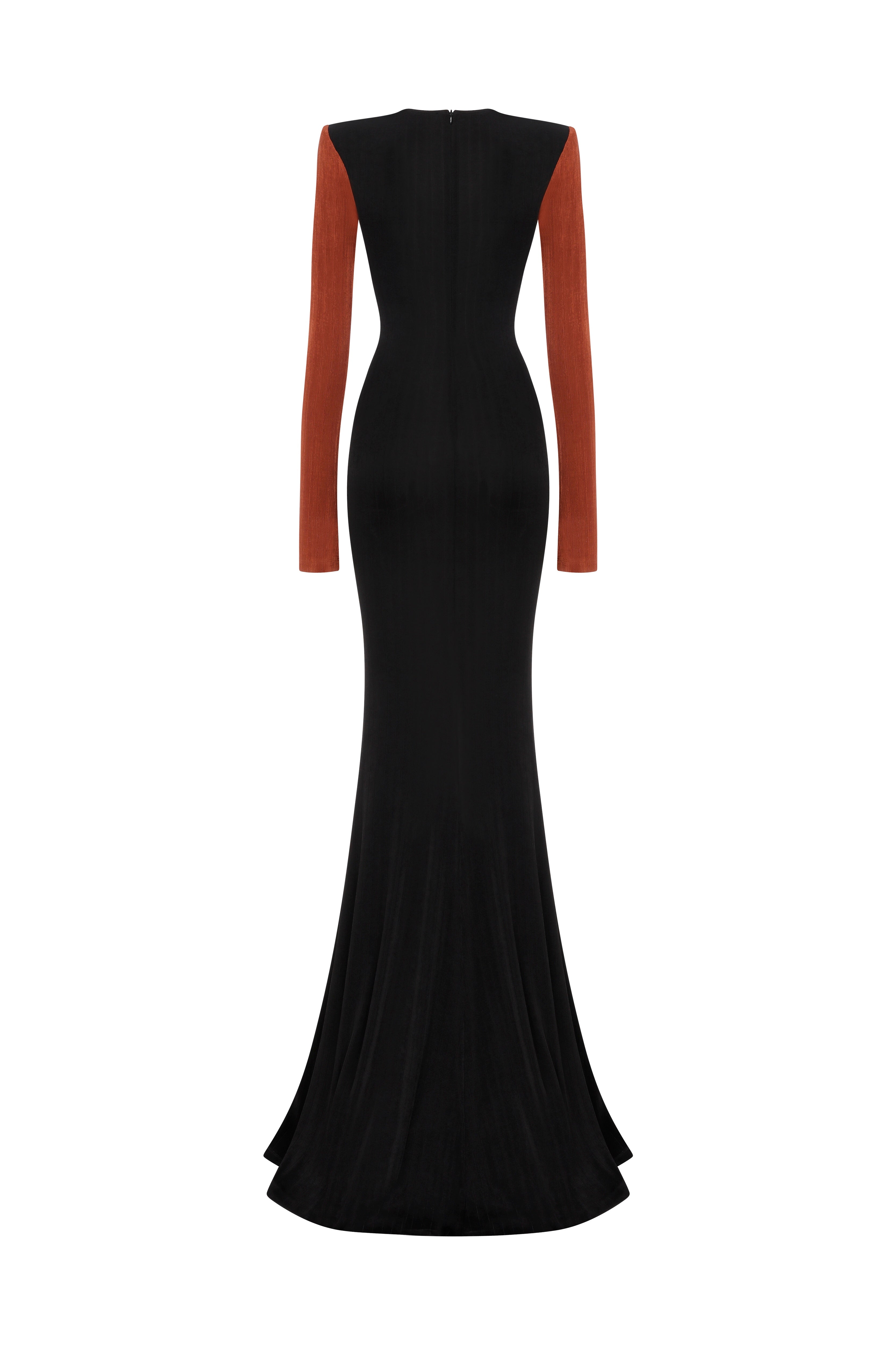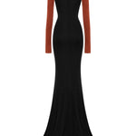 The long-sleeved dress with its deep-cut, body-hugging form is one of the favorite pieces of the RS24 collection.