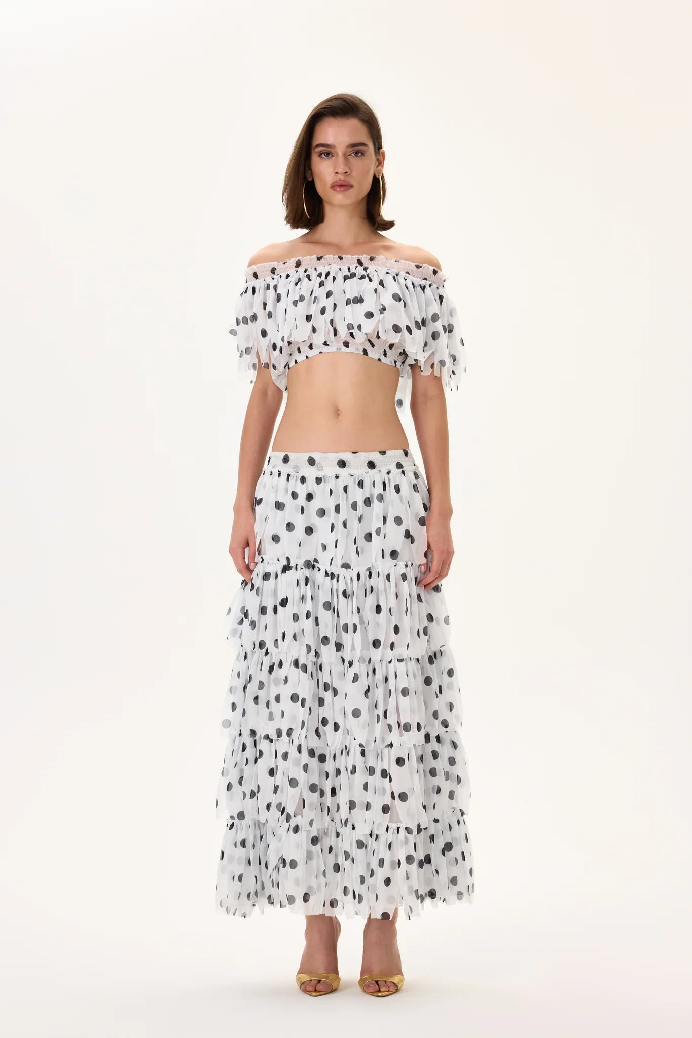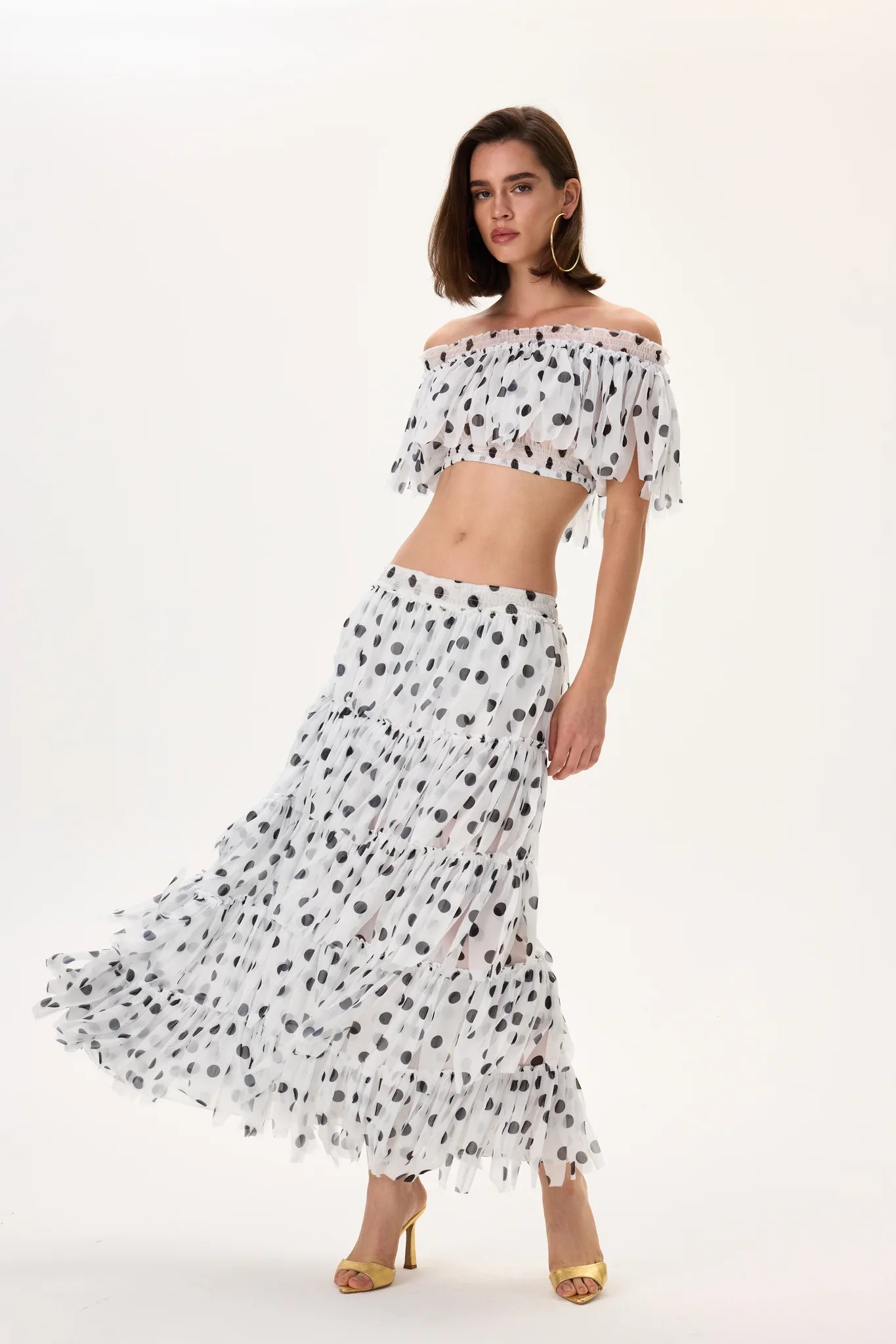 A refined midi skirt crafted from lightweight chiffon featuring precision laser-cut polka dot detailing. The elasticated waistband ensures a comfortable, flexible fit while maintaining a clean, feminine silhouette. Flowing chiffon fabric enhances movement, creating an elegant drape ideal for coordinated sets, evening looks, or elevated daytime styling.