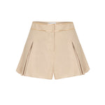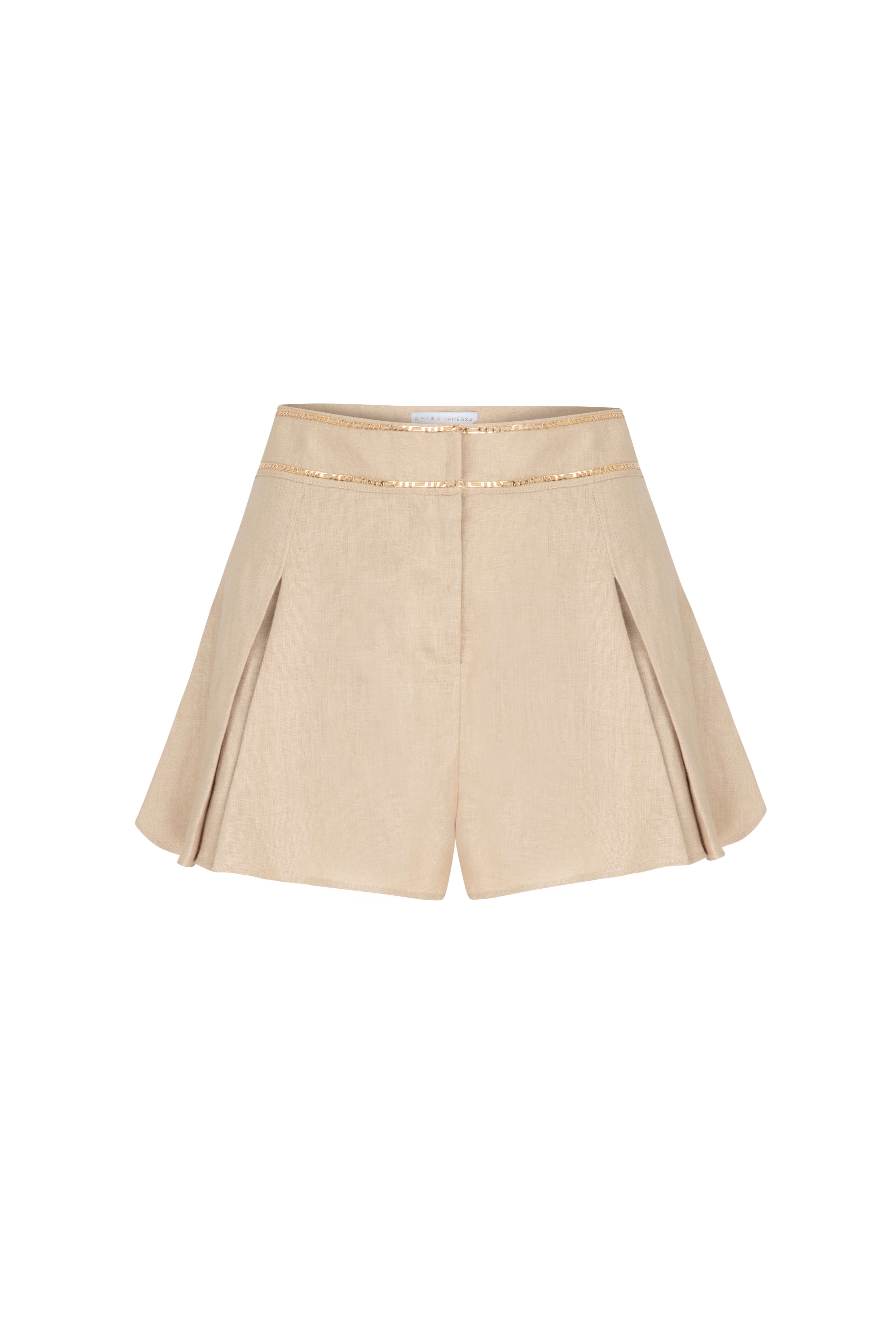 Indulge in elegance with our Beige Linen Shorts featuring chic pleats and gold chain detailing.