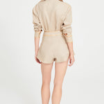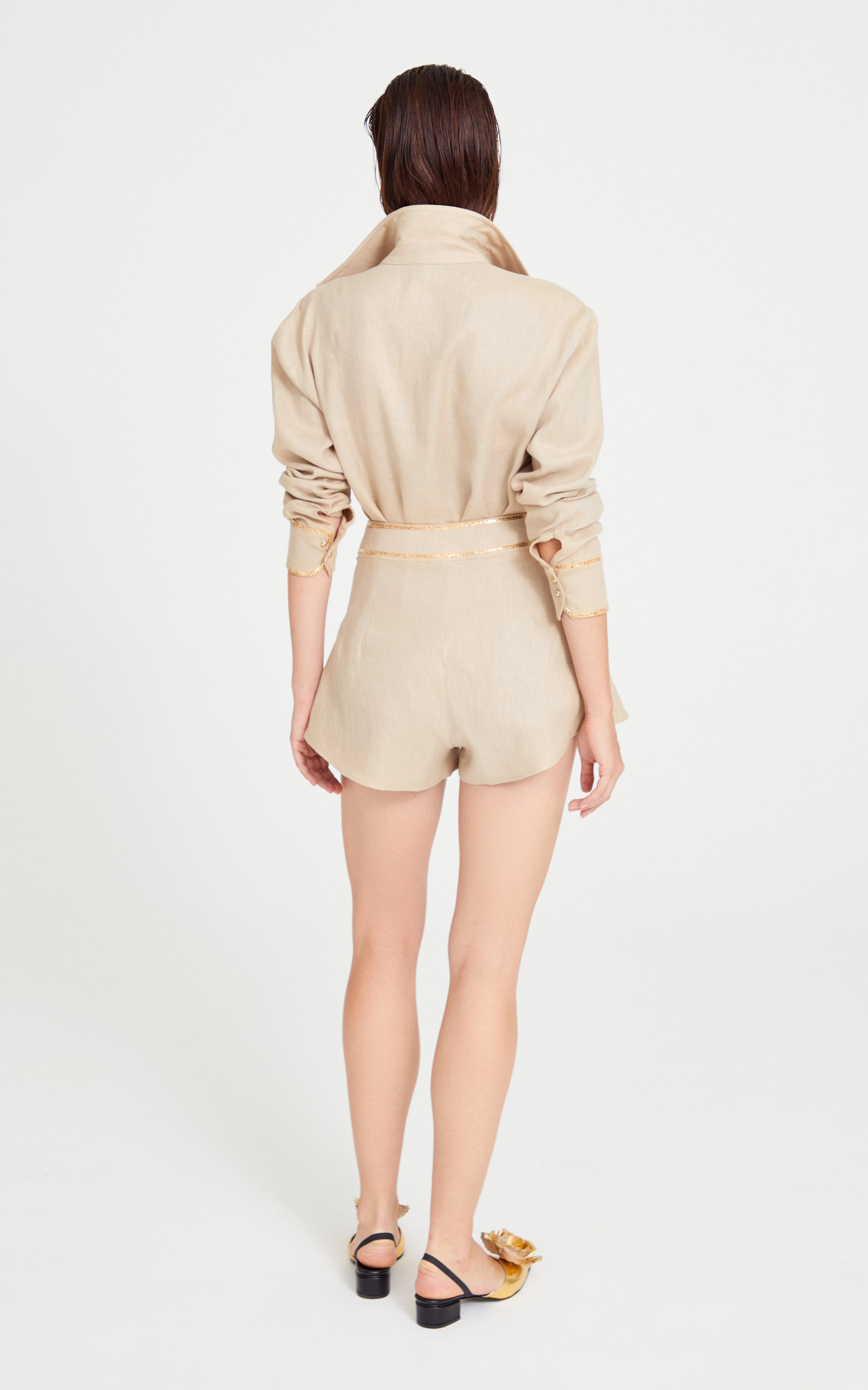 Beige Linen Shorts offer boasting elegant pleats and subtle gold chain detailing without the chain.