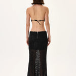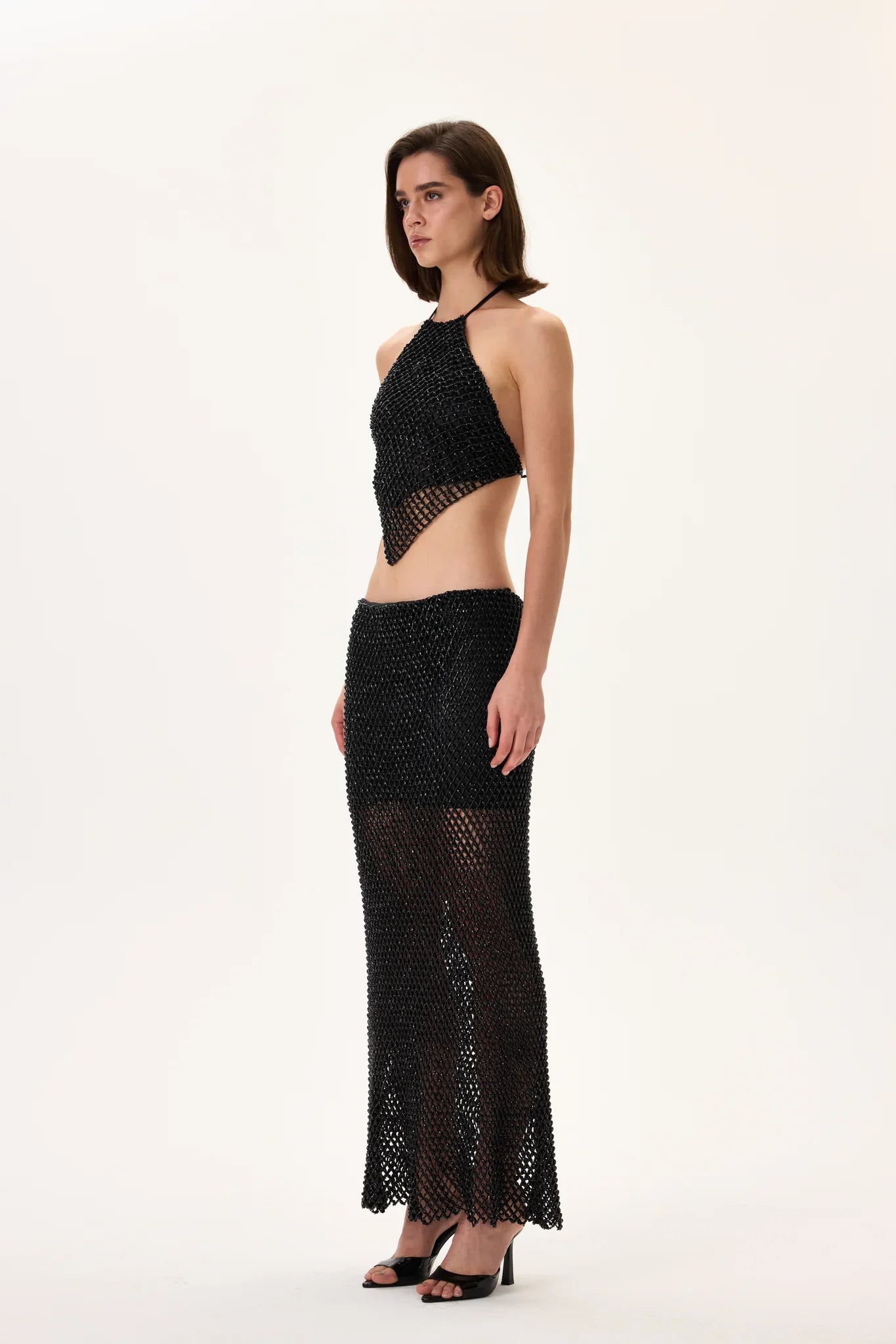 A refined halter-style crop top crafted from beaded net fabric. The intricate beadwork provides a luxurious, textural effect while the halter neckline enhances silhouette definition. Designed for elevated styling, evening looks, and fashion-forward ensembles, offering both structure and elegance.