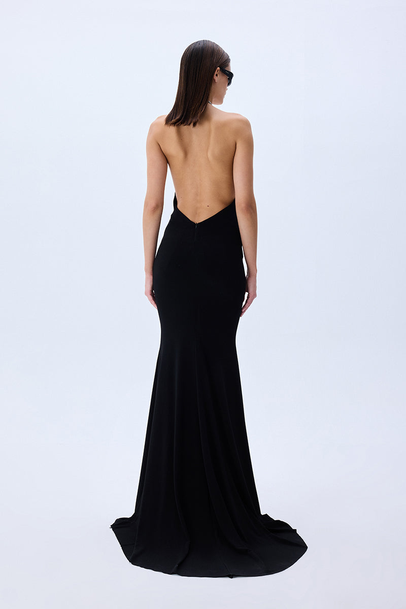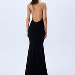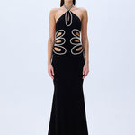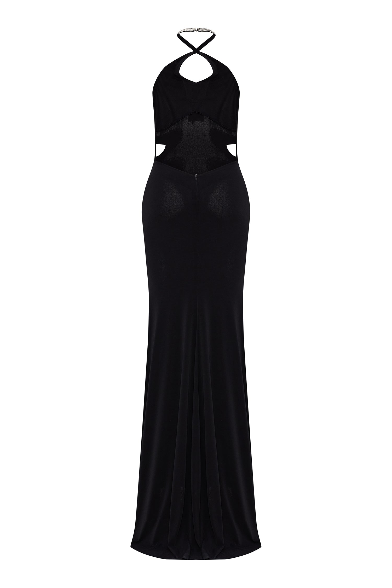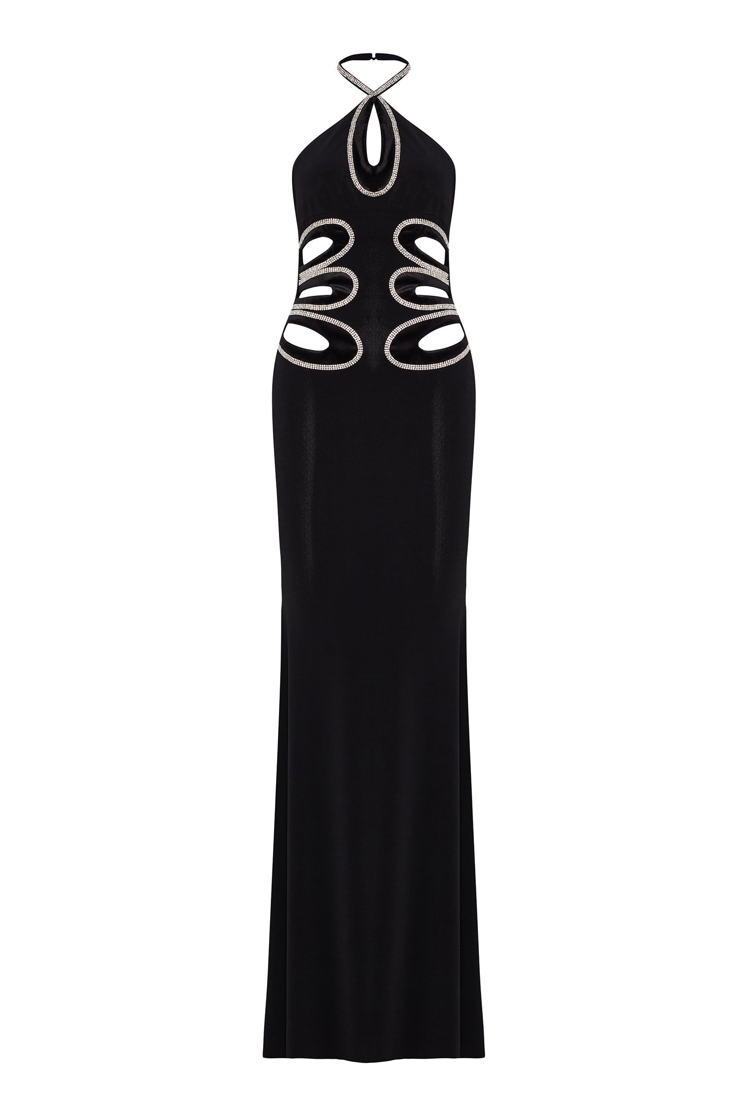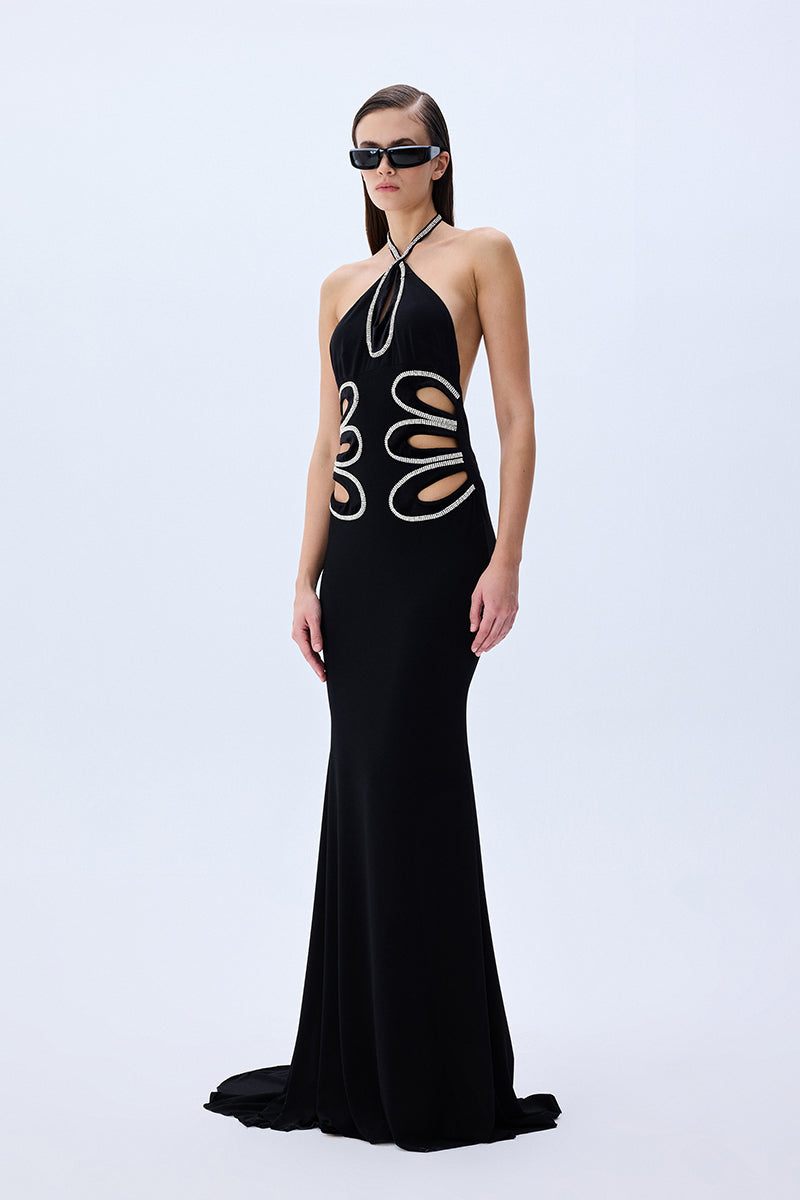 Black jersey dress commands attention with sculptural cutouts framed by crystal borders, contouring the body with precision and light. The halter neckline and floor-length silhouette evoke sensual minimalism, delivering high-impact elegance with every step.