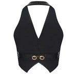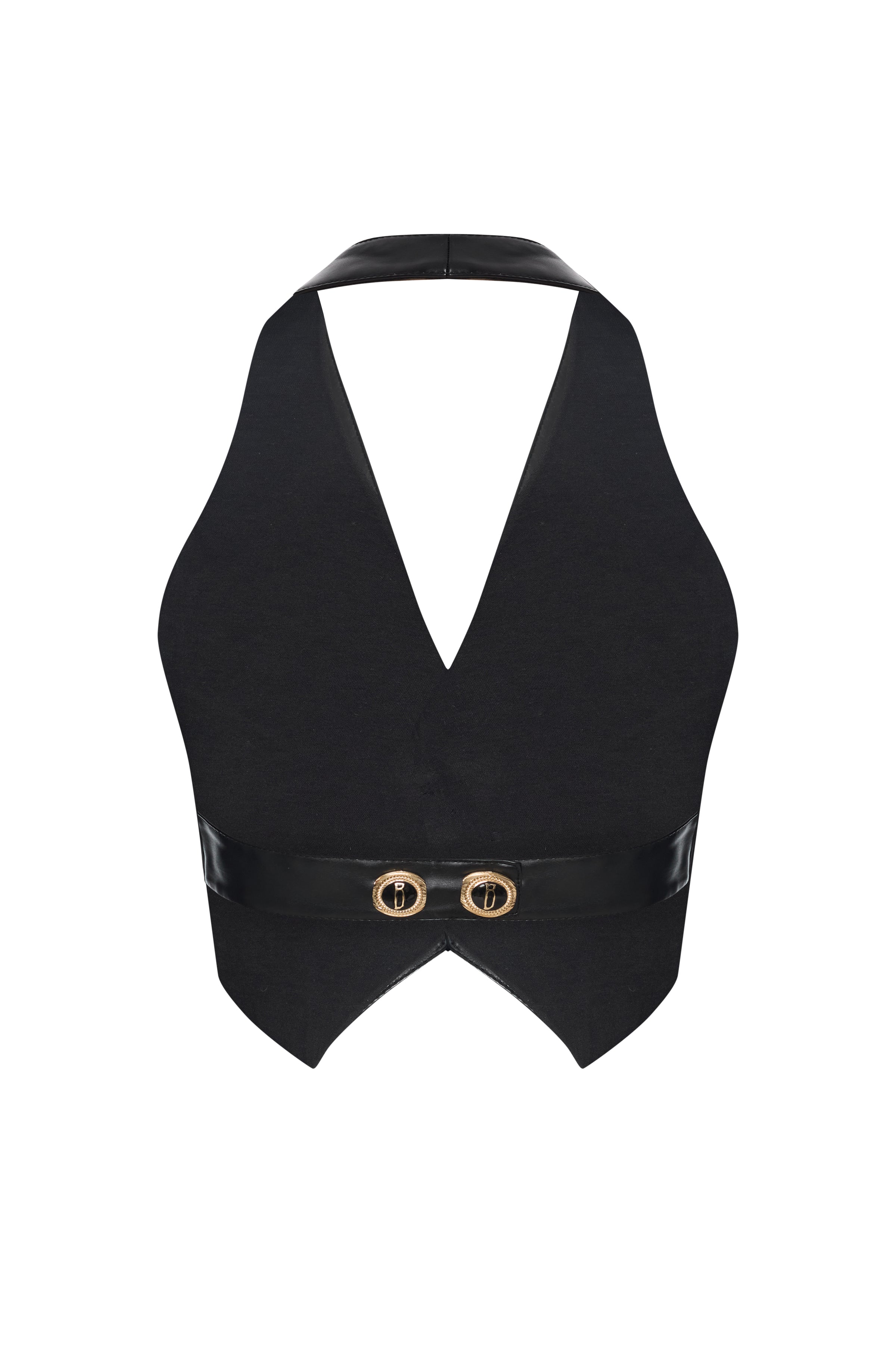 Black leather backless vest explores the tension between sharp tailoring and sensual minimalism. Defined by a plunging neckline and signature RV-stamped buttons, the open-back design reimagines classic suiting with bold, contemporary allure.