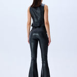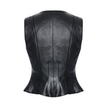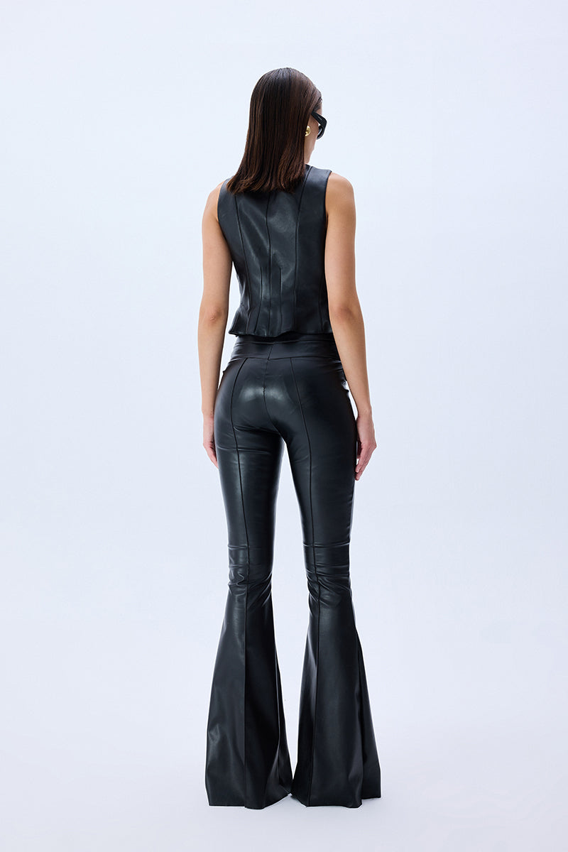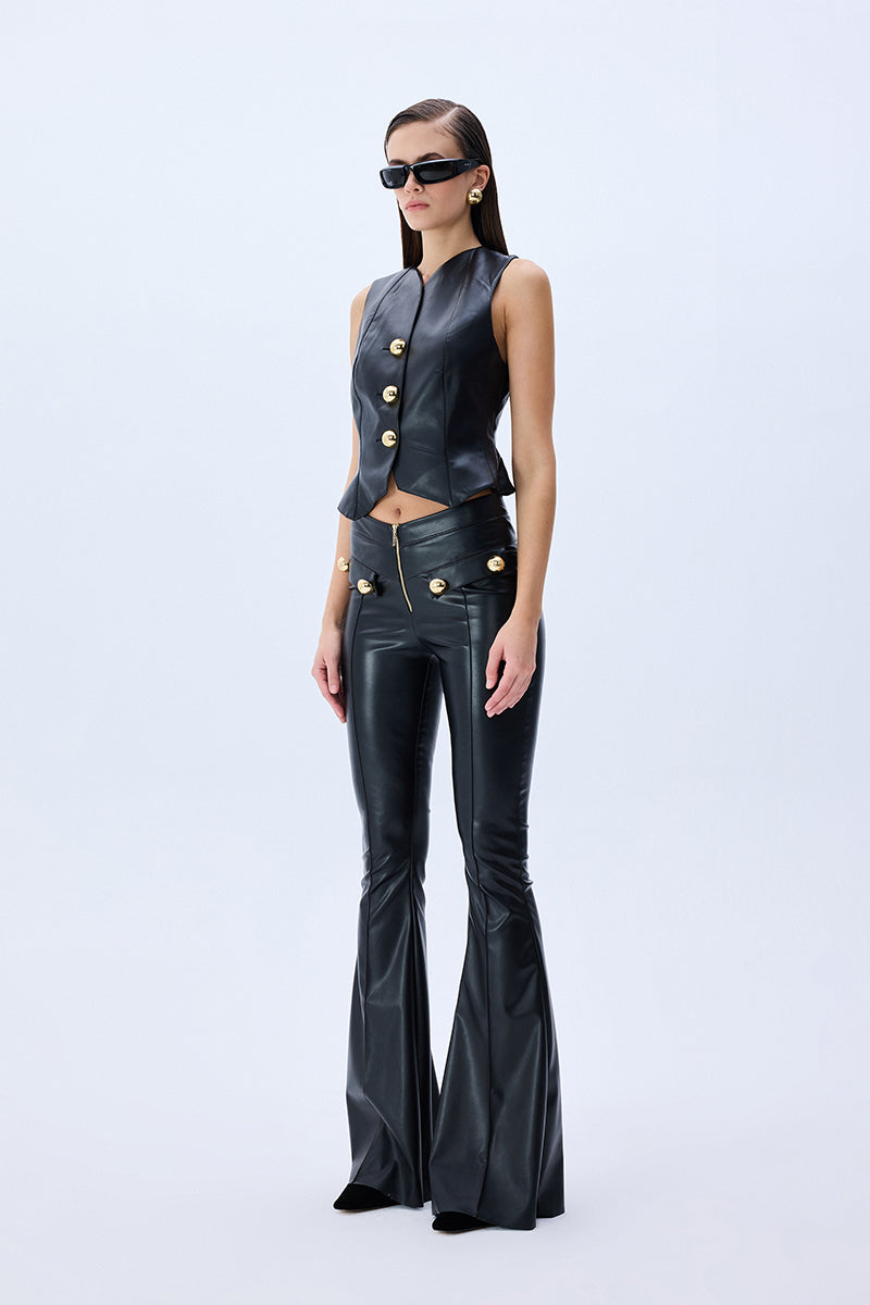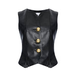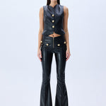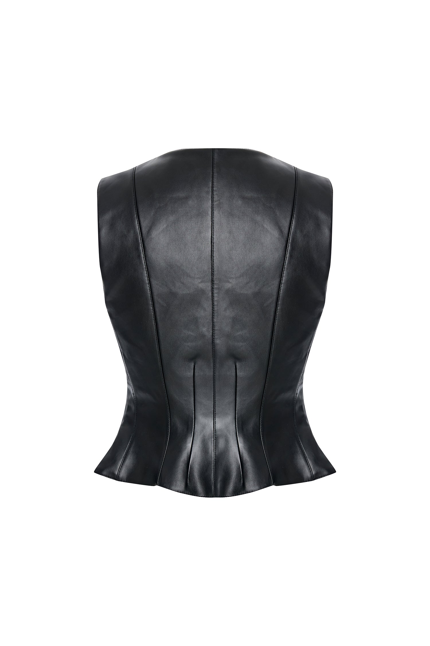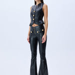Black leather stretchy vest is tailored to define the waist with precision and ease. Crafted from supple stretch leather and detailed with sculptural seams and gold buttons, it offers a confident, body-conscious silhouette with timeless edge.