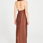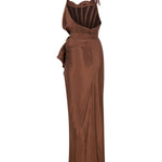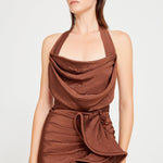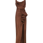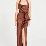 Make a statement in our Brown Halter Neck Maxi Dress, boasting elegant drape and a daring high slit.