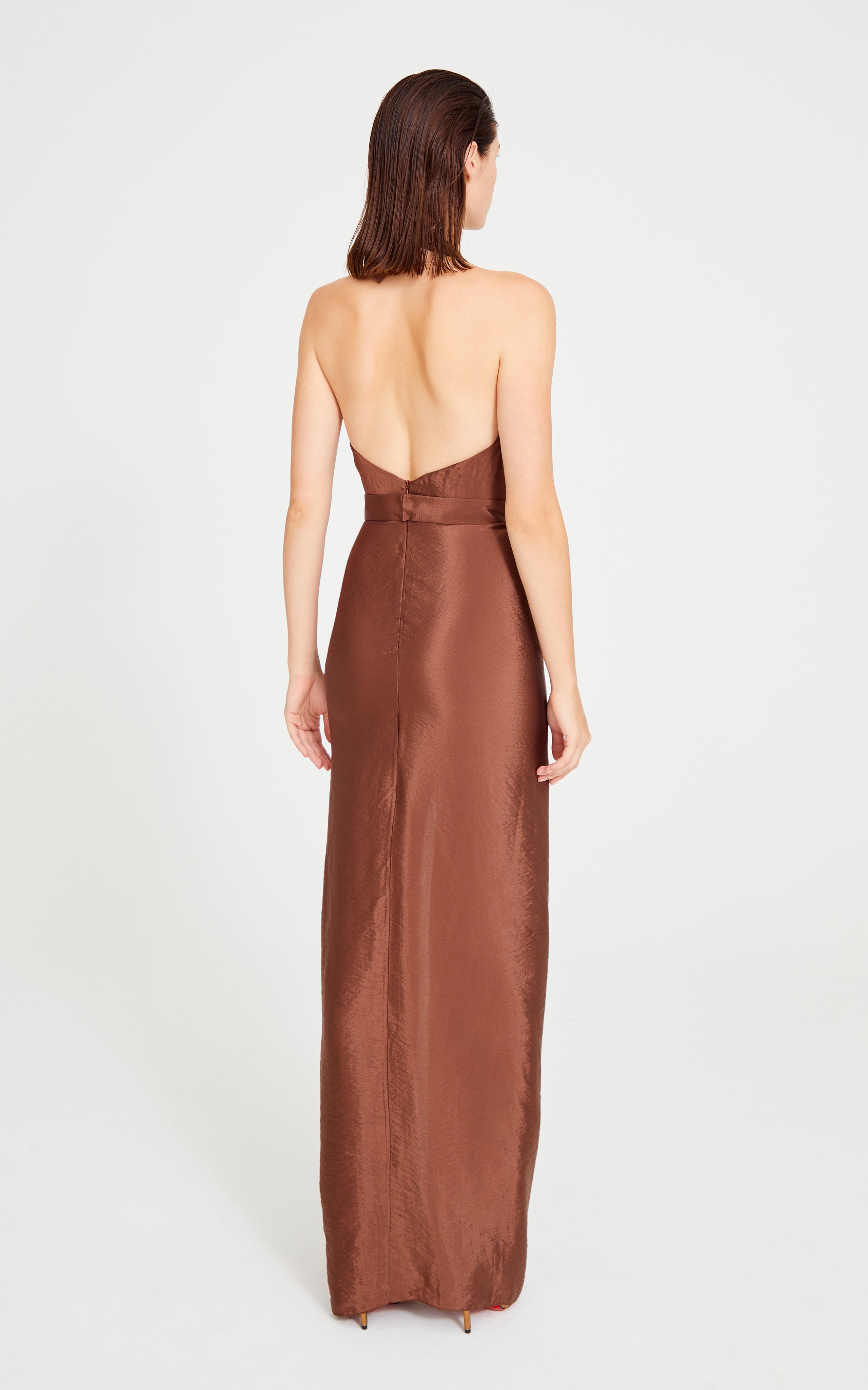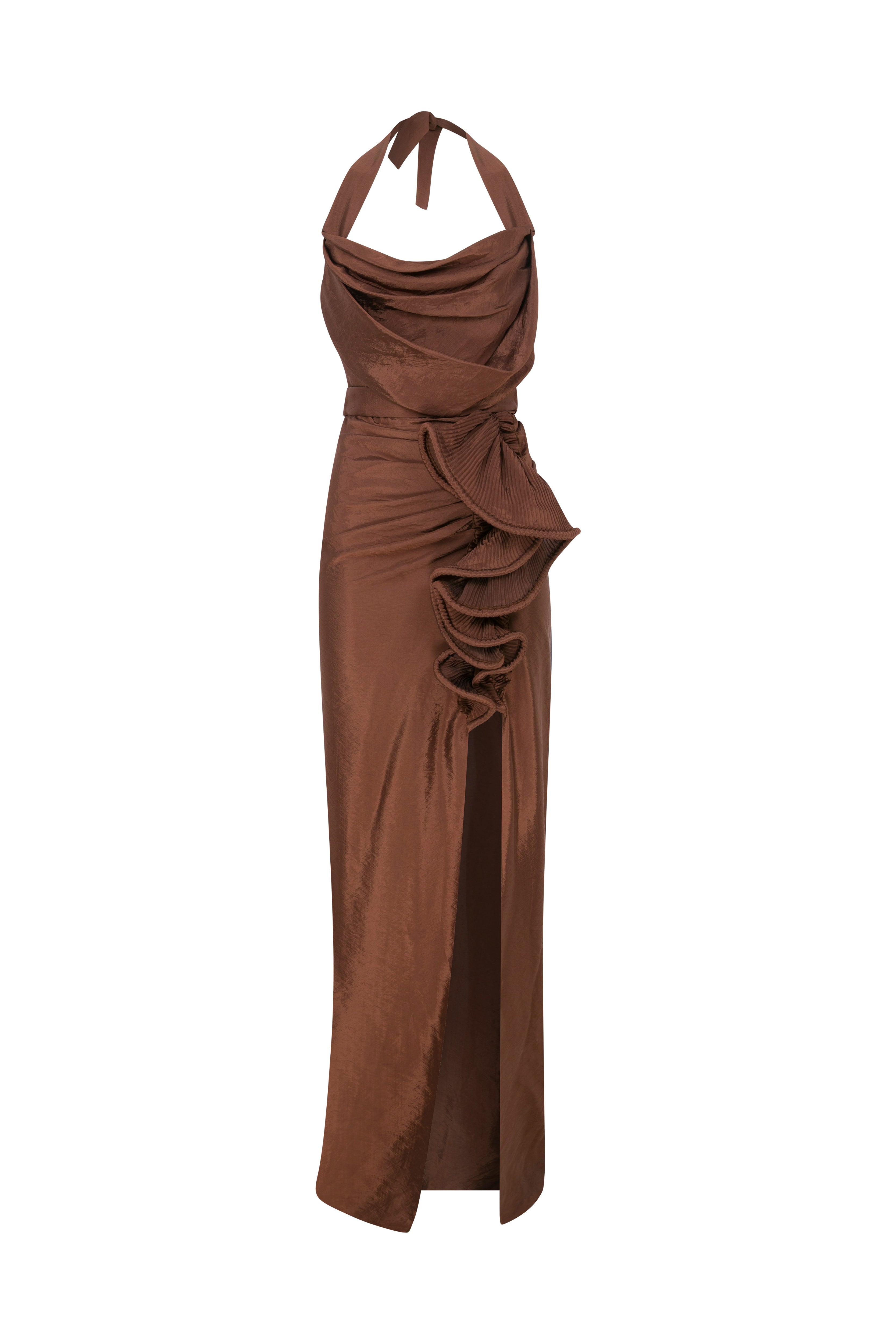 Brown Halter Neck Maxi Dress With Drape And High Slit Details
