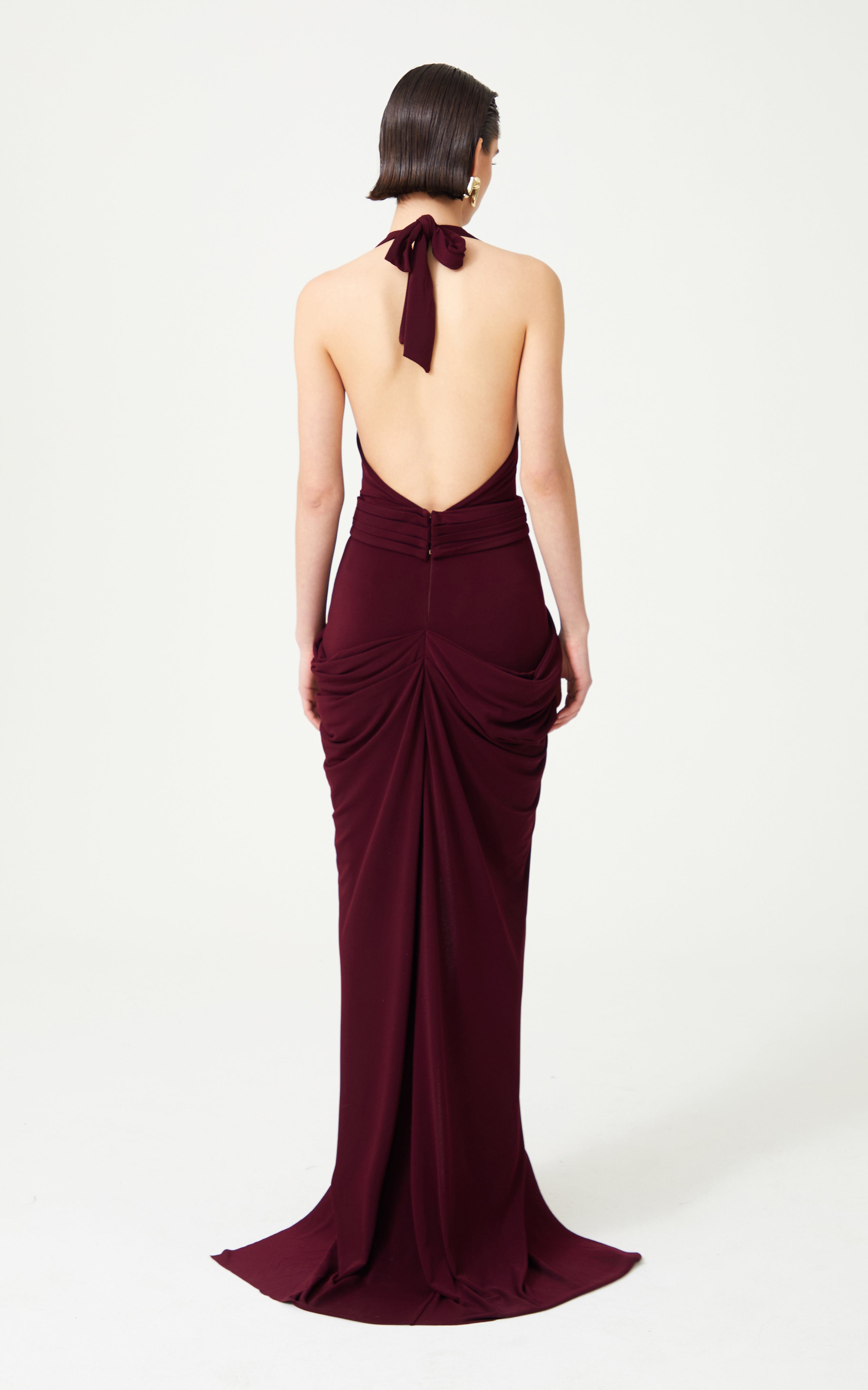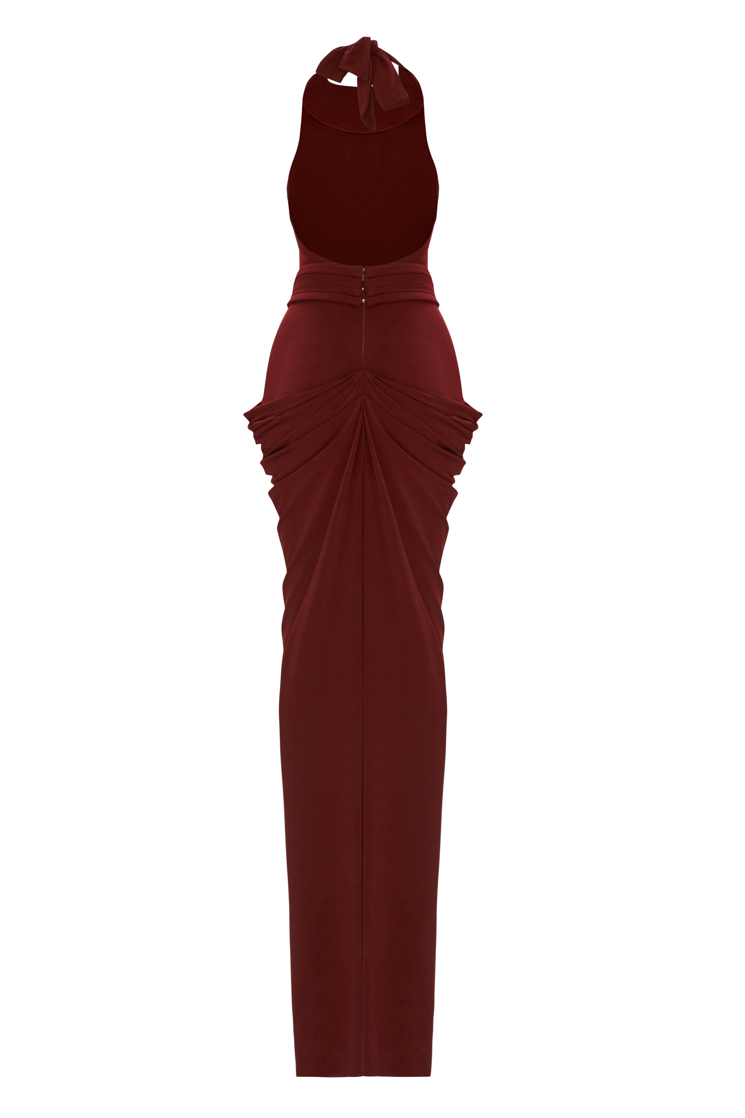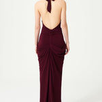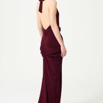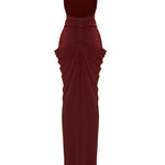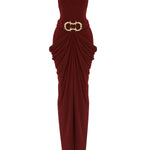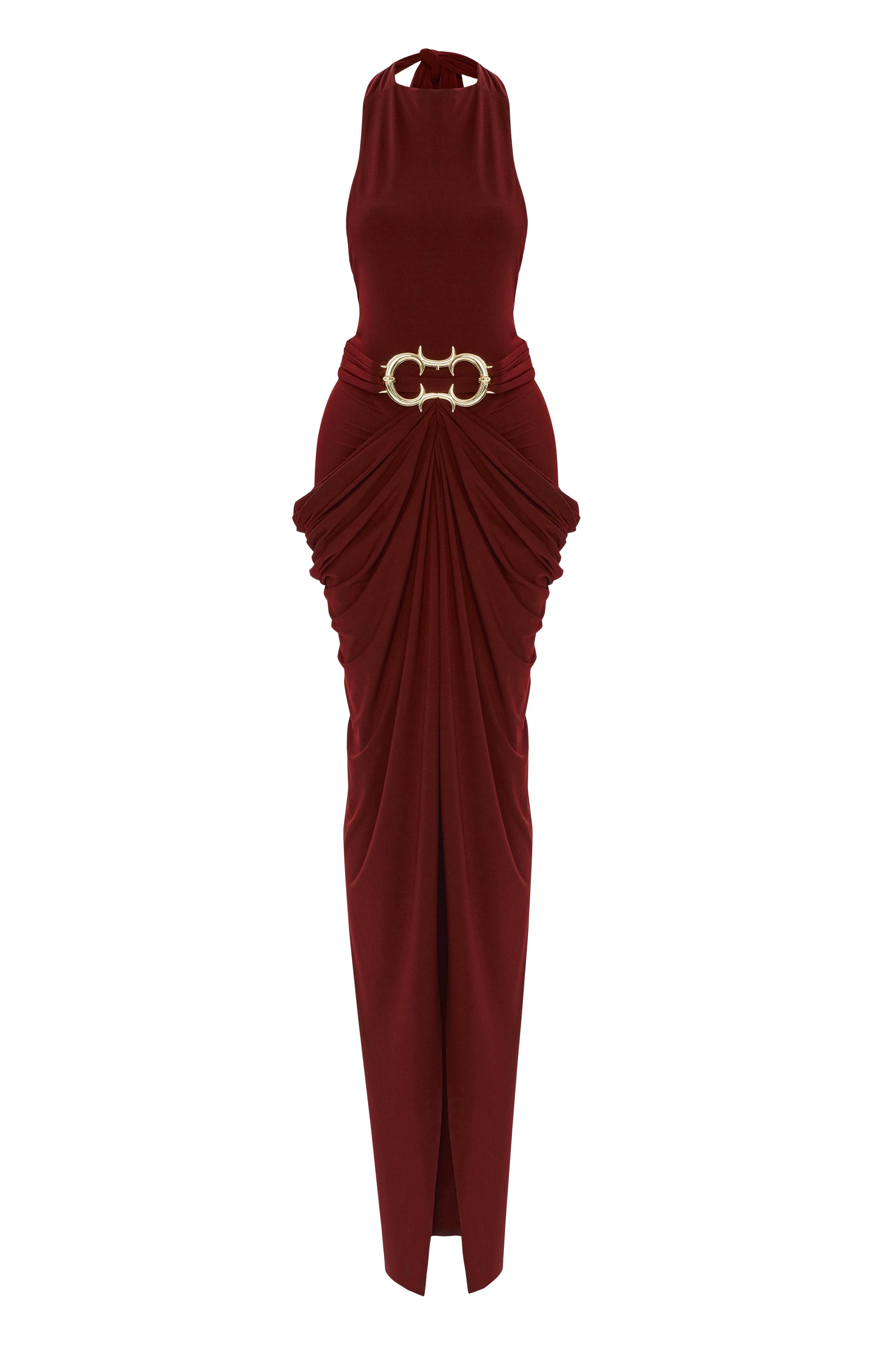 The Burgundy Halter Neck Draped Backless Gown features a stunning gold buckle detail, adding a touch of opulence to its elegant design.