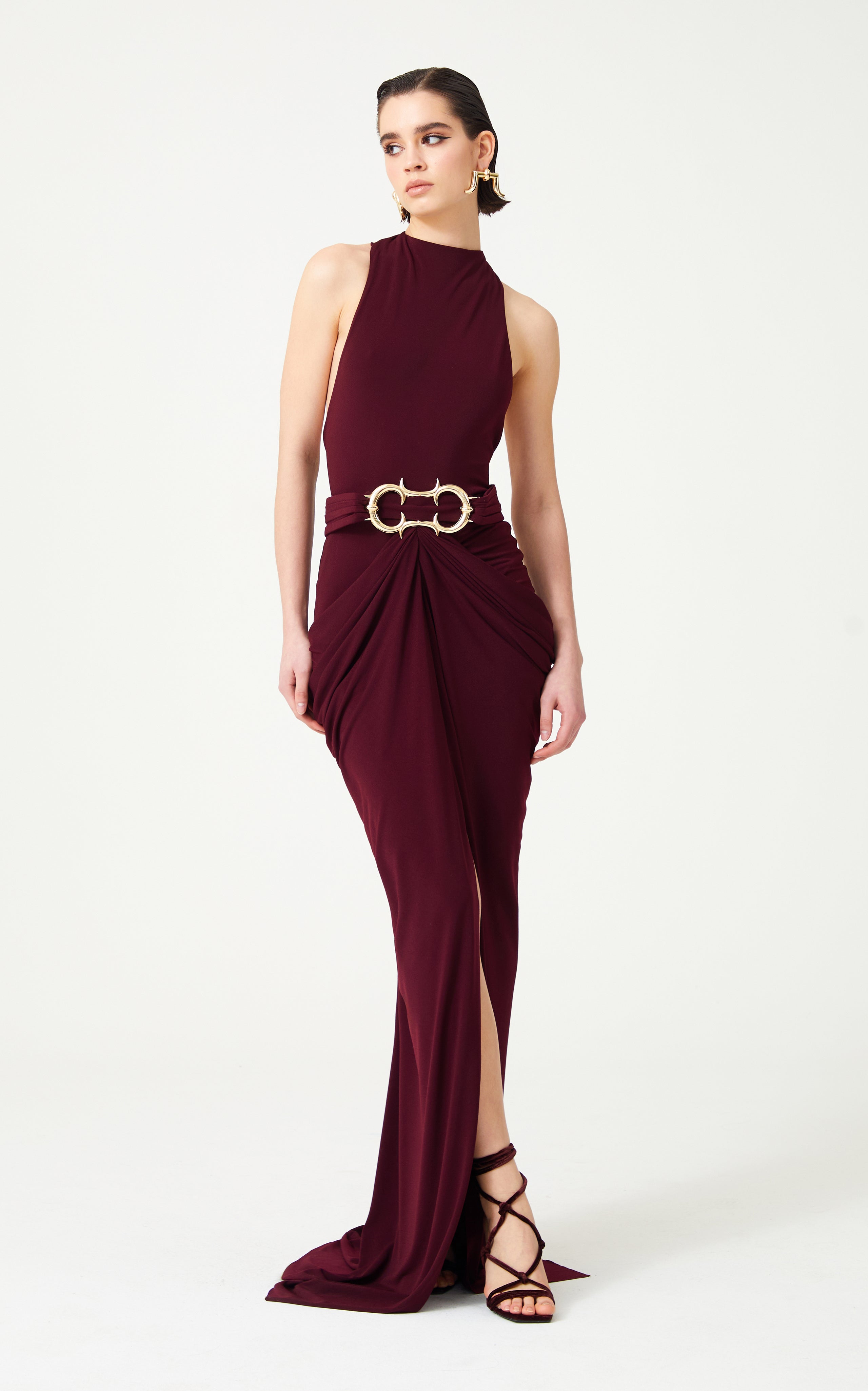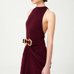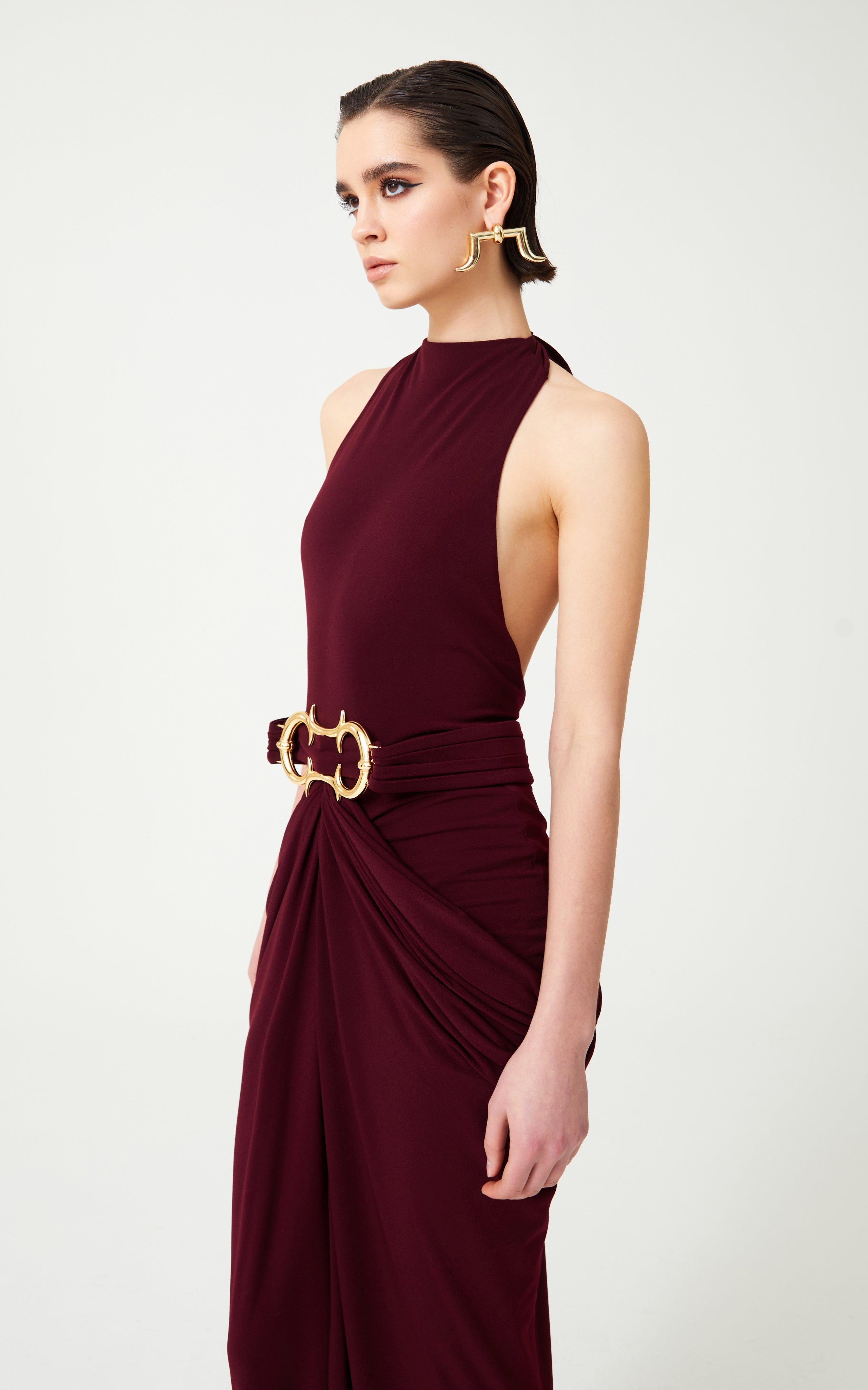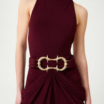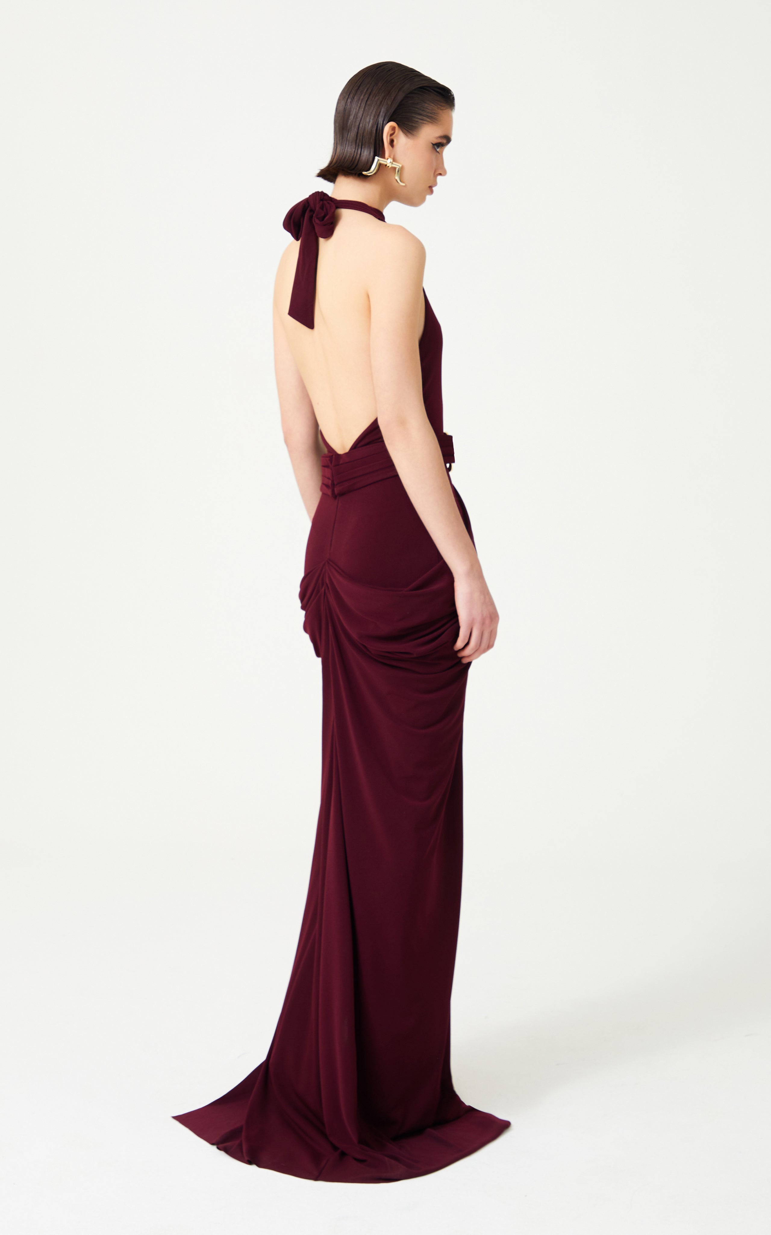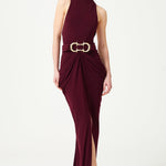 Burgundy Halter Neck Draped Backless Gown With Gold Buckle Detail