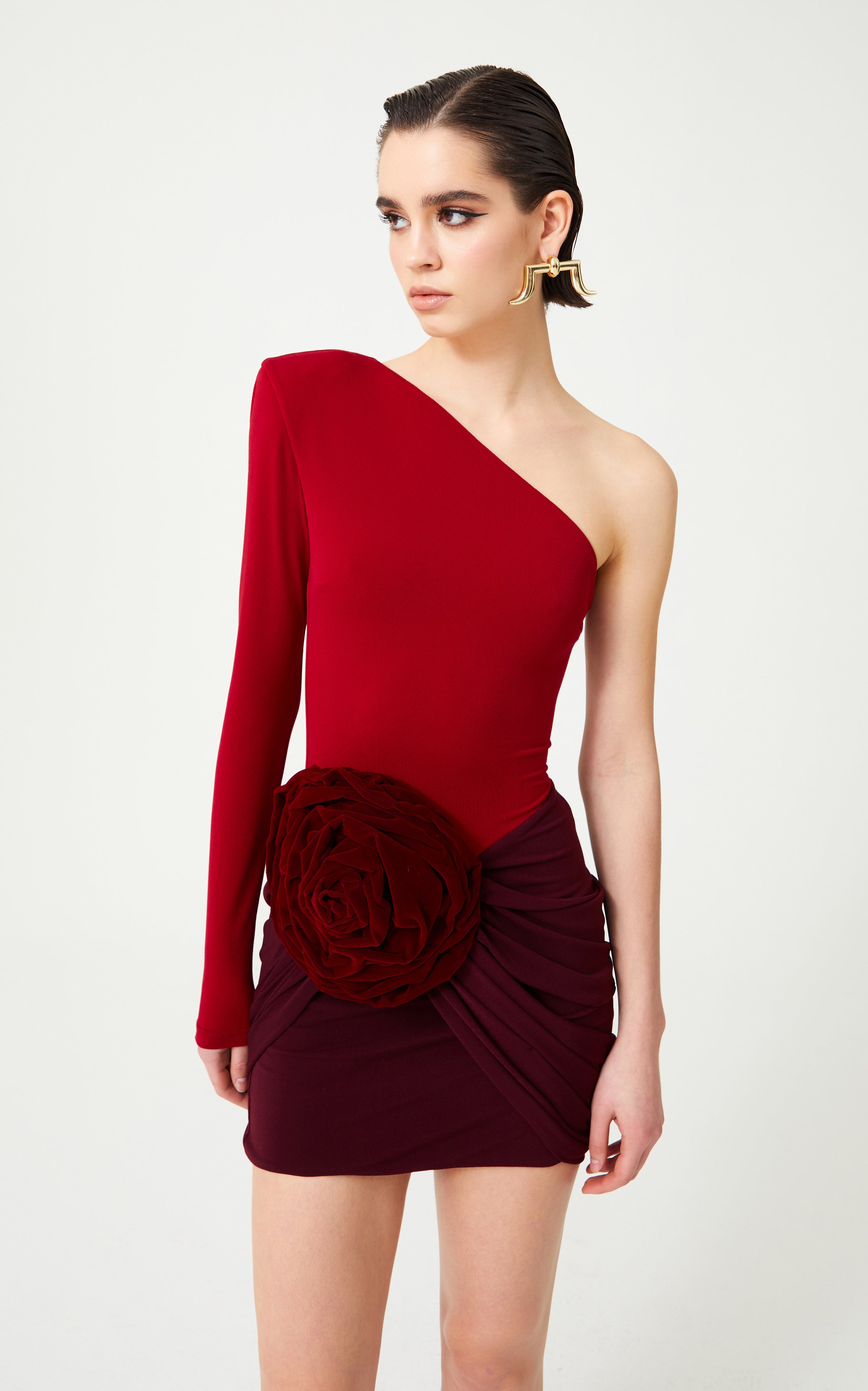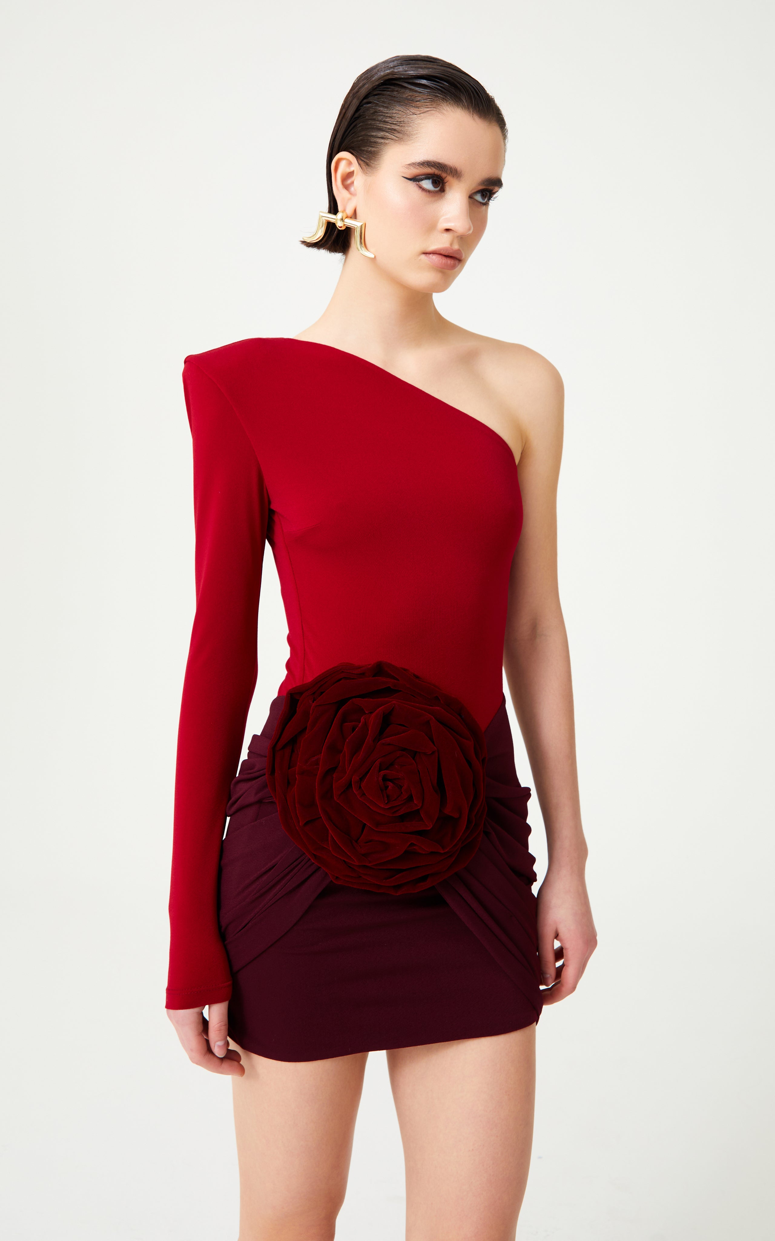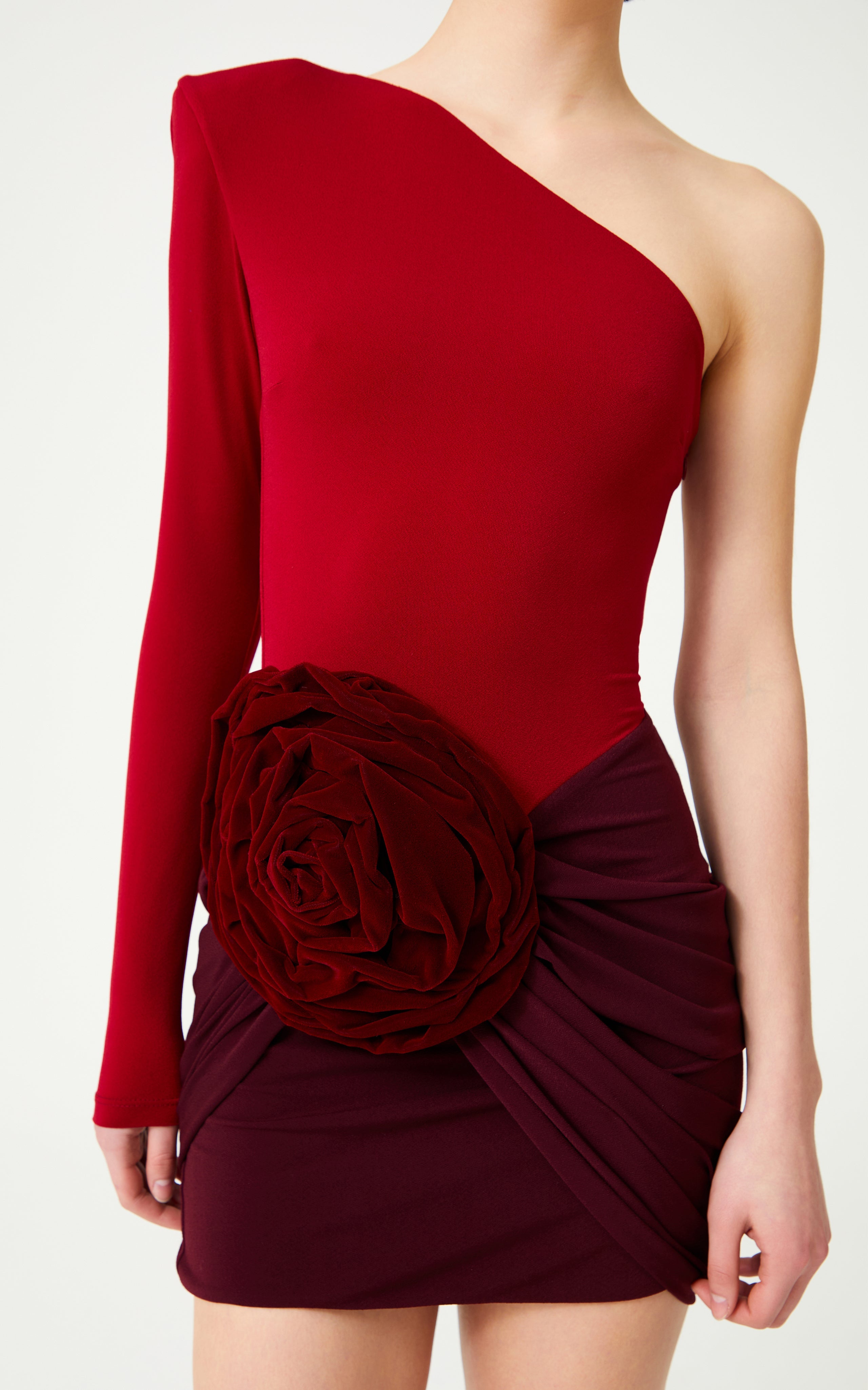 Burgundy Red Stretchy One Shouldered Mini Dress With Velvet Flower Detail