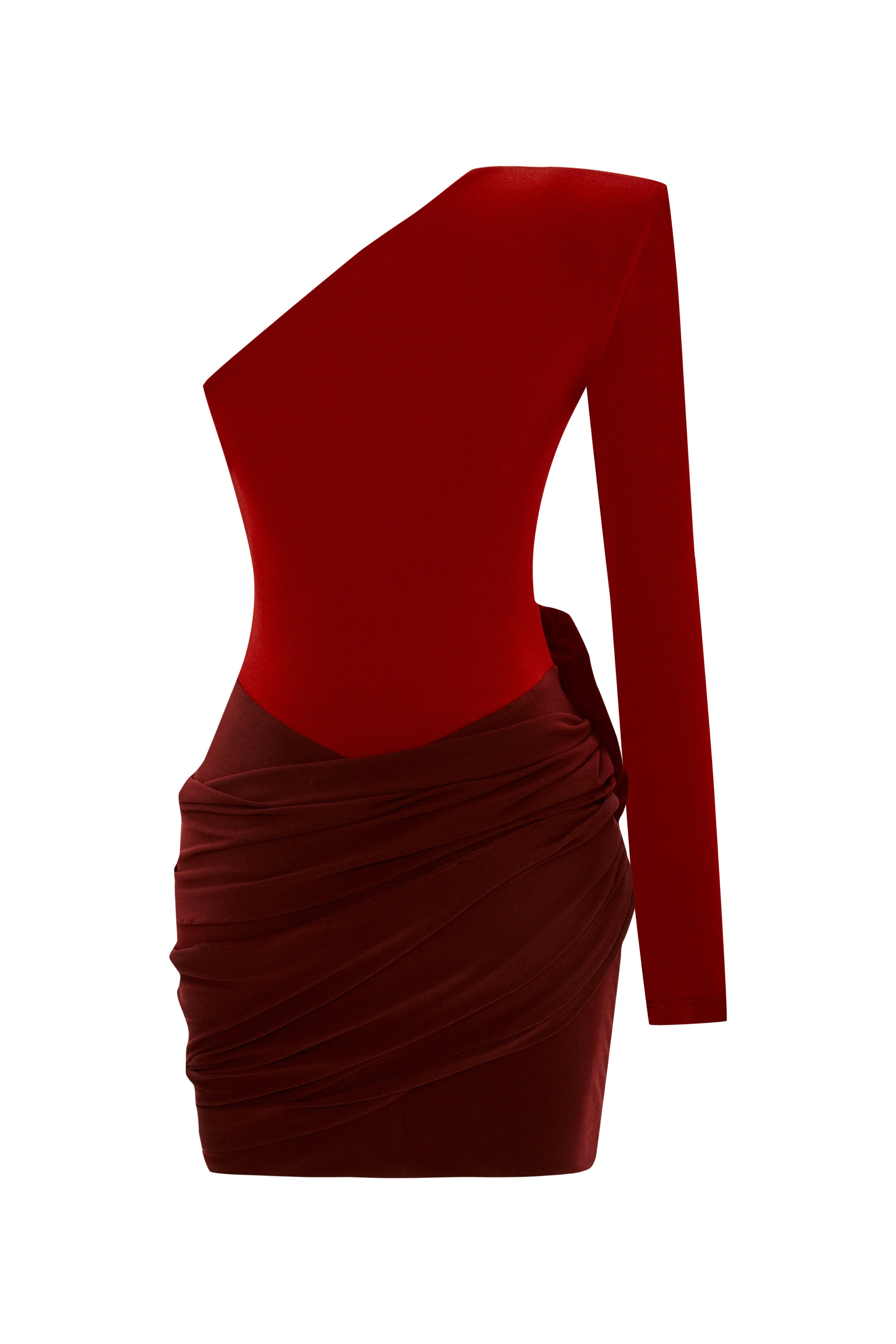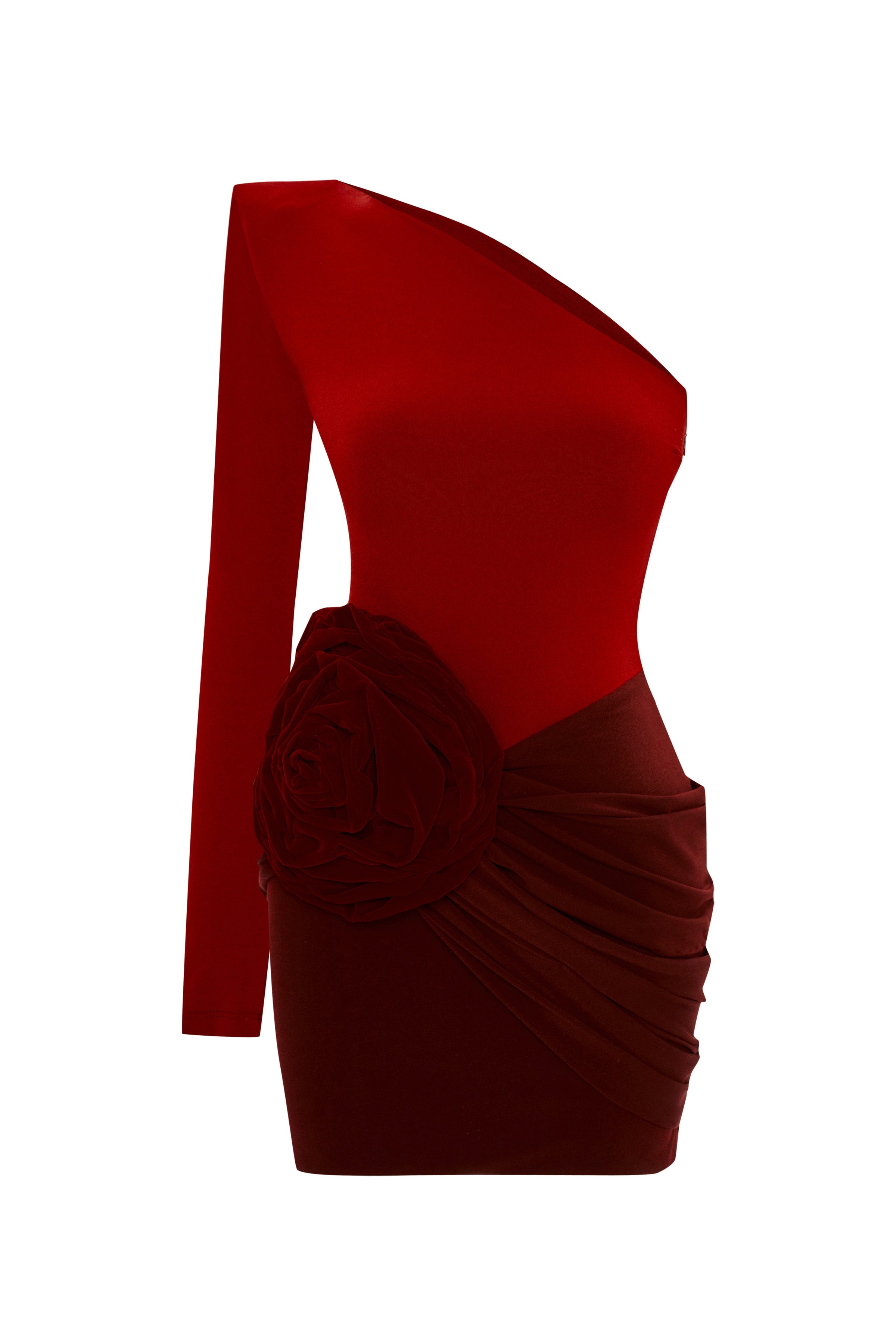 The Burgundy Red Stretchy One-Shouldered Mini Dress boasts a charming velvet flower detail, adding a touch of elegance and flair to this stylish ensemble.
