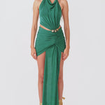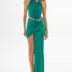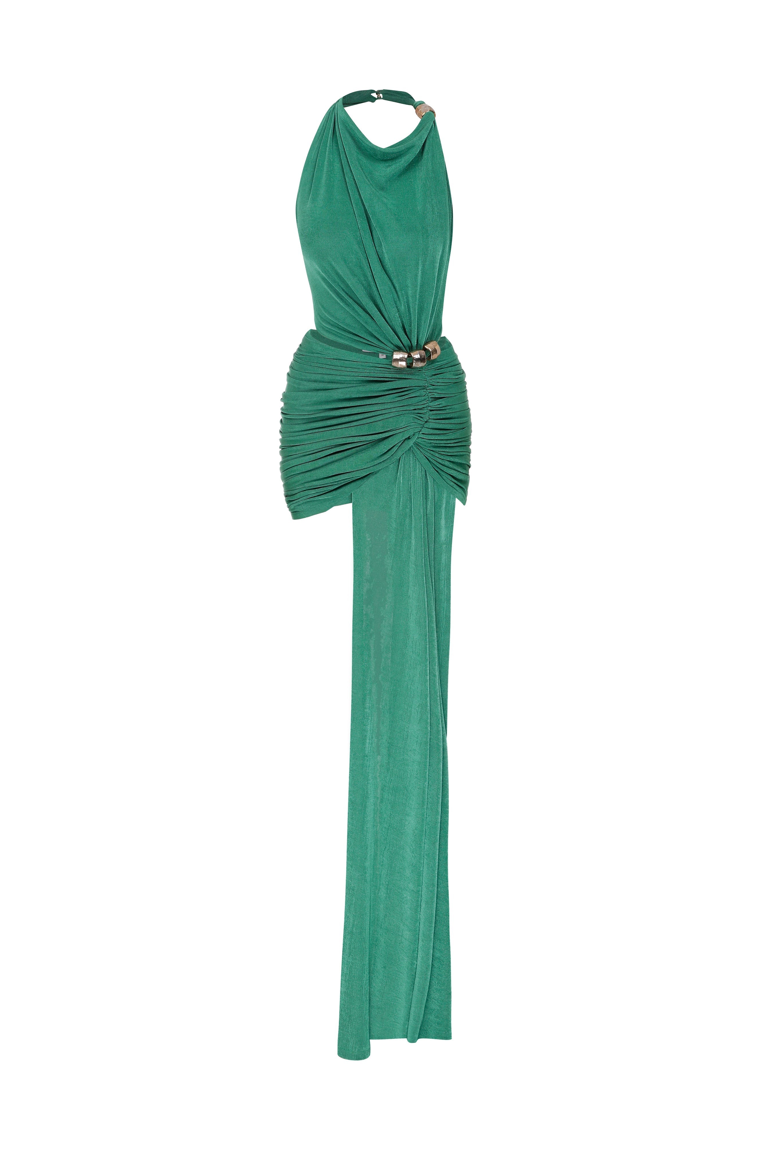 Green Buzzy Halter Neck Mini Dress with Tail and Gold Accessory Details