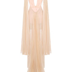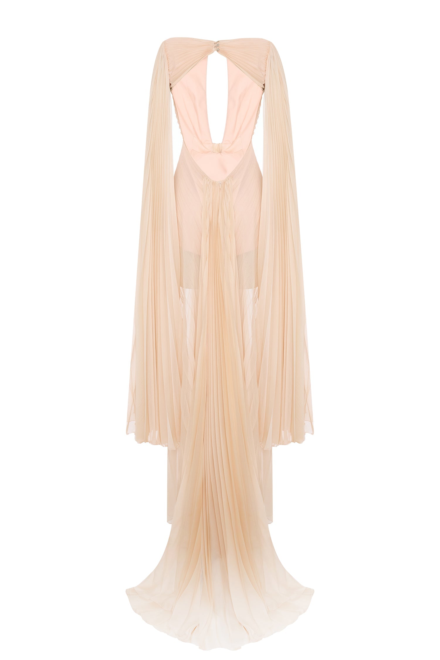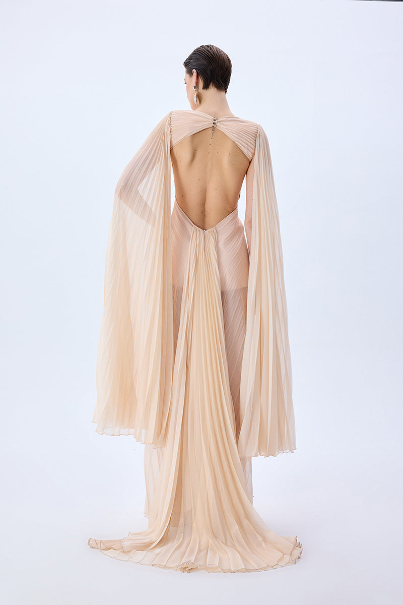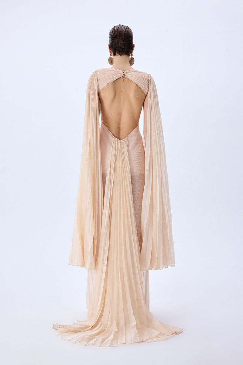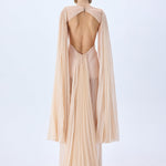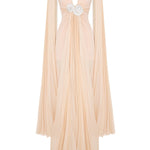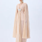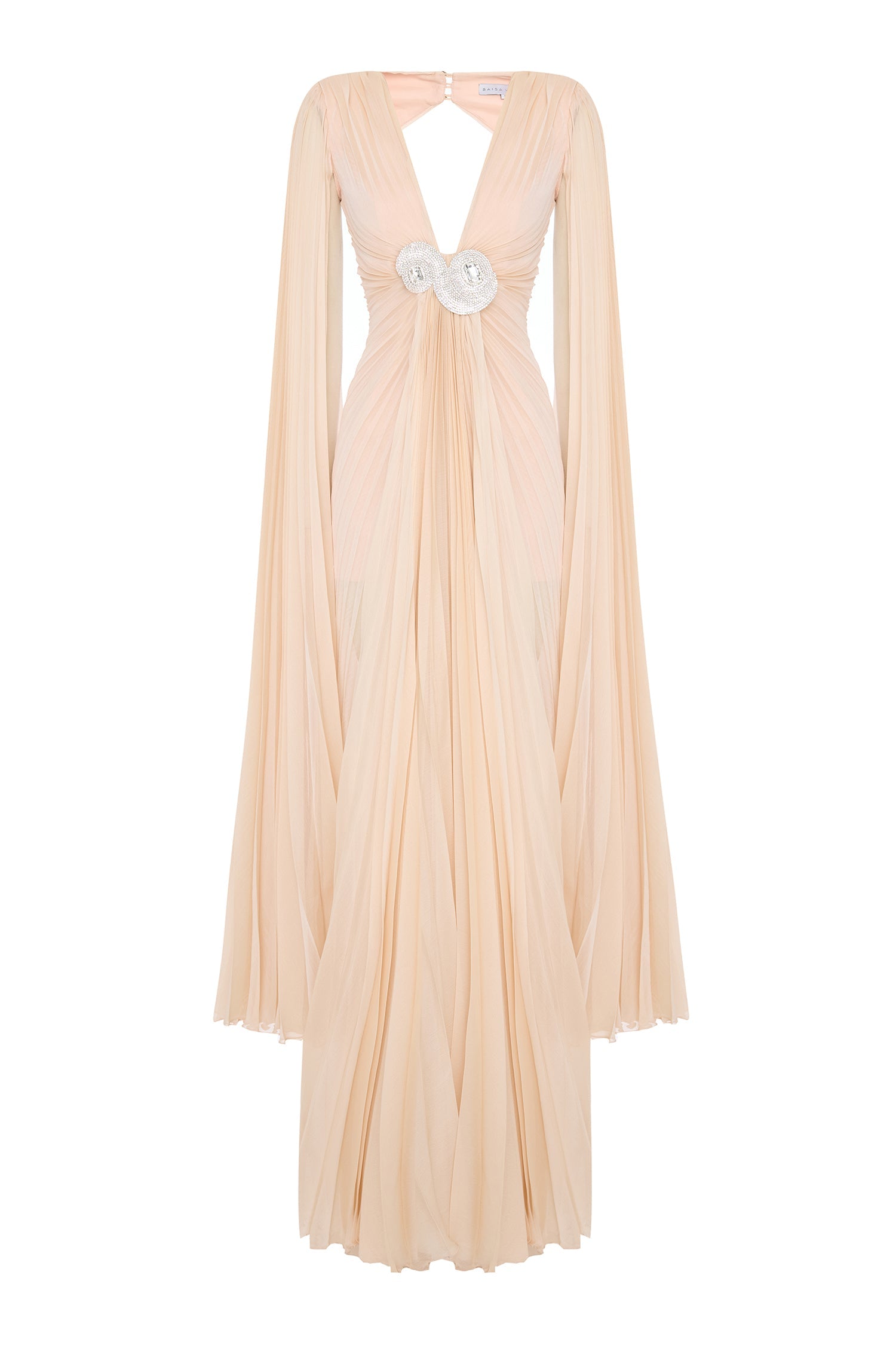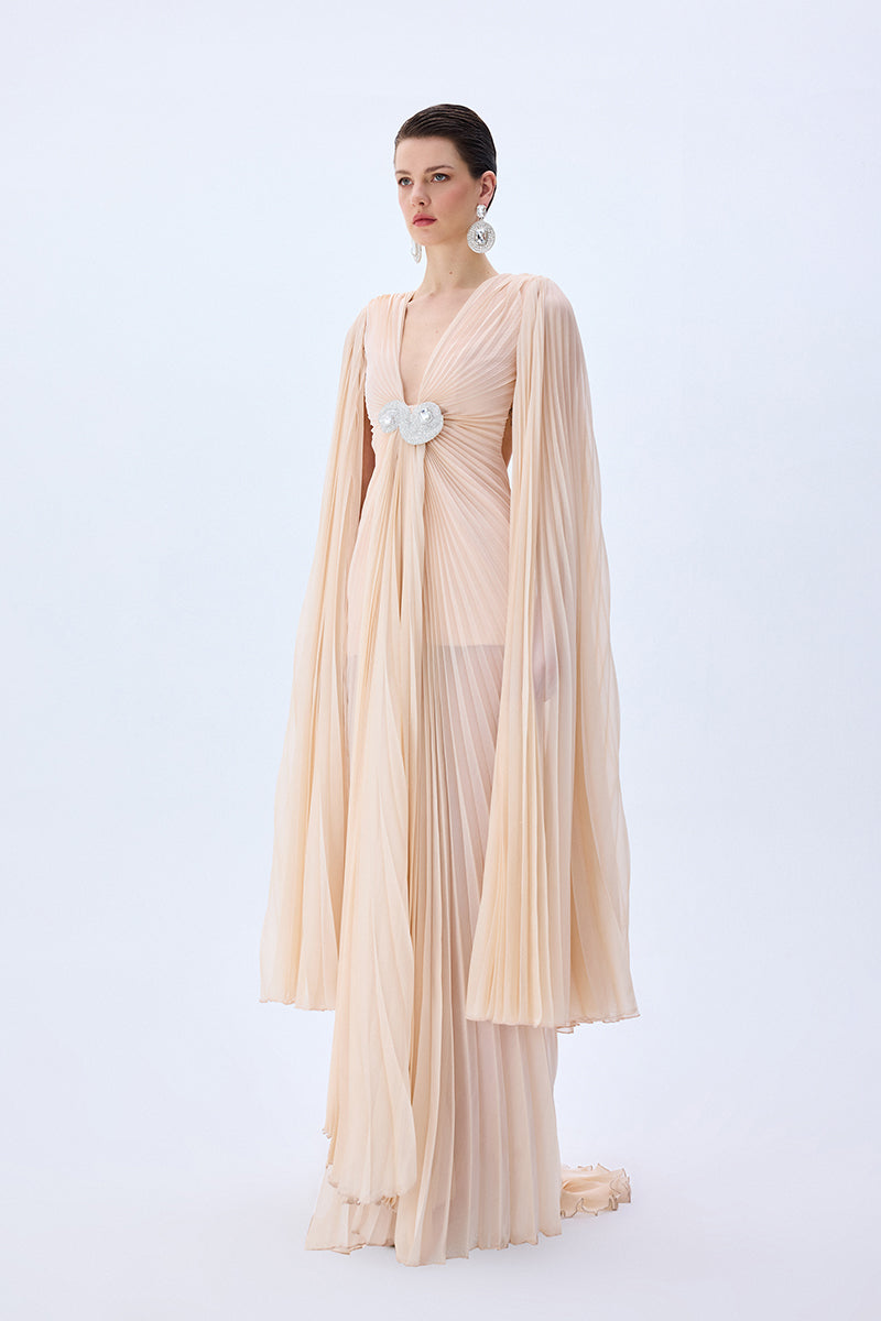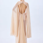 Billowing pleated chiffon flows from a crystal-embellished belt, creating ethereal movement with every step. The soft champagne tone blends timeless romance with a contemporary edge.