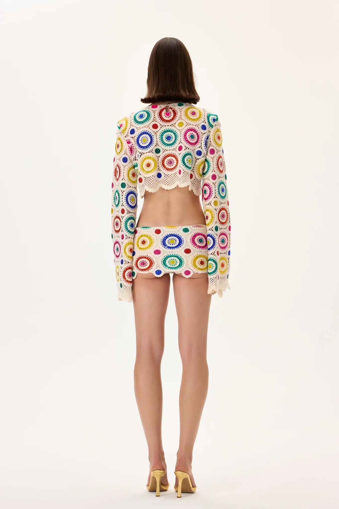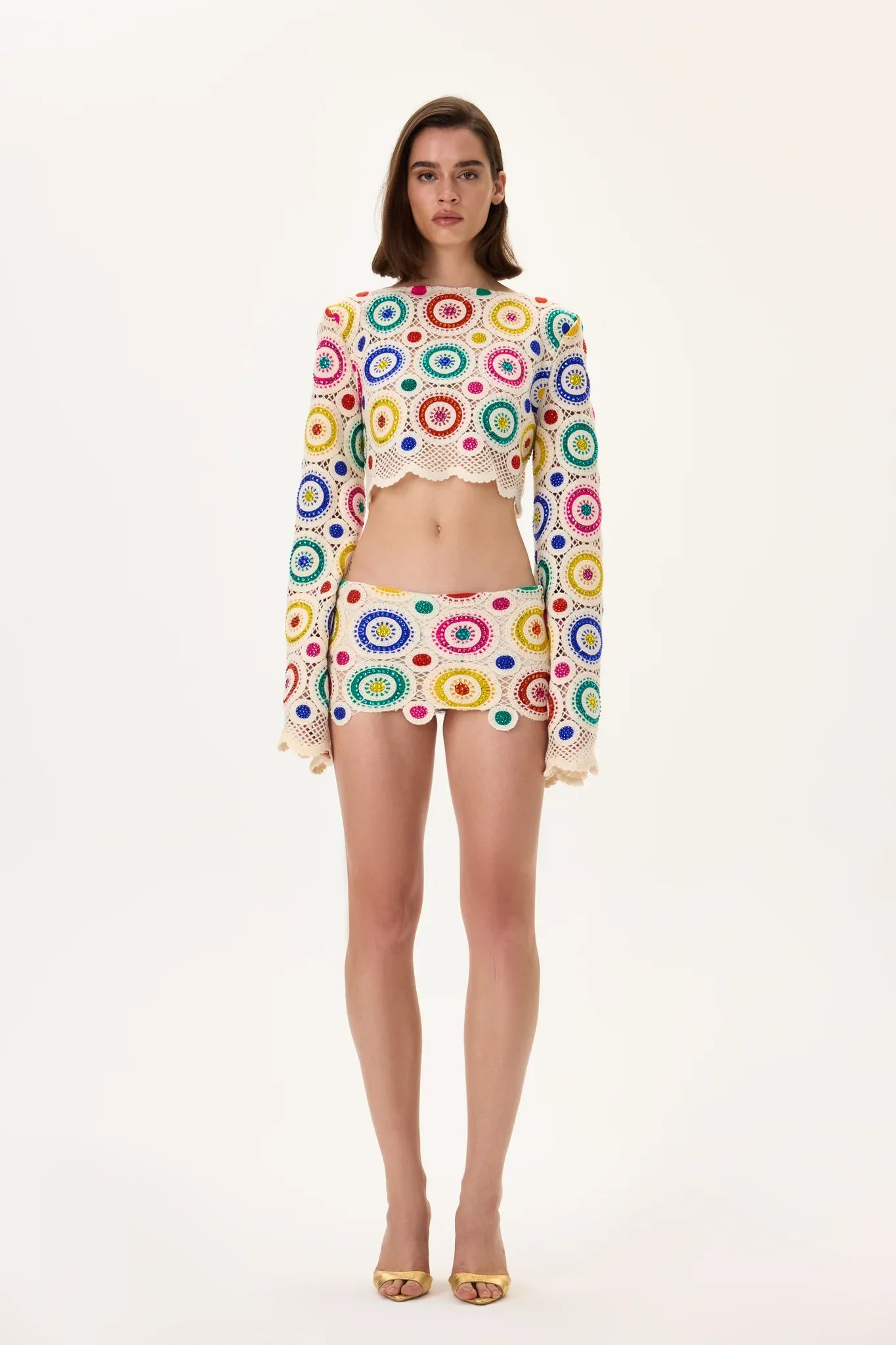 A statement crochet crop top with long sleeves, adorned with multicolor crystal patterns. Handcrafted to perfection, offering two versions — one with shimmering crystals for a bold look, and another without stones for a refined, minimalist elegance.