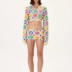 Crochet Multi Color Crystal Printed Long Sleeved Crop Top