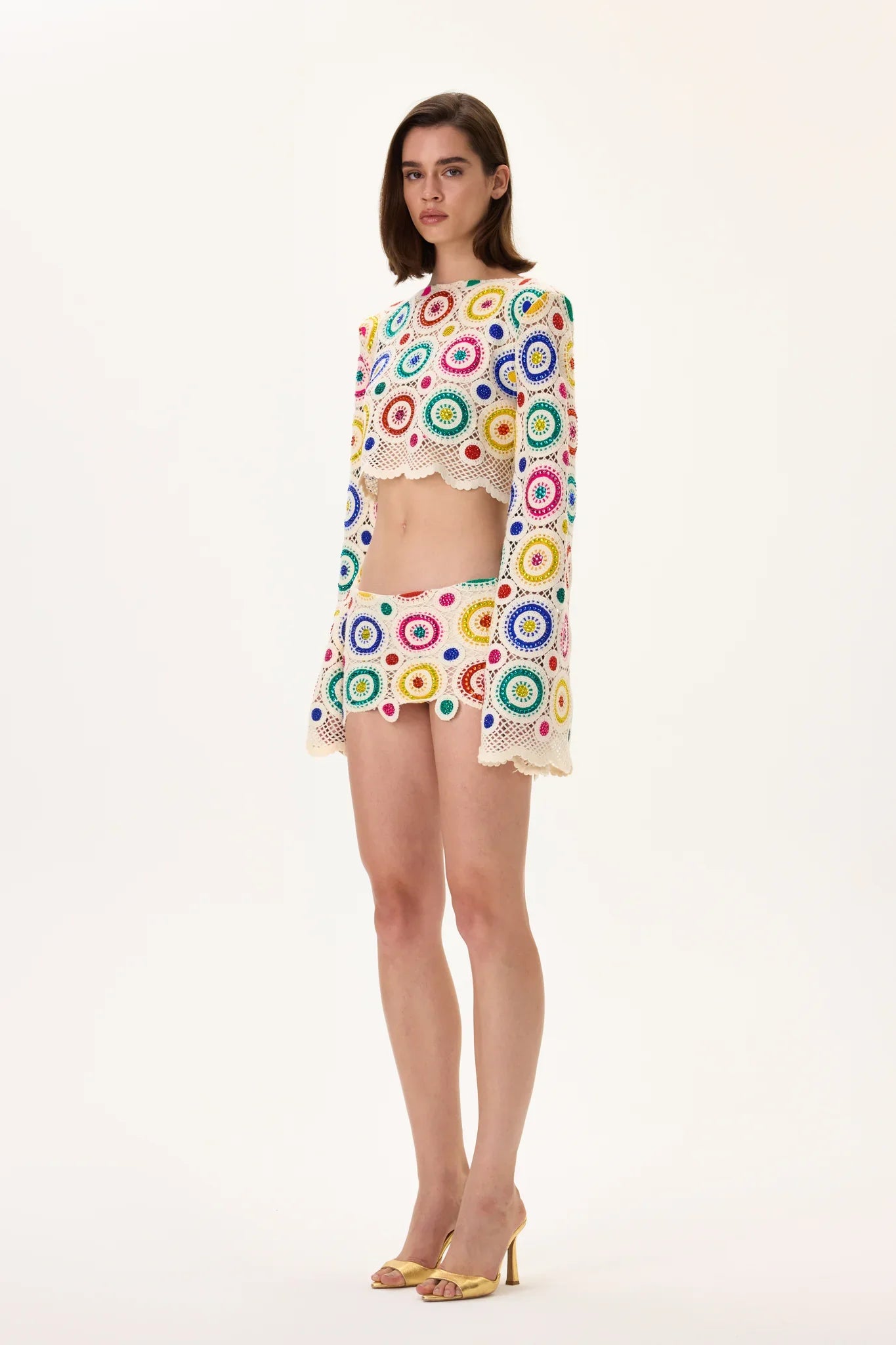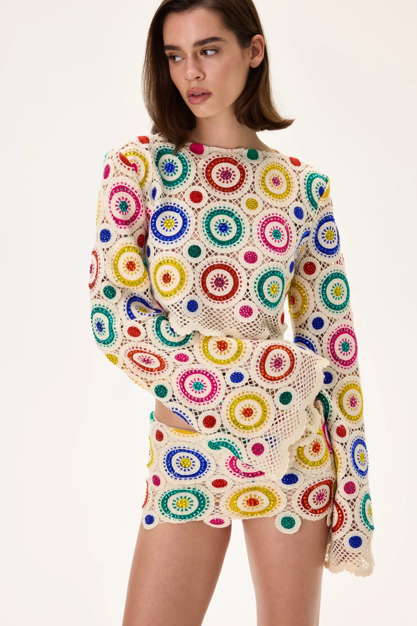 A statement crochet crop top with long sleeves, adorned with multicolor crystal patterns. Handcrafted to perfection, offering two versions — one with shimmering crystals for a bold look, and another without stones for a refined, minimalist elegance.