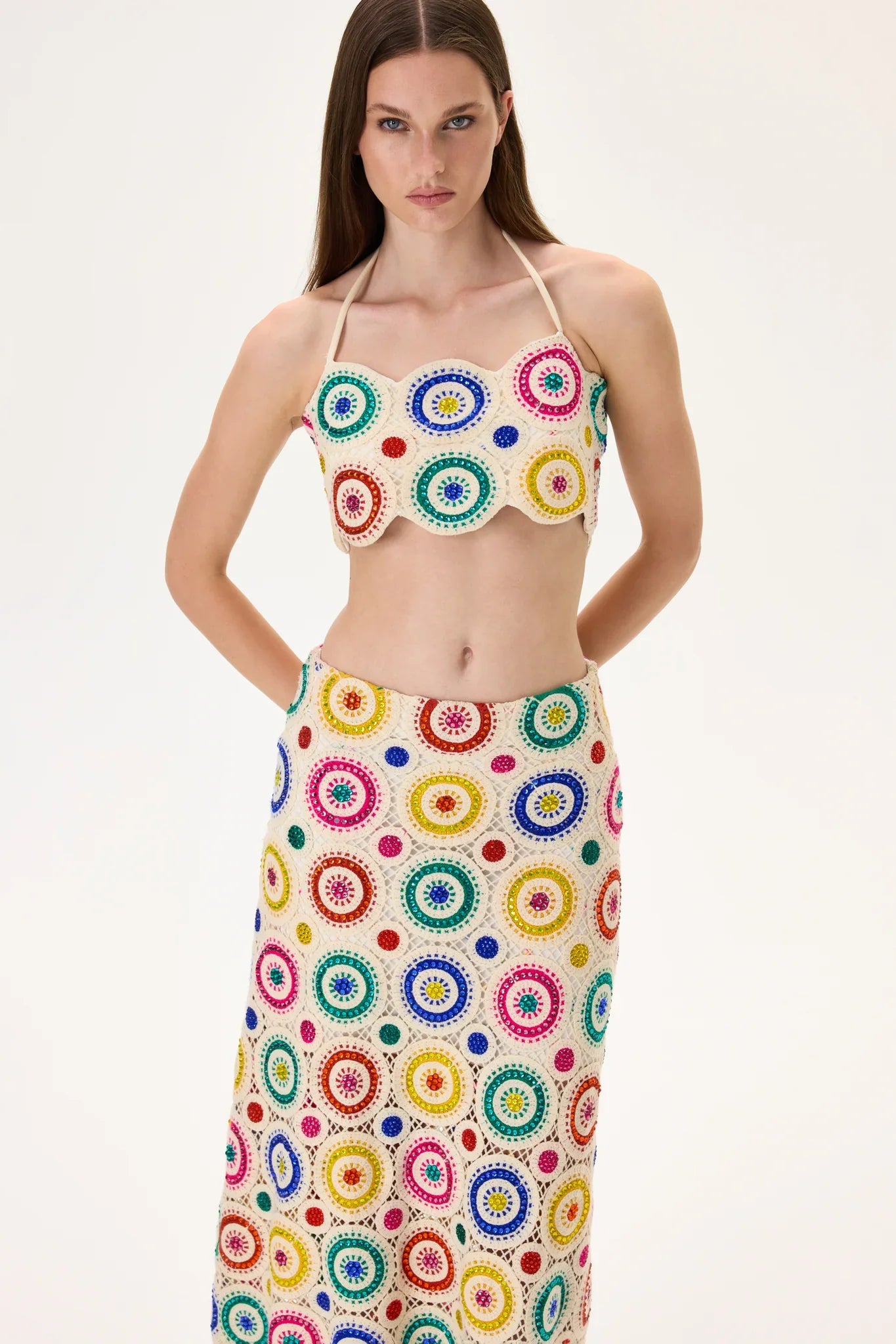 Elegant hand-crocheted midi skirt featuring multicolor crystal patterns and exquisite craftsmanship. Available in two versions — with or without stones — offering both sophisticated sparkle and timeless simplicity.