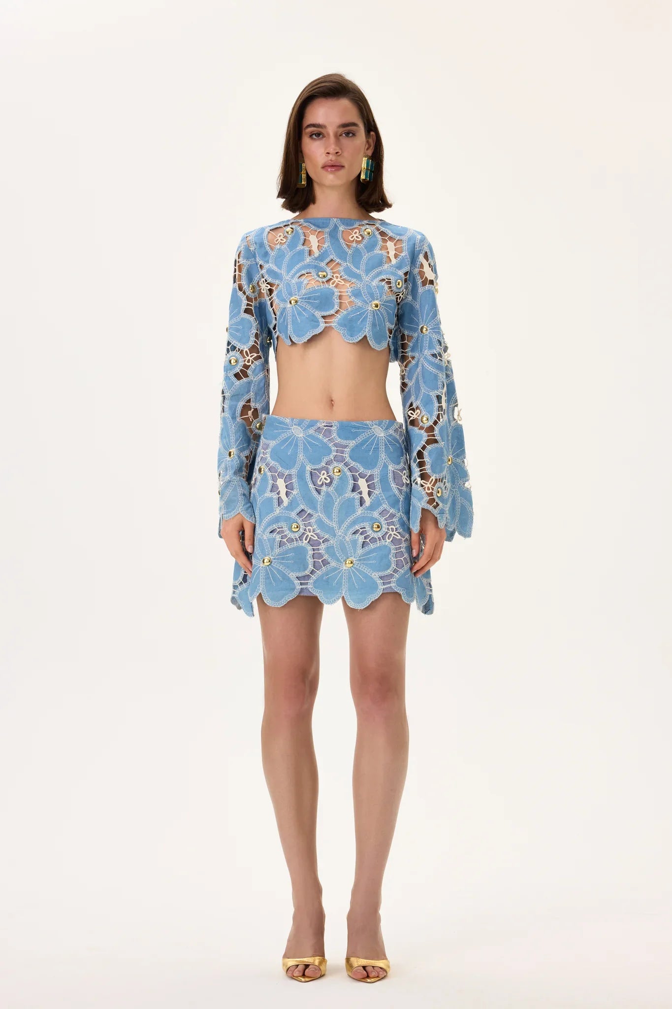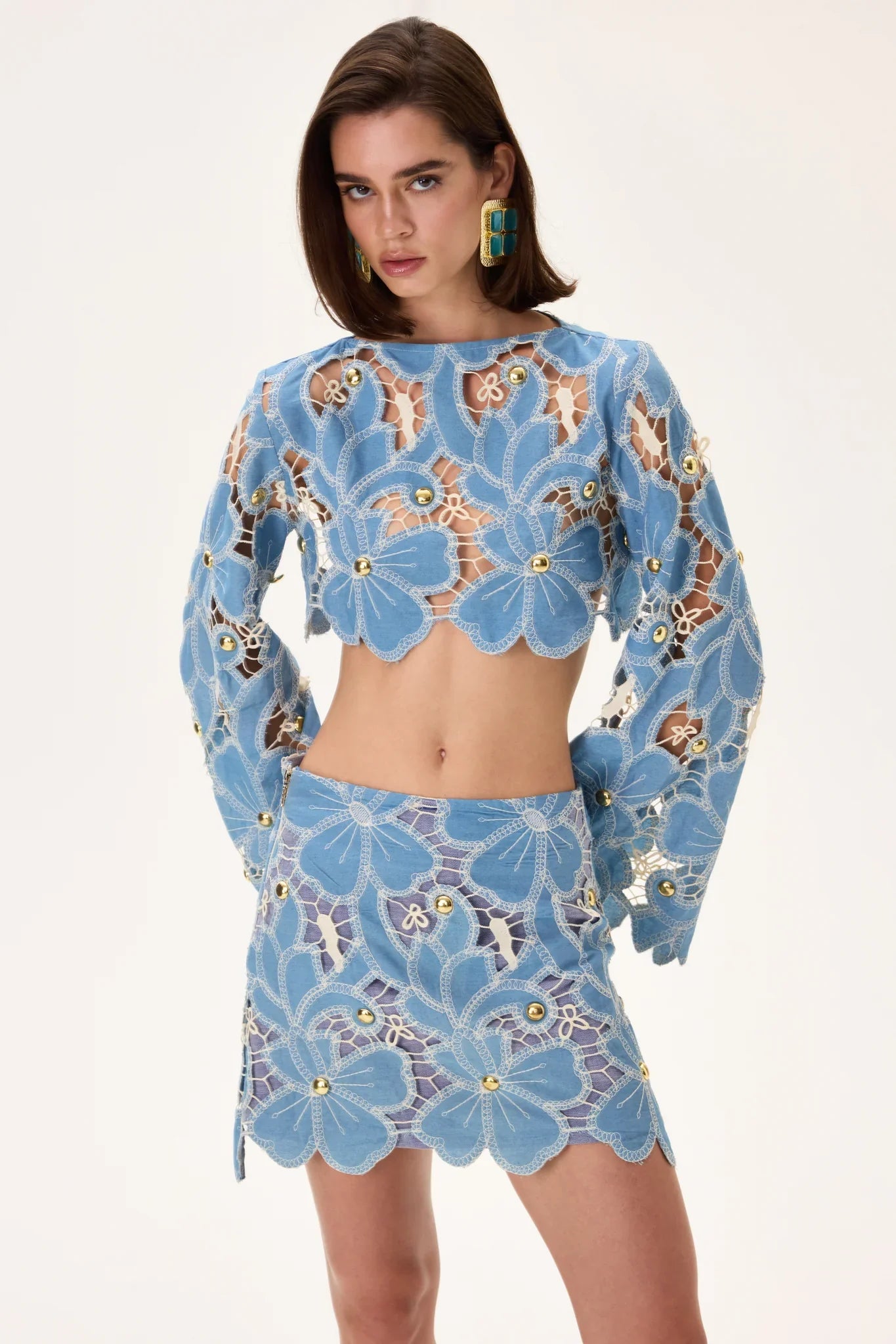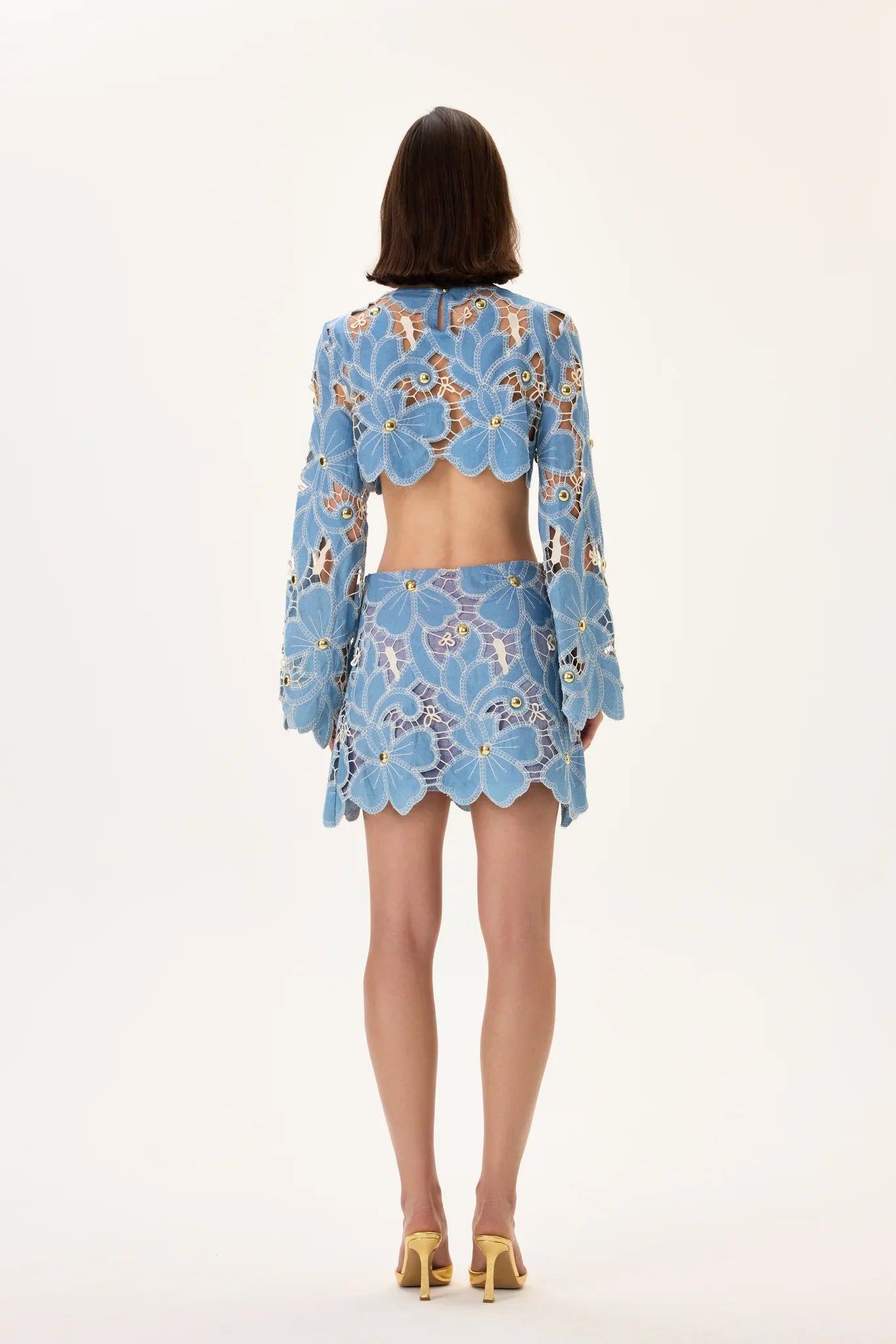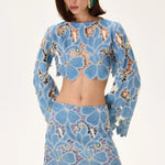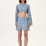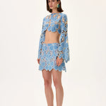 Denim & Lace Mini Skirt With Gold Metal Centered Flower Embroidery