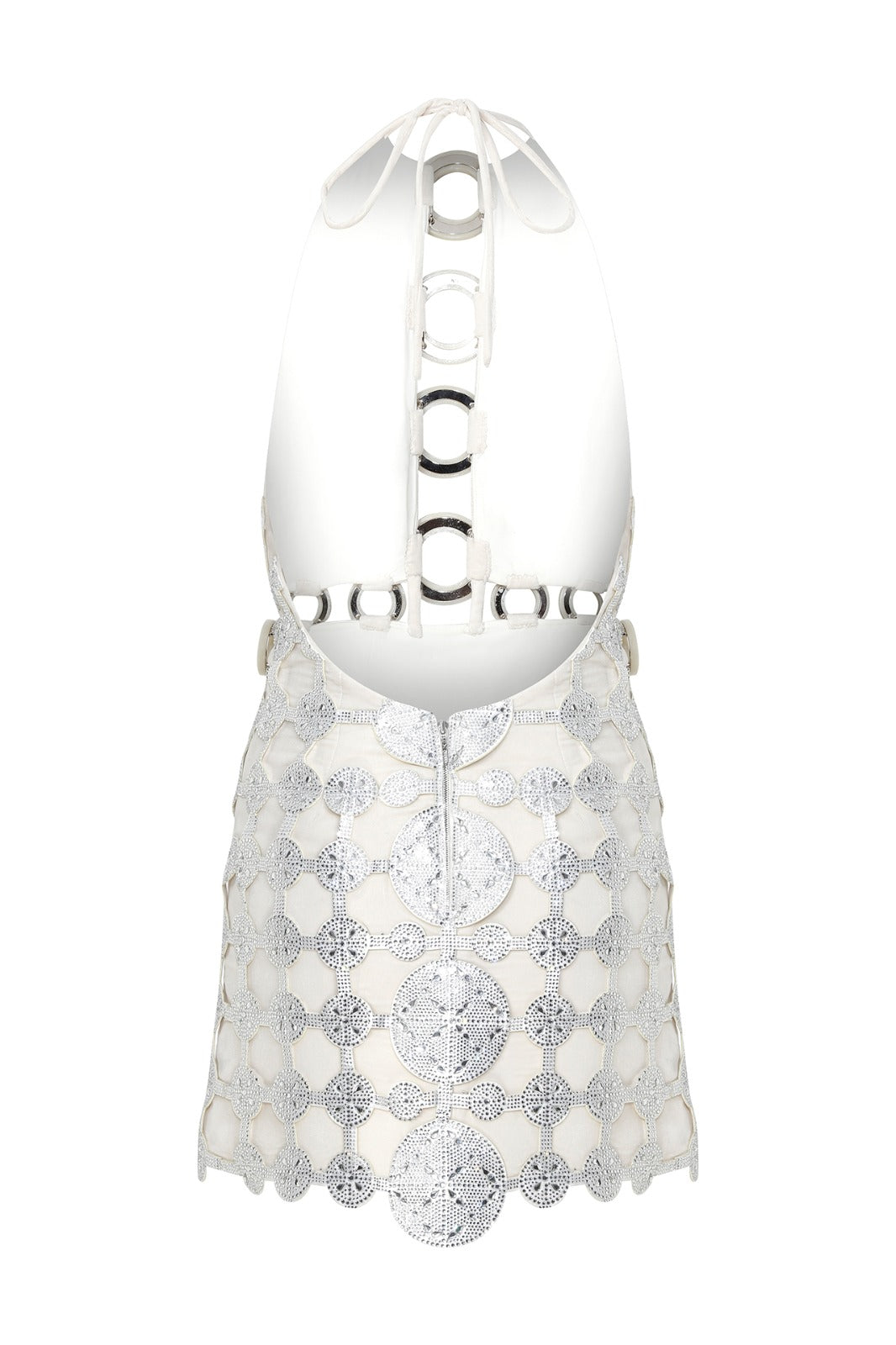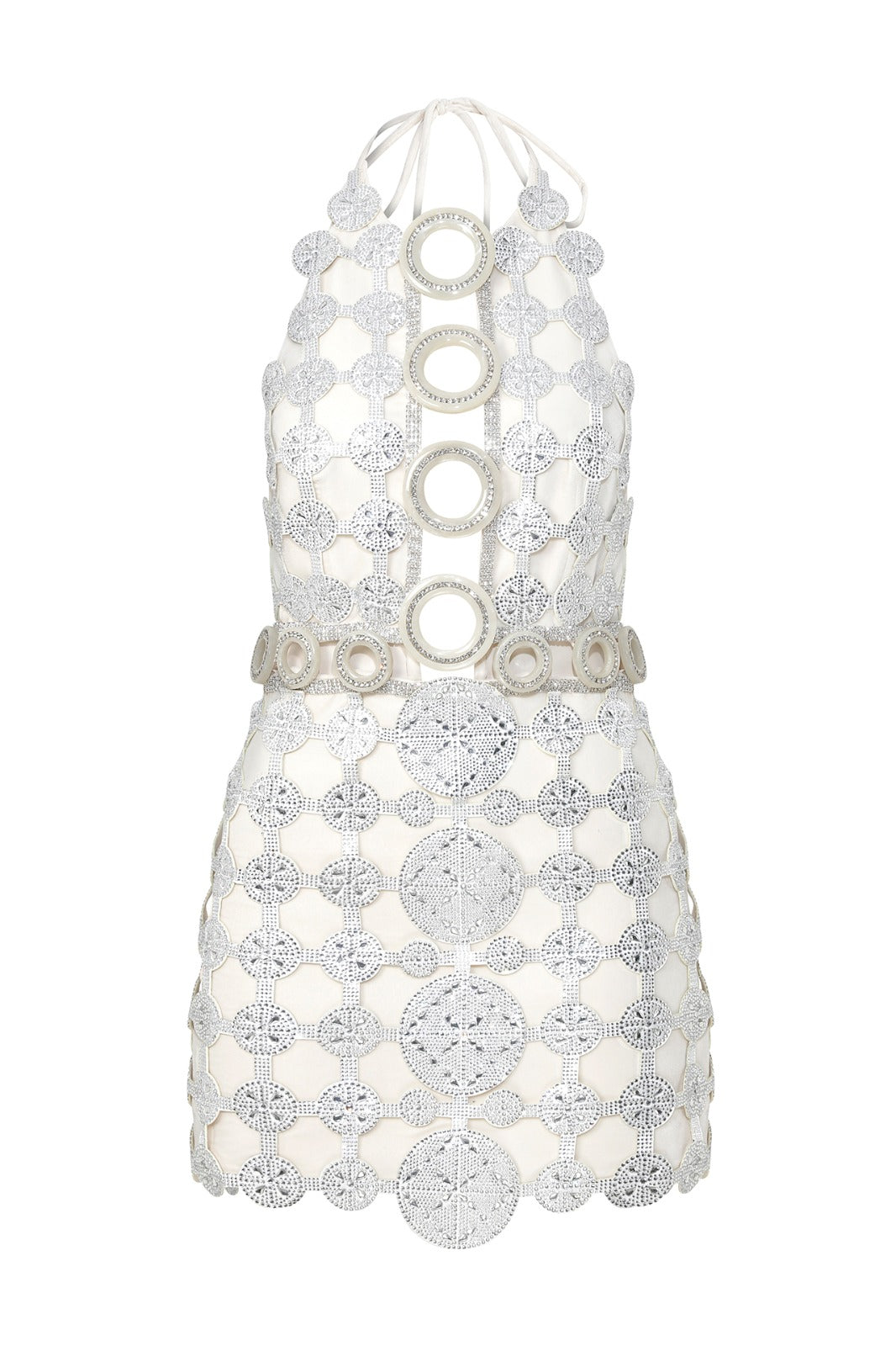 A halter-neck mini dress adorned with intricate crystal embellishments, defined by bold circular motifs and sculptural neckline details that exude modern glamour.