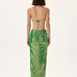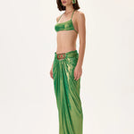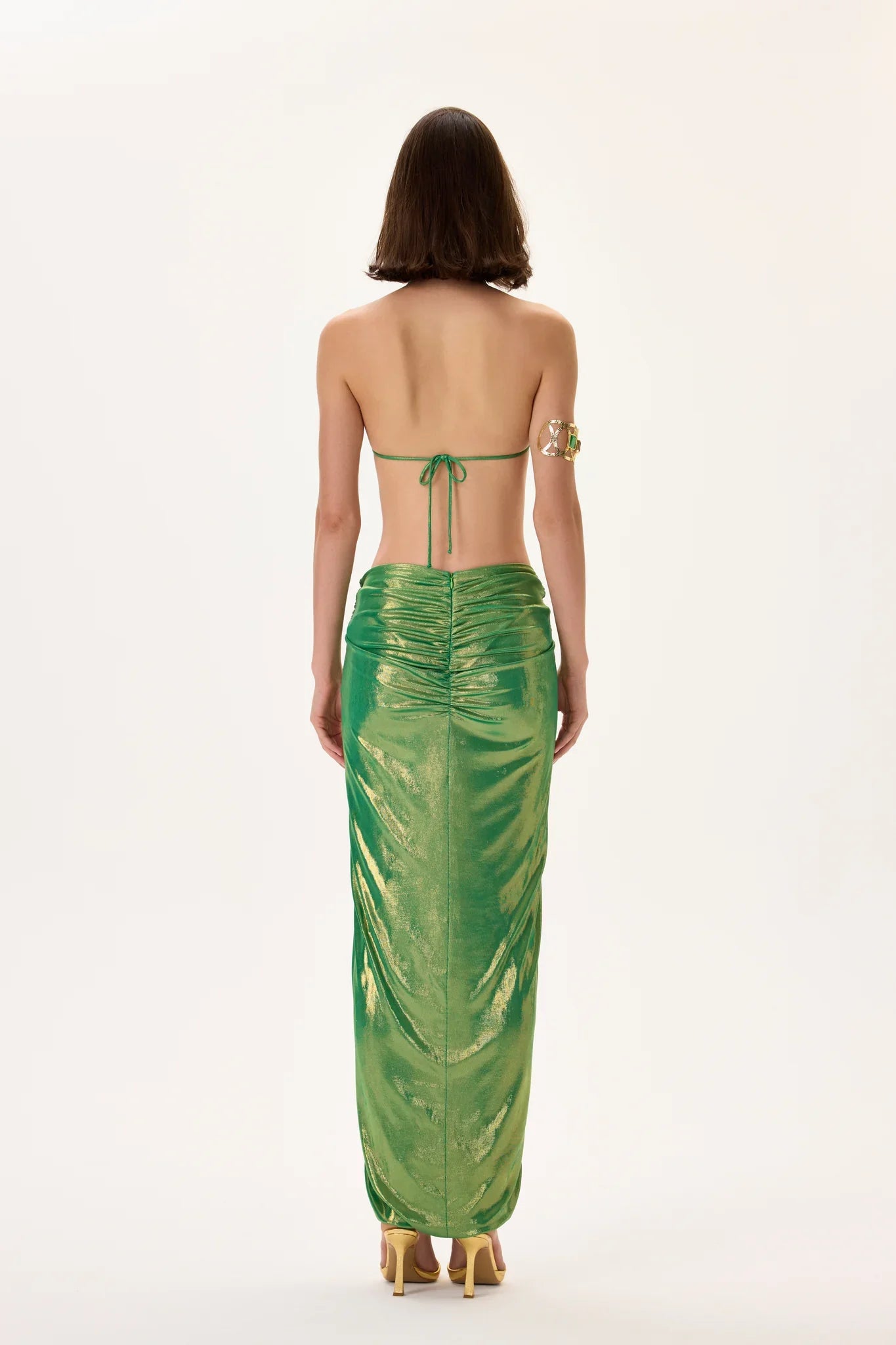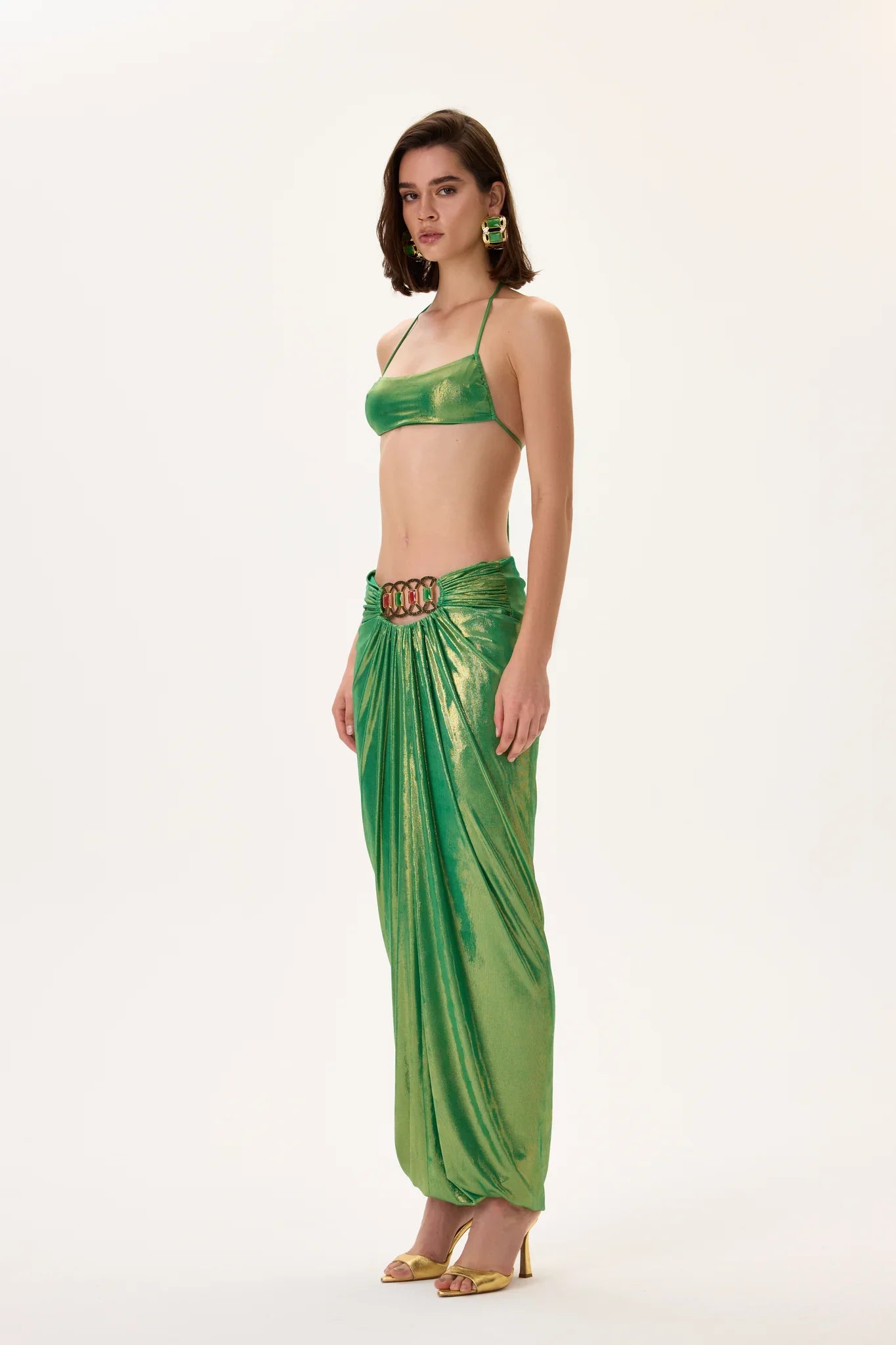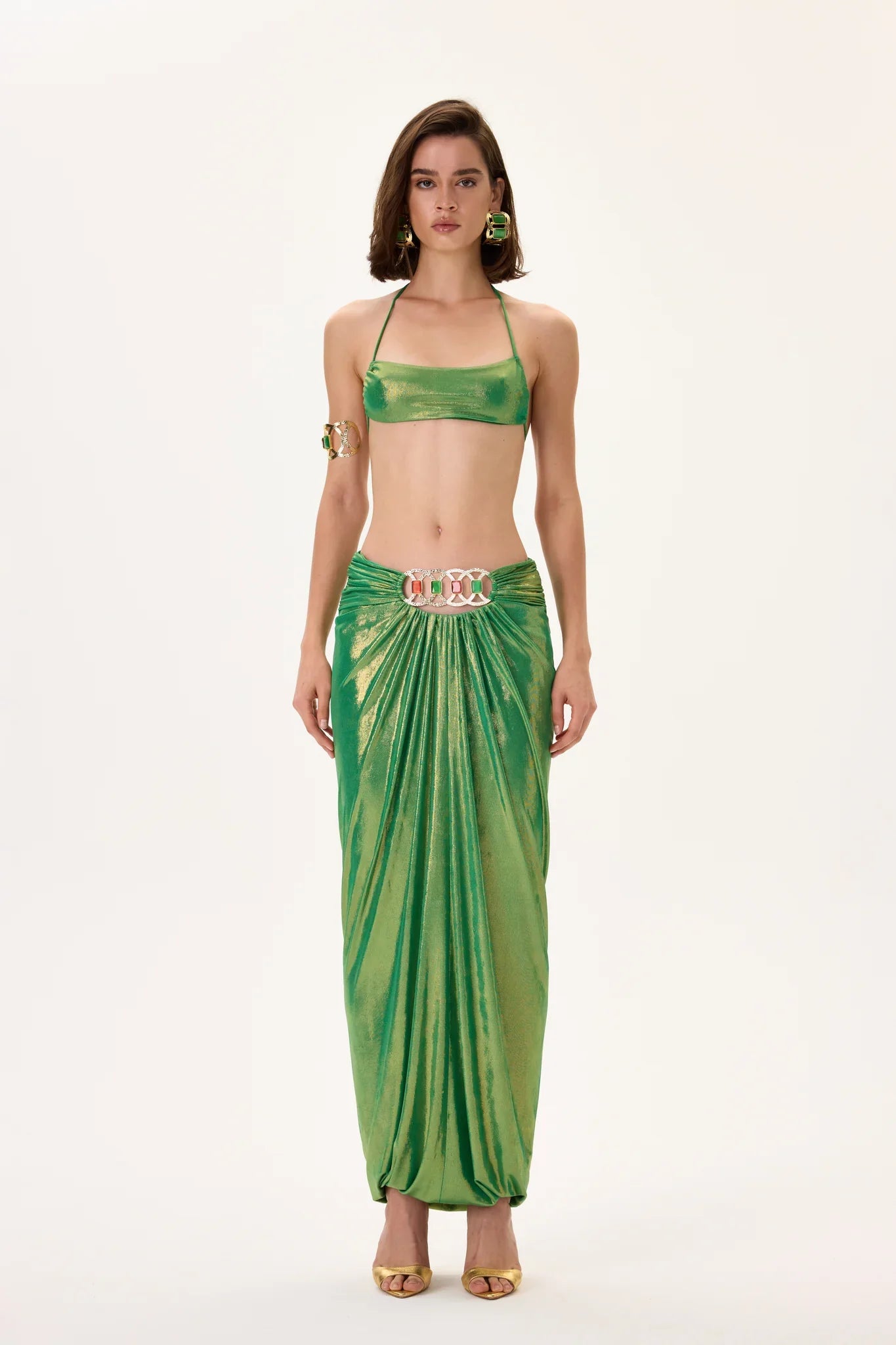 Elegant green metallic jersey balloon skirt designed with a gold accessory and ruched waistline for a sophisticated, voluminous silhouette. Perfect for high-end evening styling and coordinated sets.