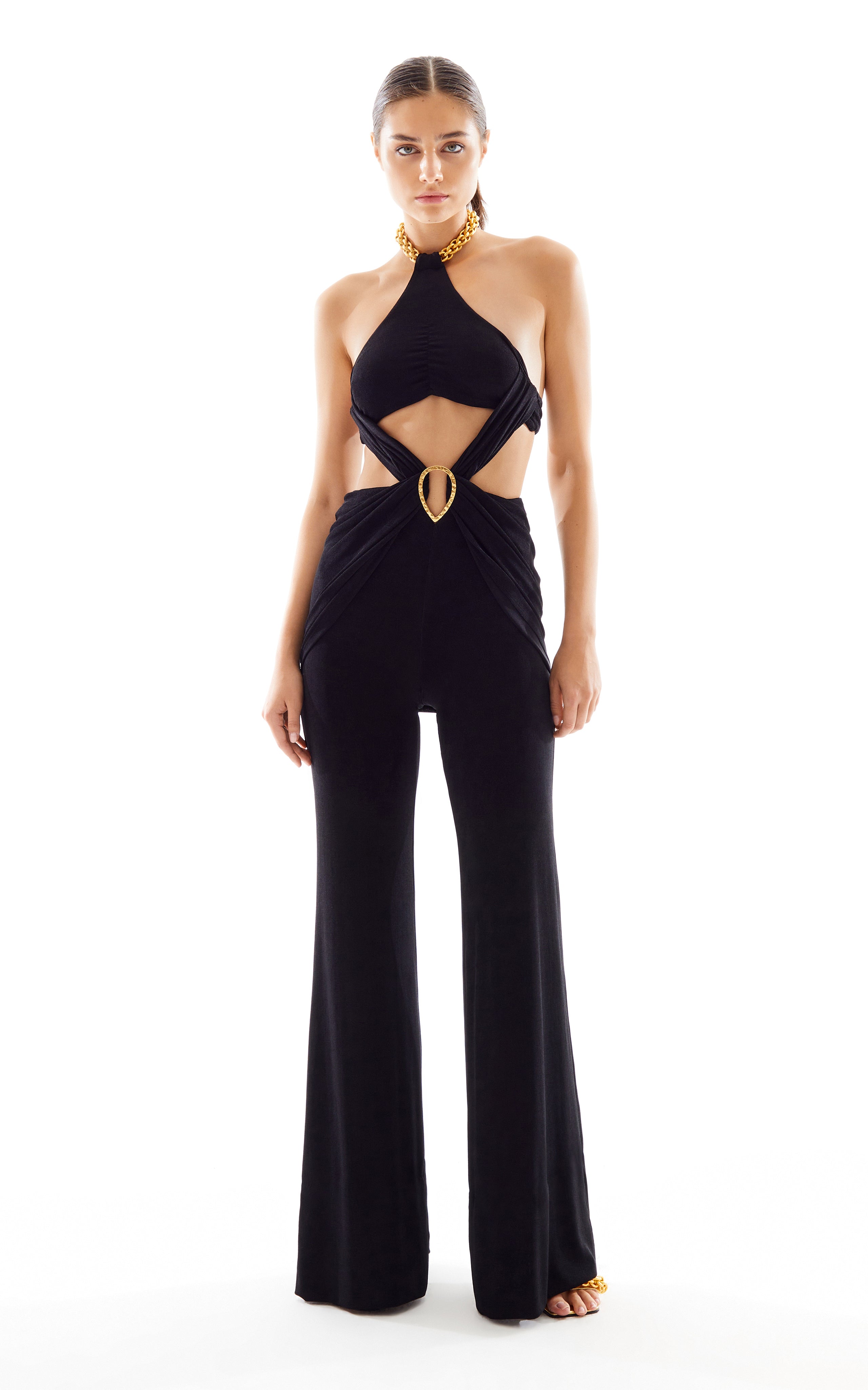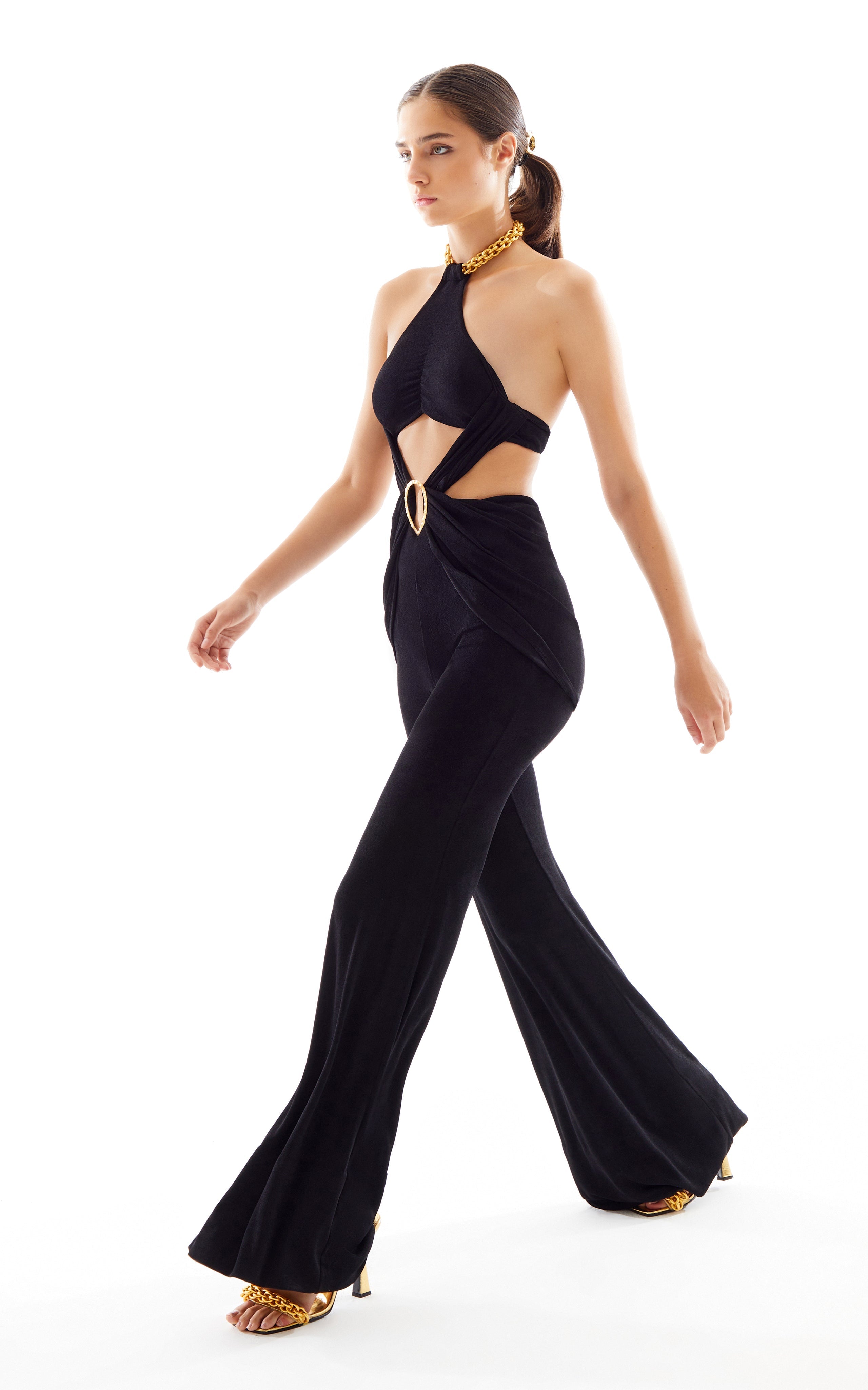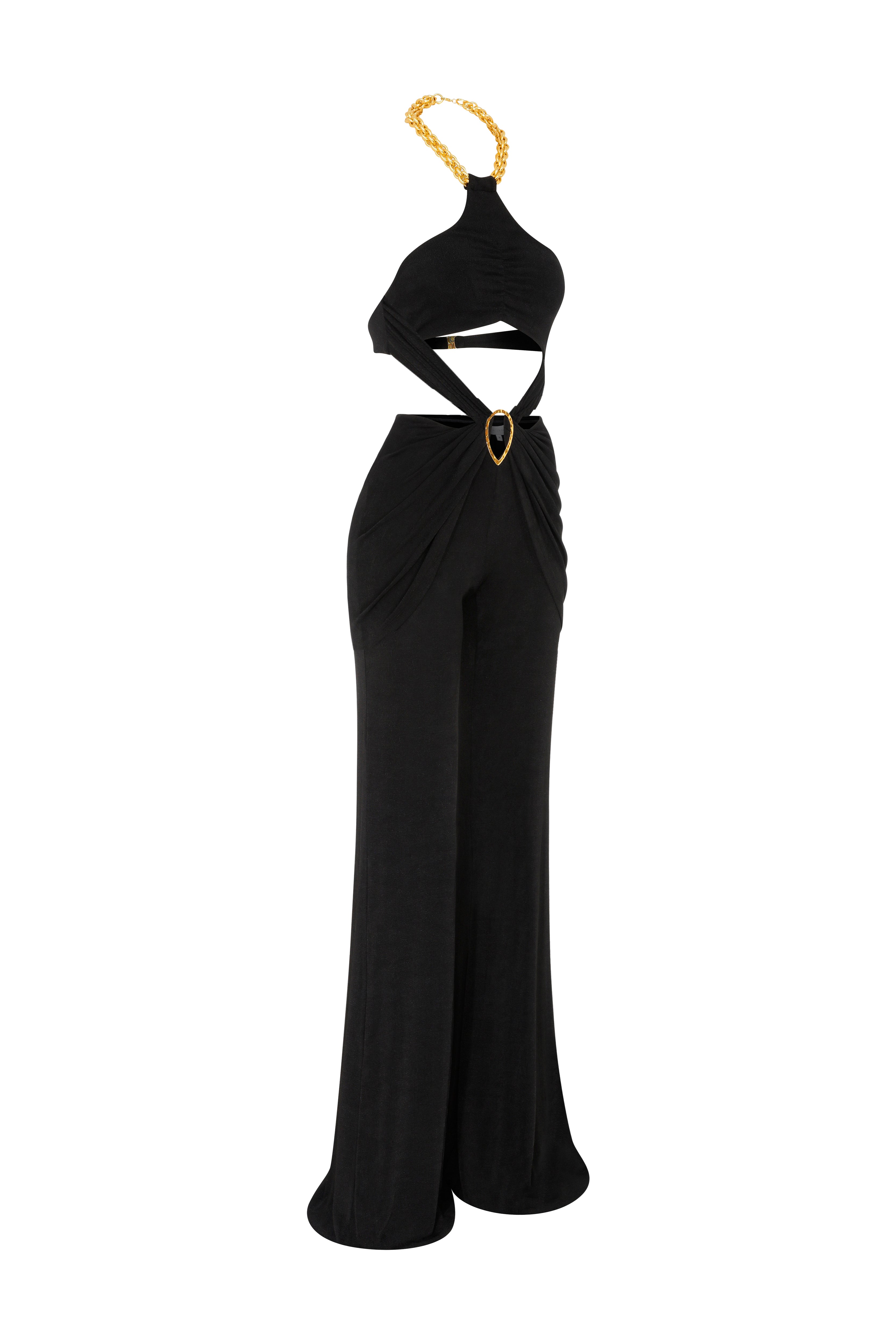 This jumpsuit is designed with gold accessories that add a luxurious look to the minimalist look.