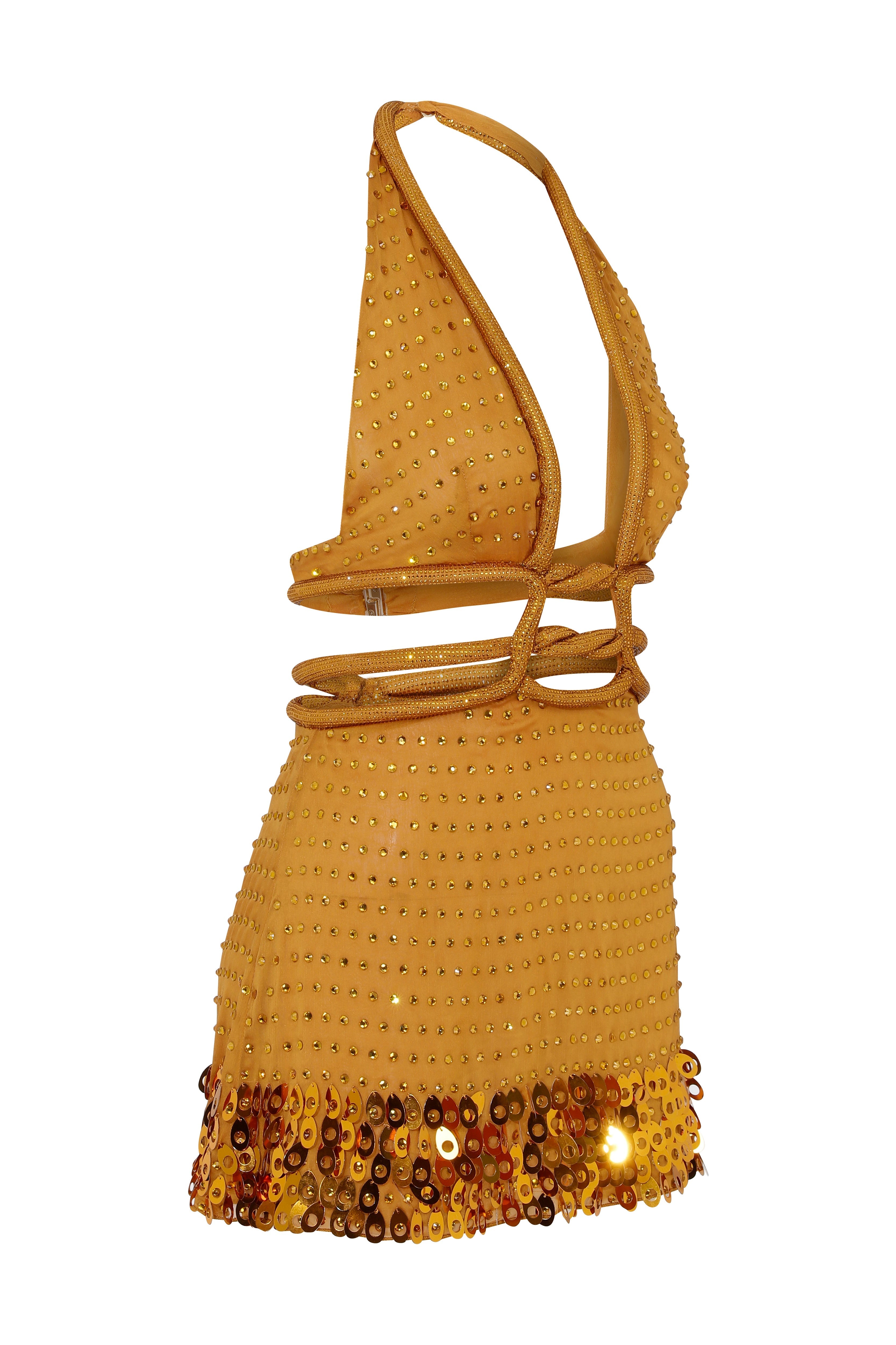 The backless mini dress decorated with sequins has a skirt finished with sequins.