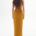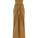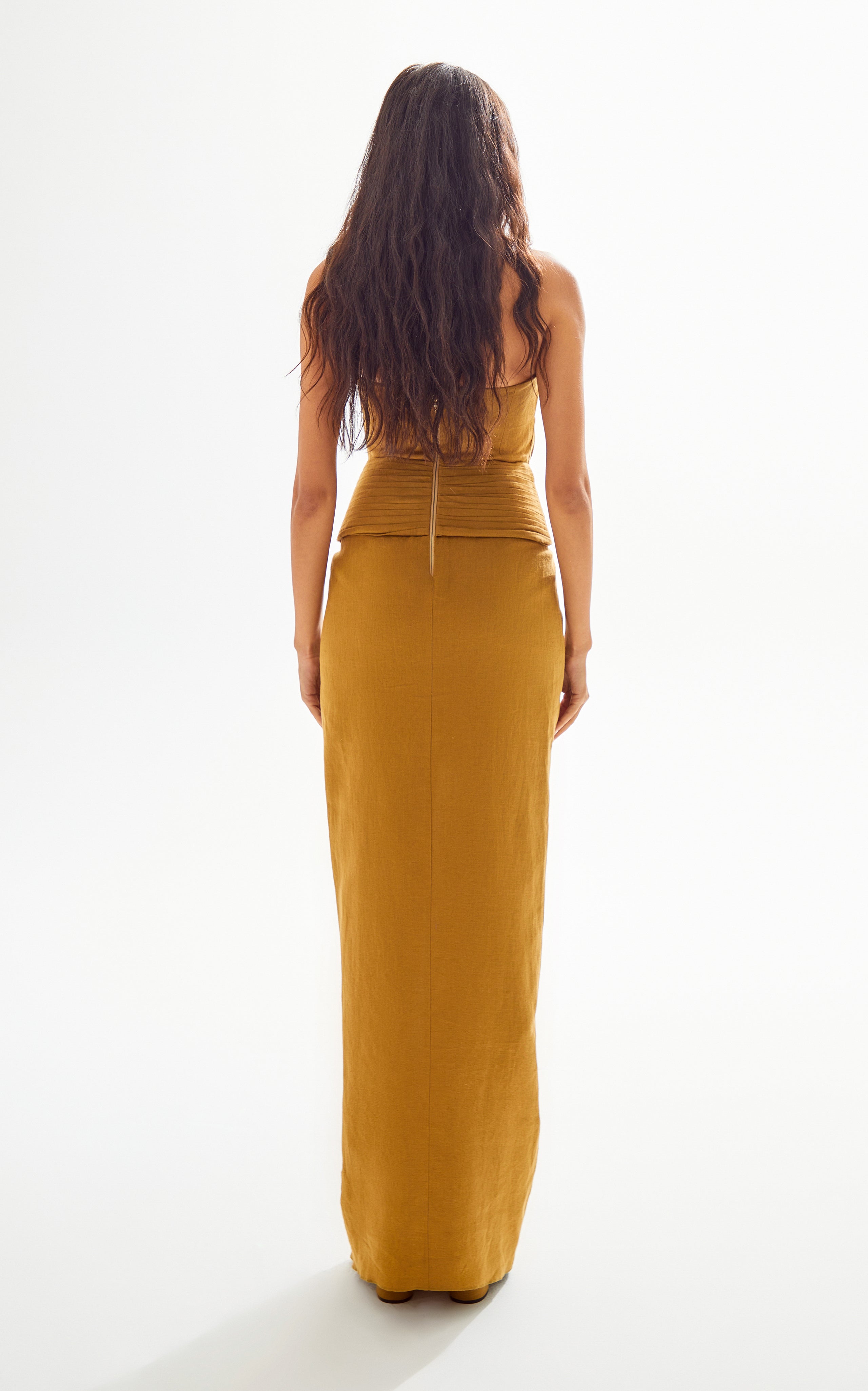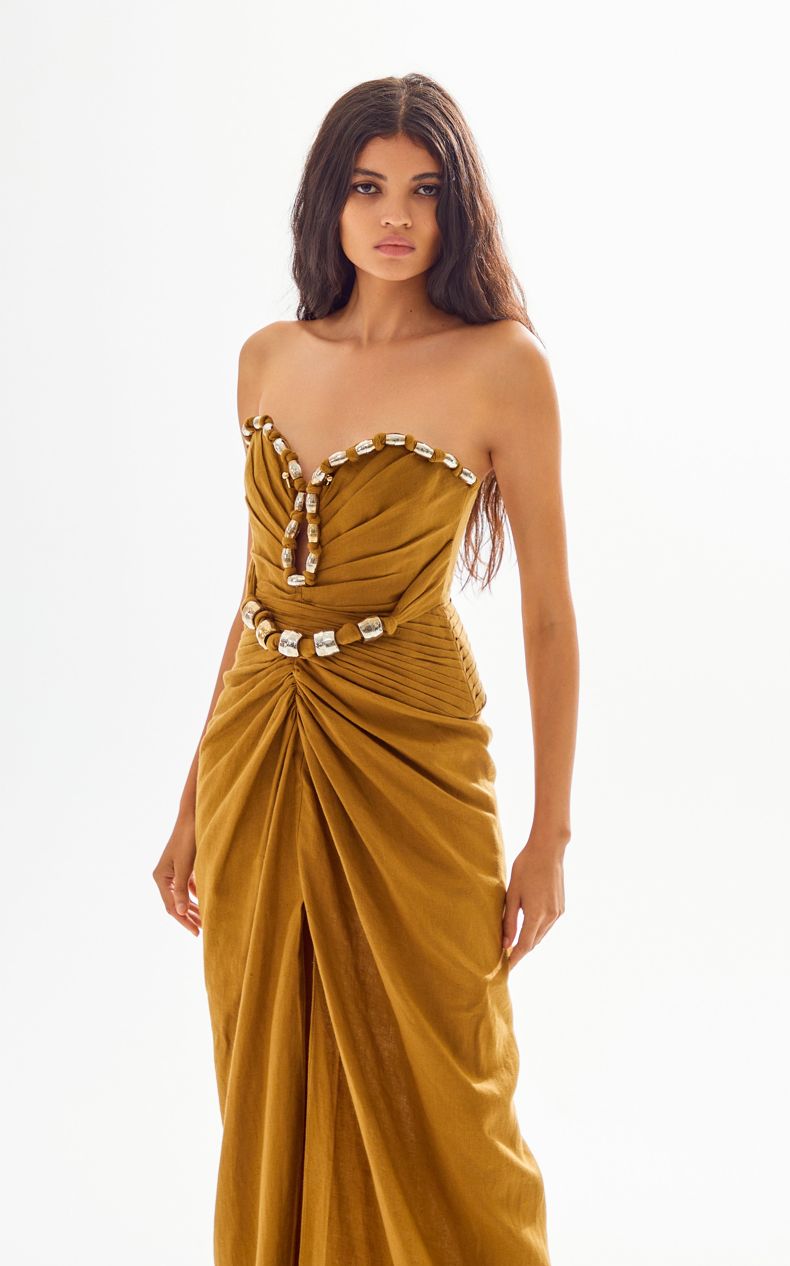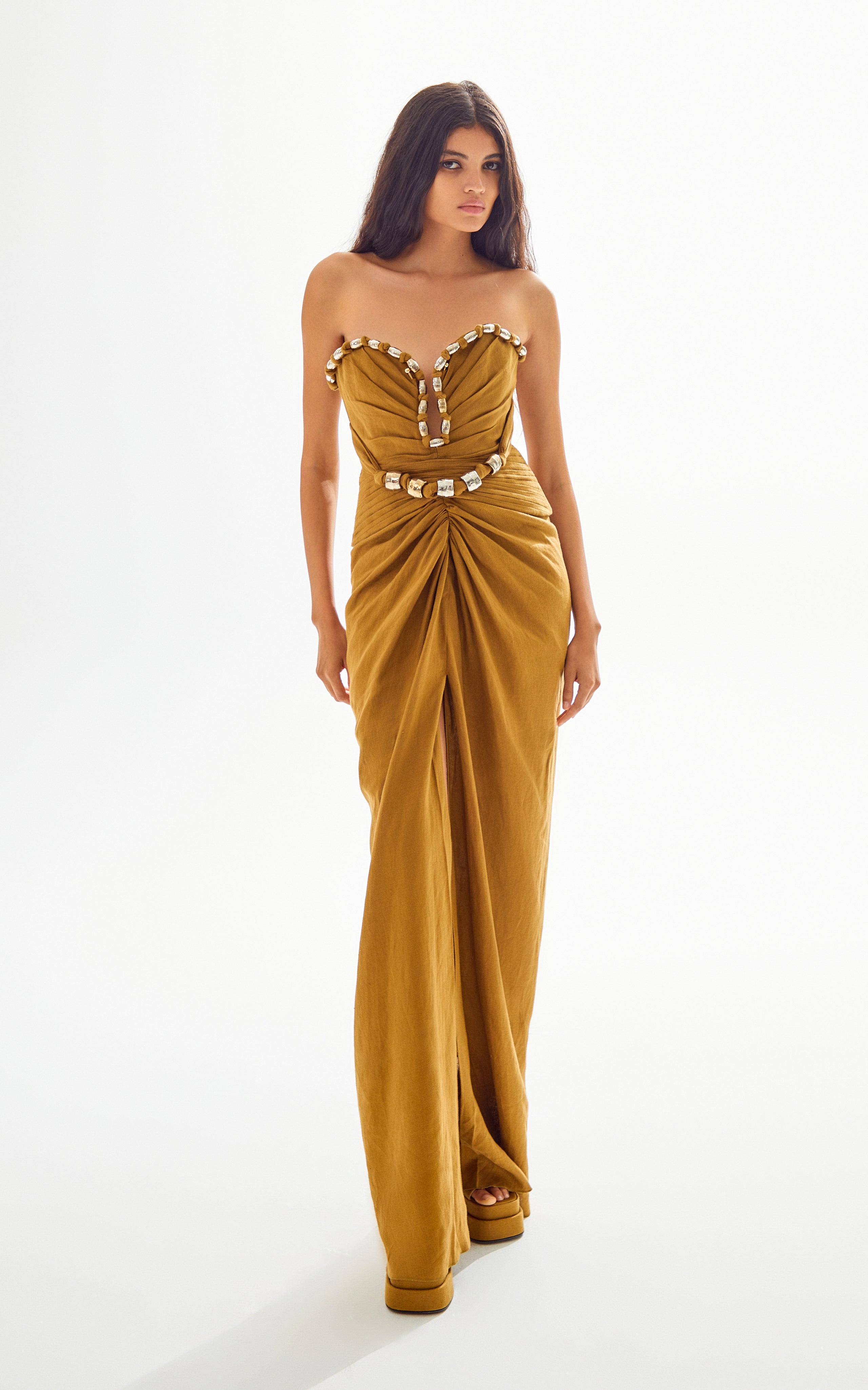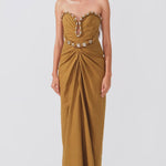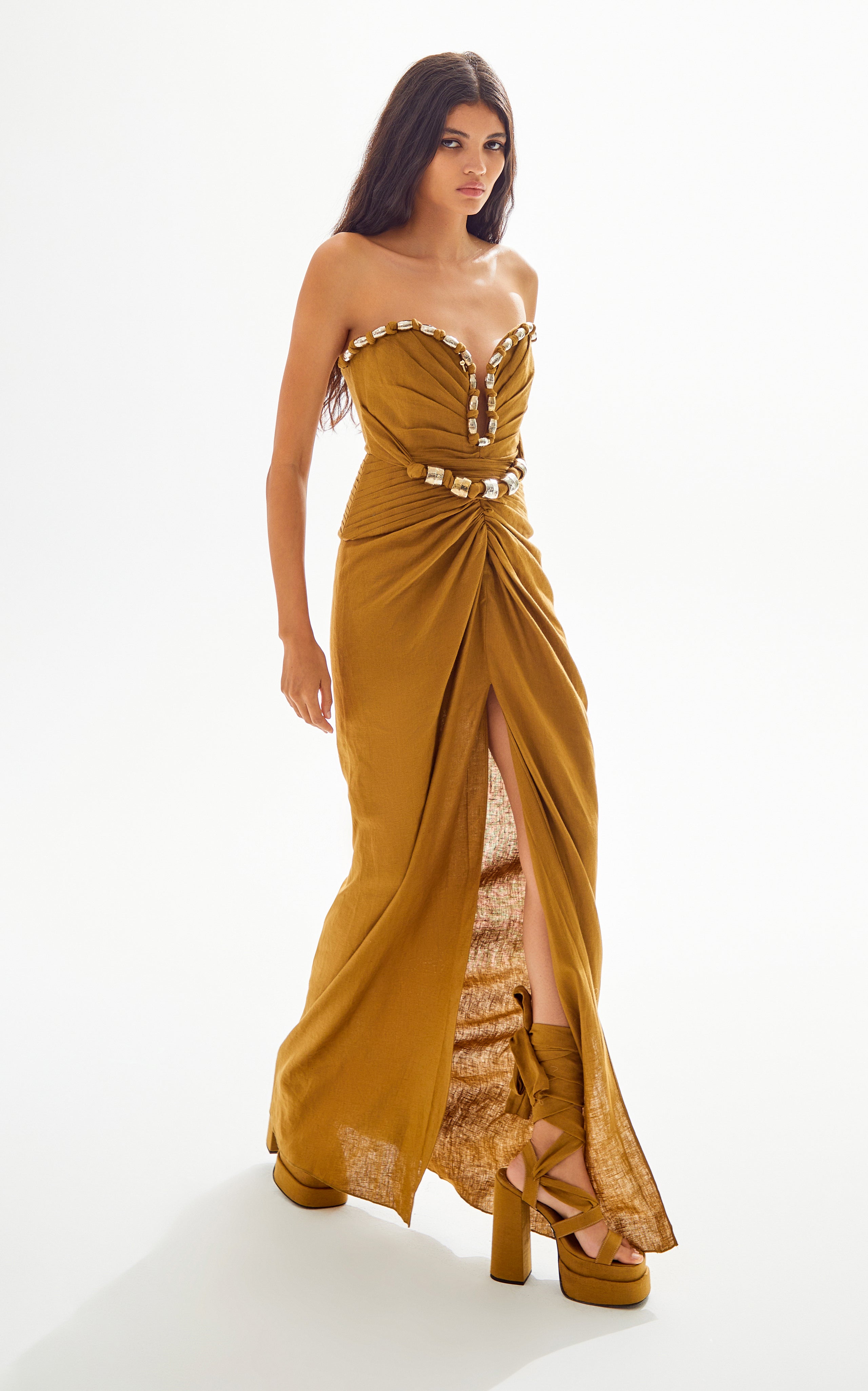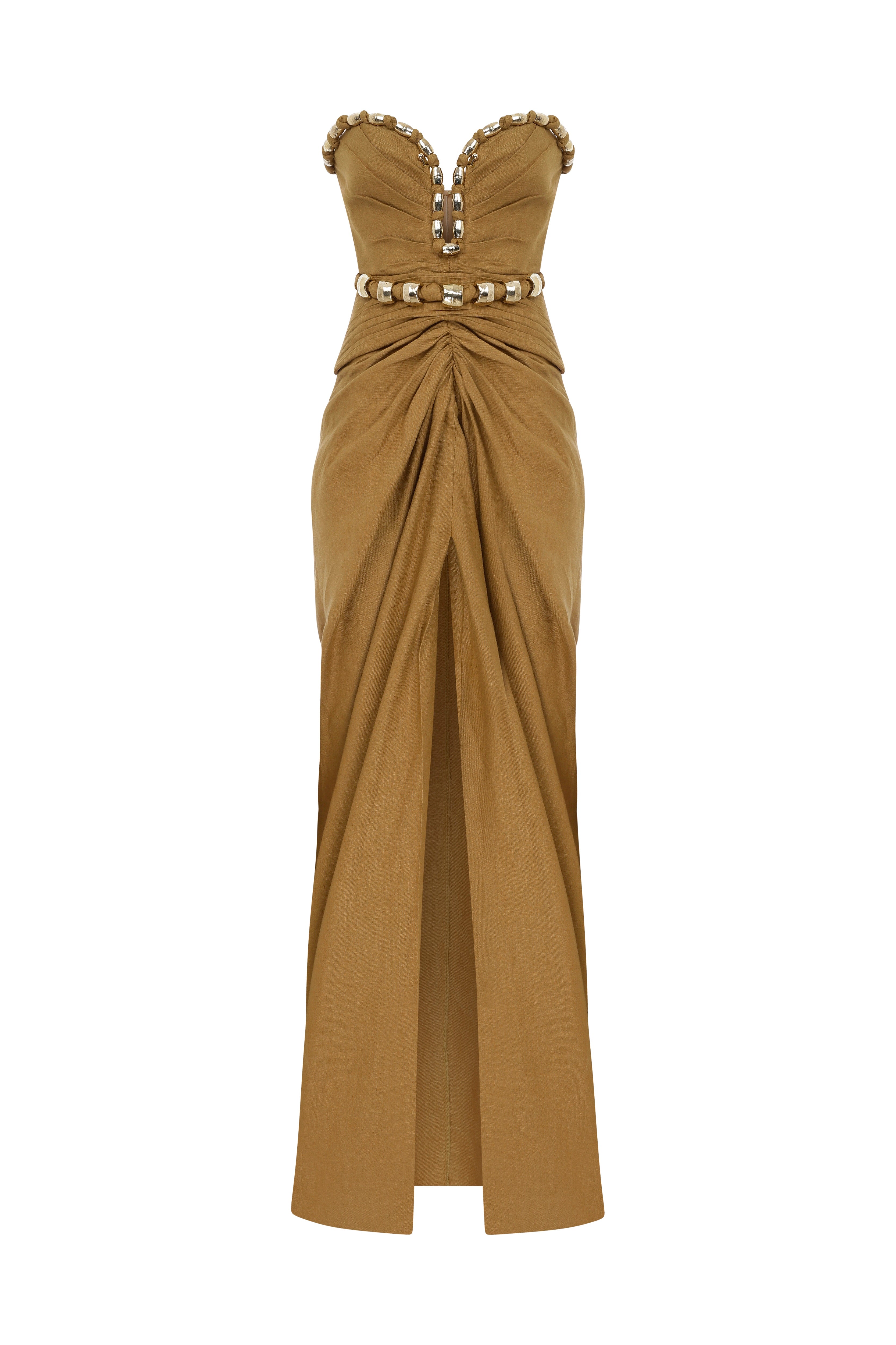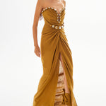 Heart Shaped Strapless Maxi Dress with High Slit and Gold Accessory Details
