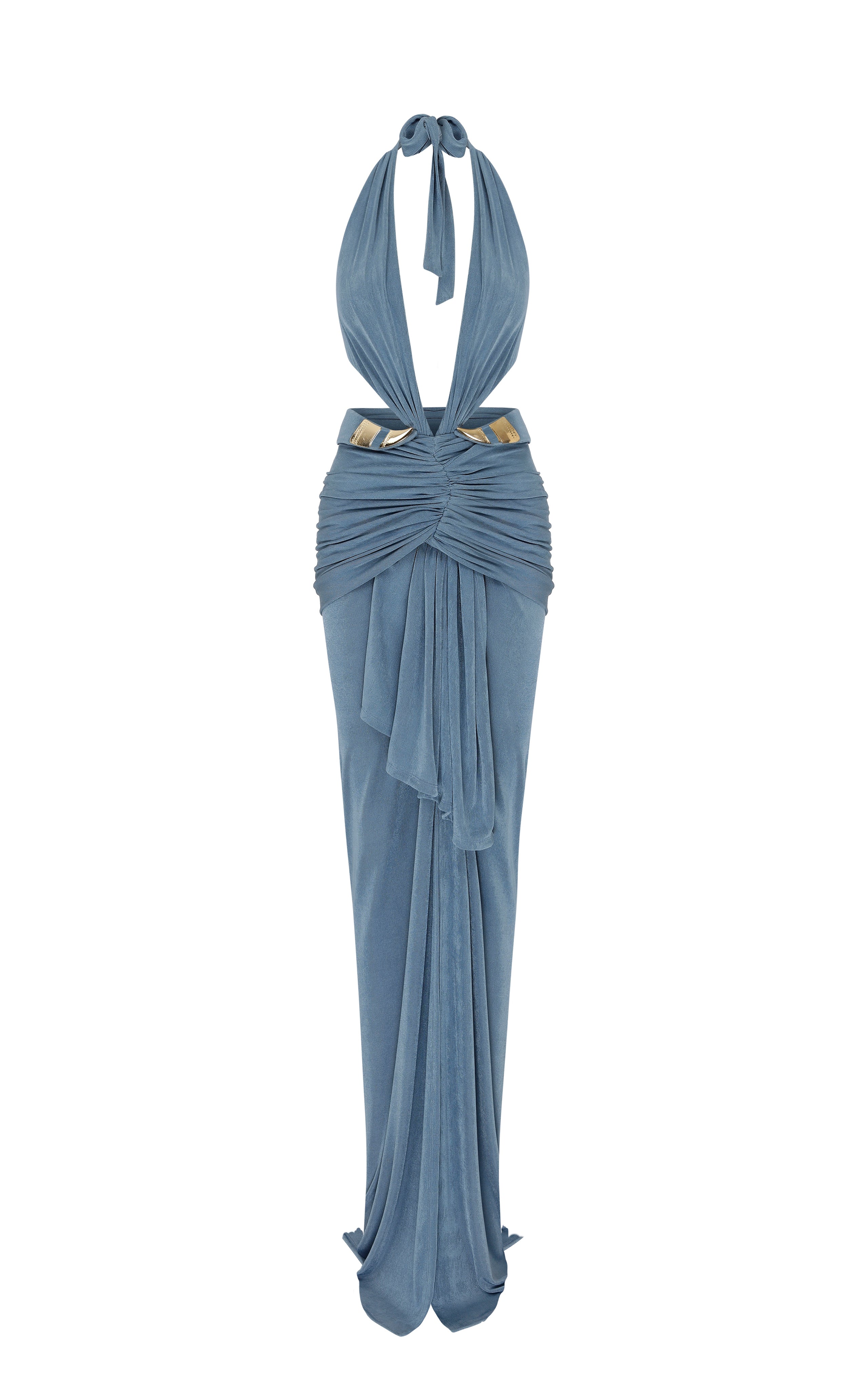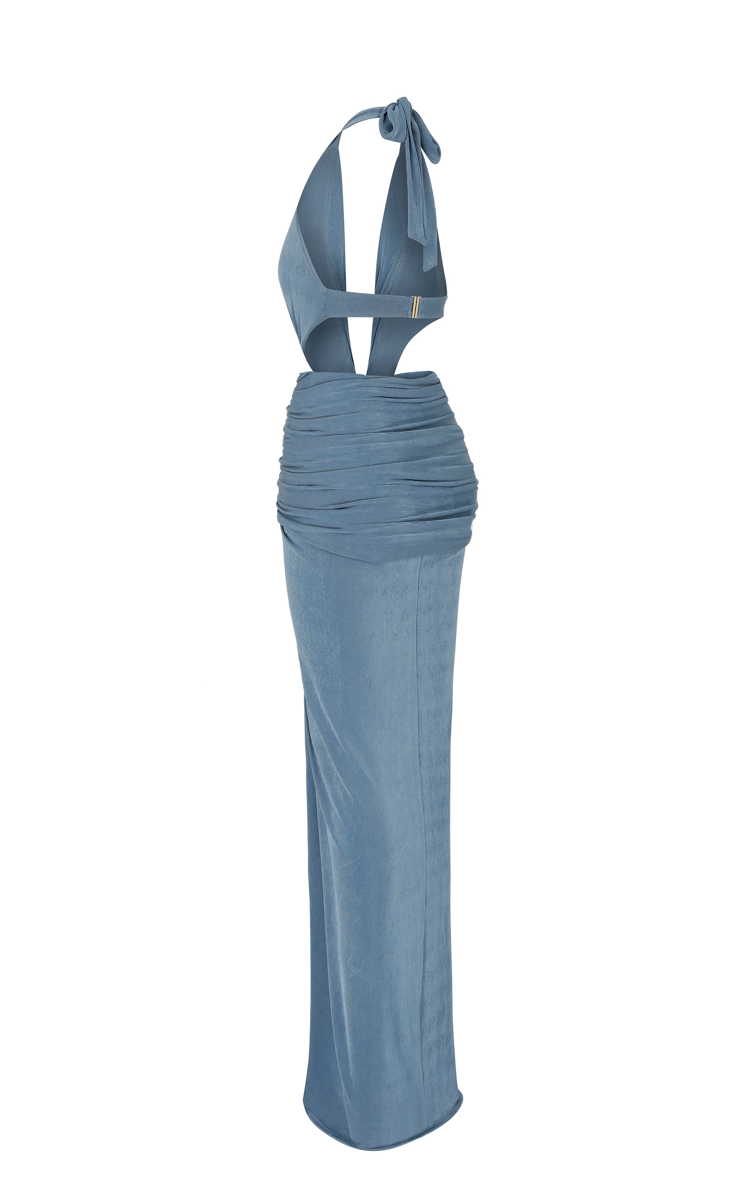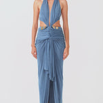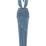 Indigo Buzzy V-neck Maxi Dress with Cutout and Gold Ivory Accessory Details